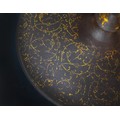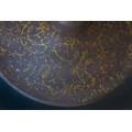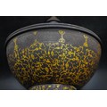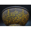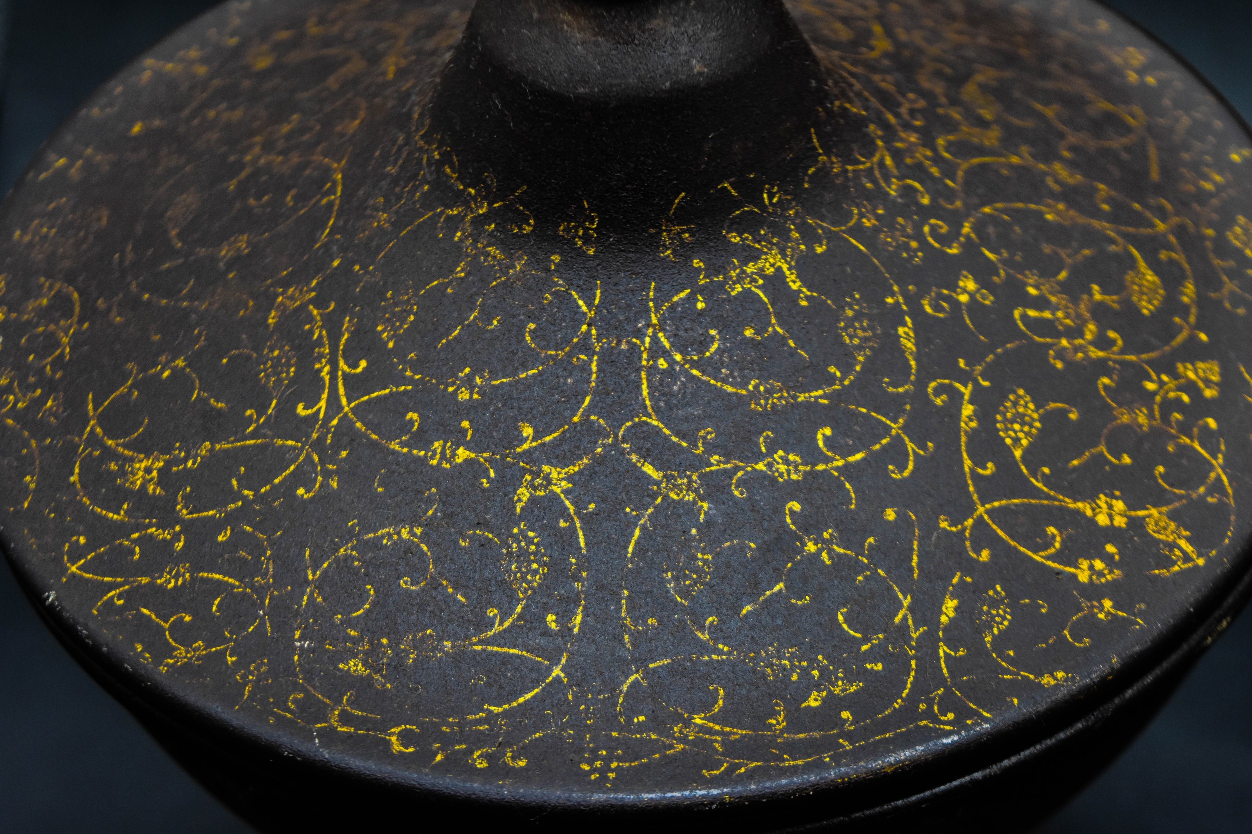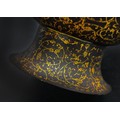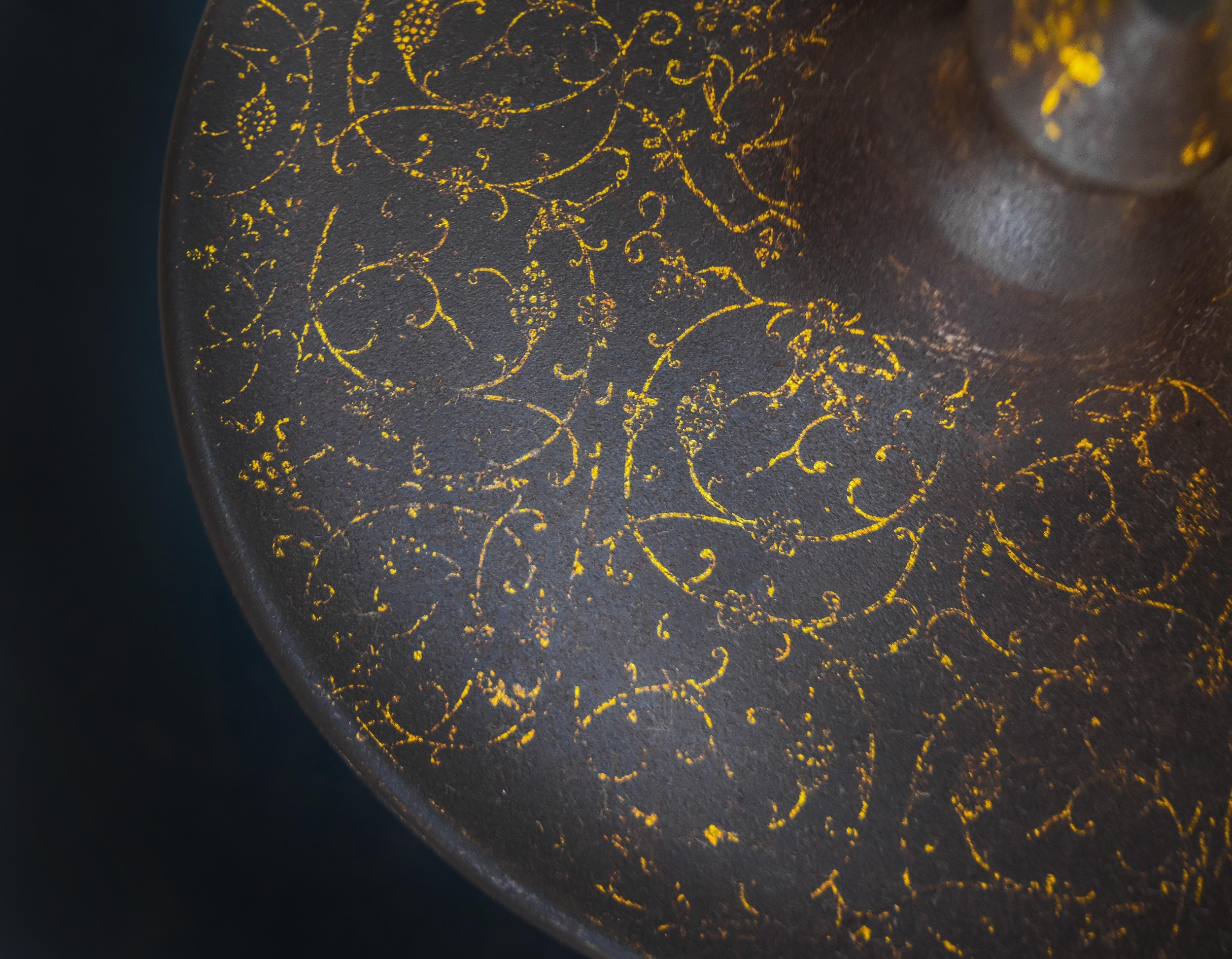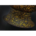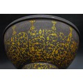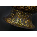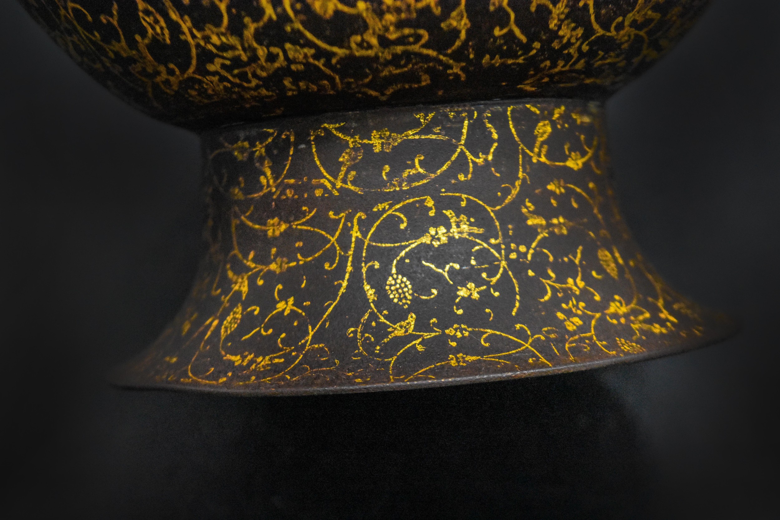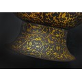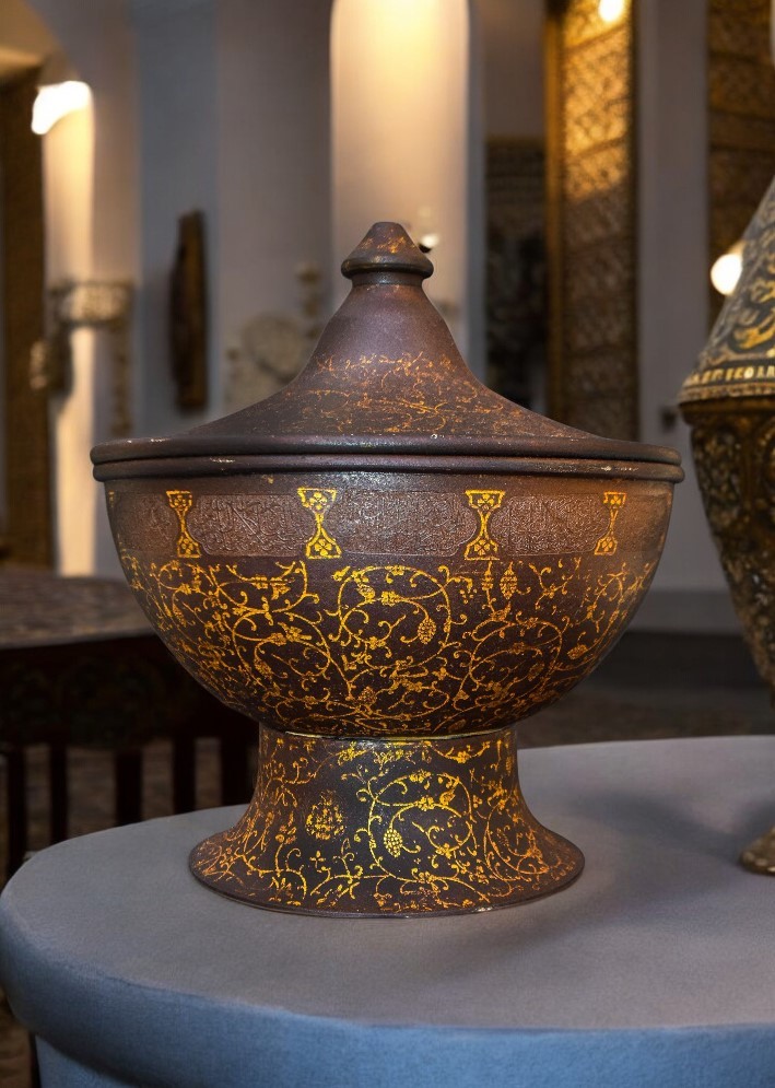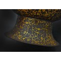 This exquisite 19th-century Qajar/Mughal lidded bowl showcases masterful gold kuftgari work—a fine metal inlay technique traditionally used to embellish royal arms and luxury objects. Crafted from metal, the surface is richly decorated with intricate floral arabesques and Islamic inscriptions meticulously chiseled and inlaid in gold around the body and lid.
