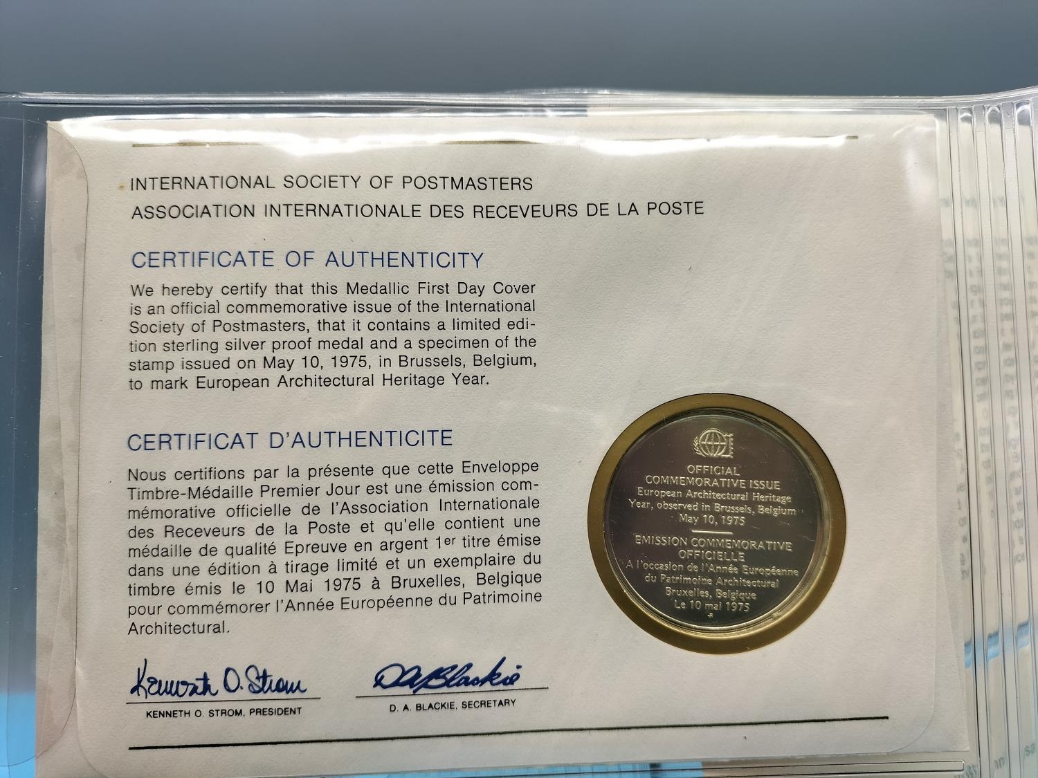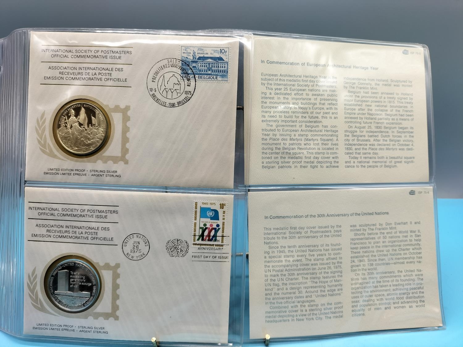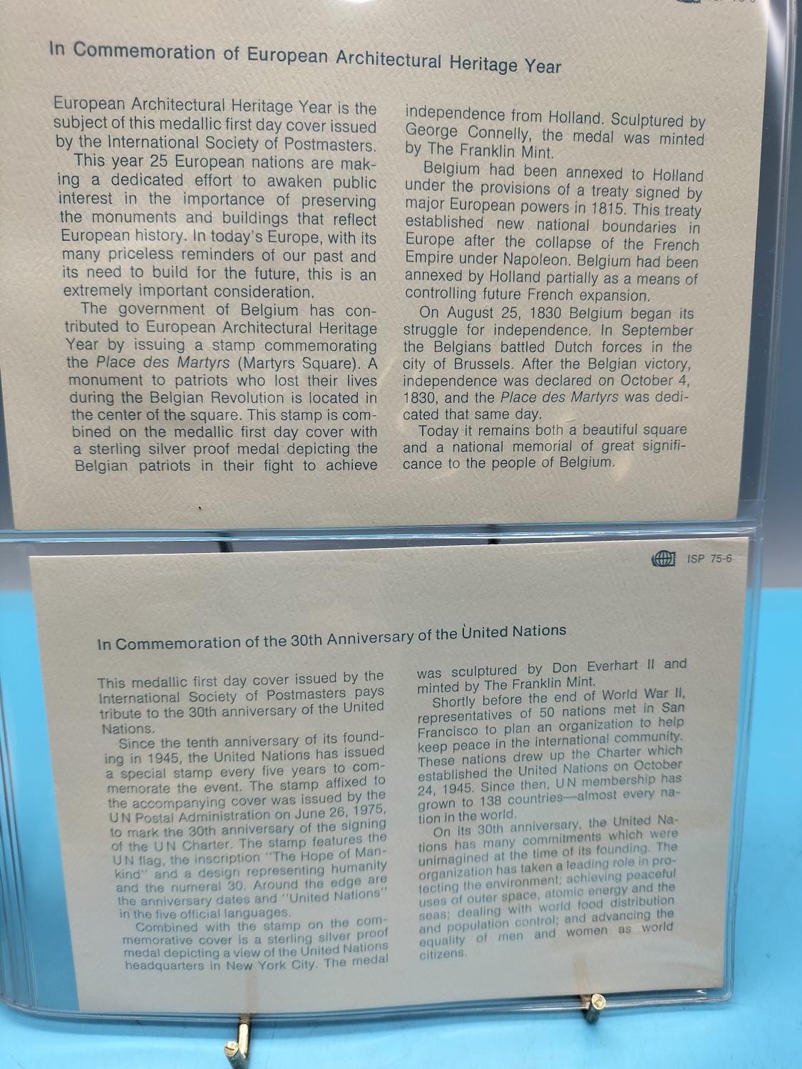 1975 International Society of Postmasters Official Commemorative Issue First Day Covers with Sterling Silver Coins (2) for 'European Architectural Heritage Year' and '30th Anniversary of the United Nations'.