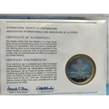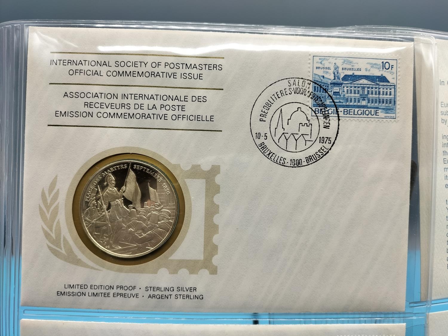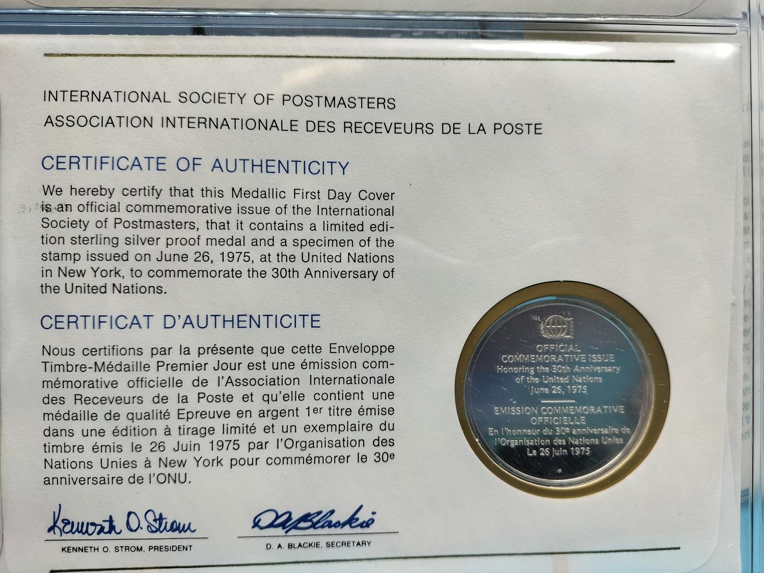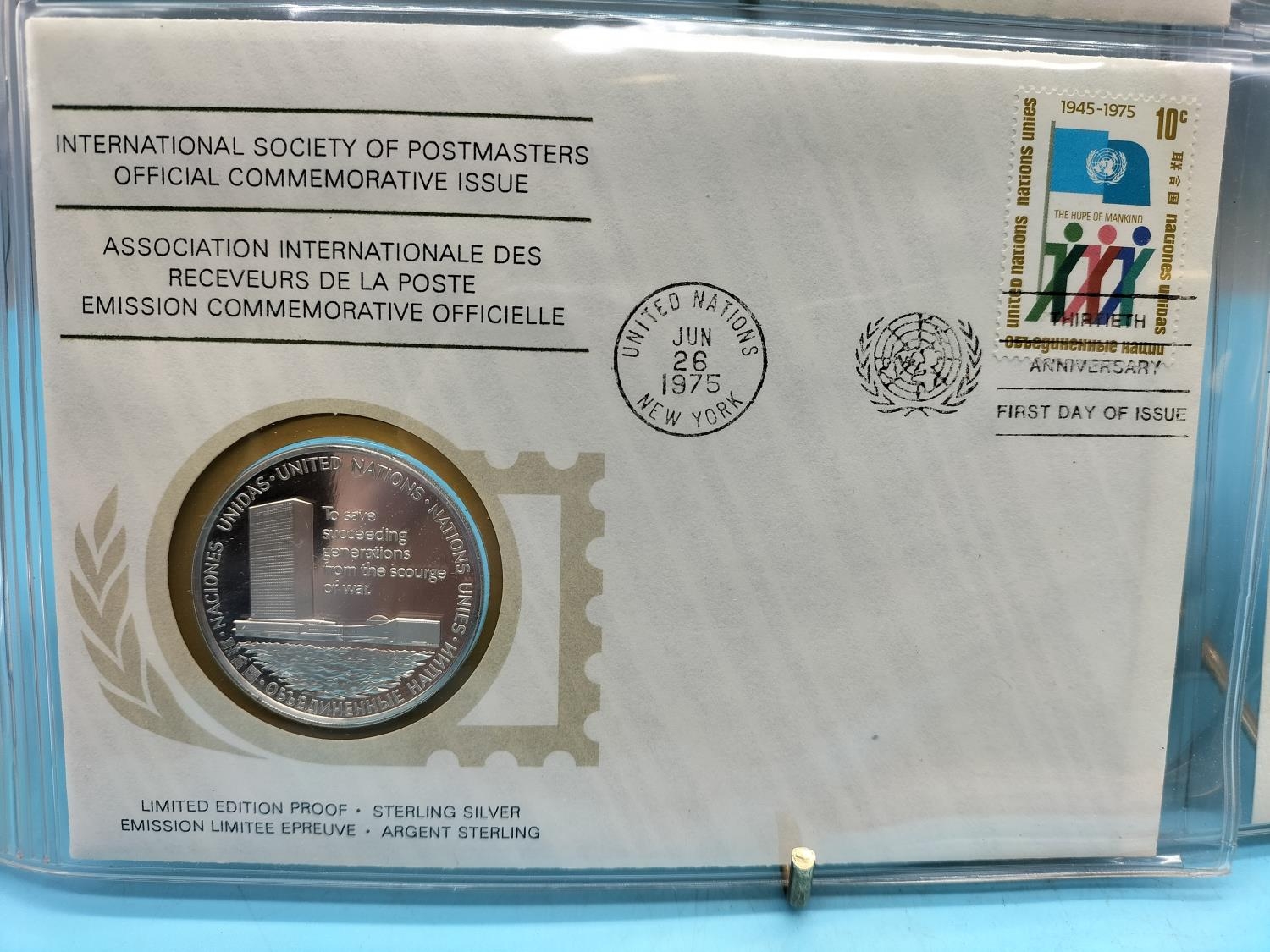 1975 International Society of Postmasters Official Commemorative Issue First Day Covers with Sterling Silver Coins (2) for 'European Architectural Heritage Year' and '30th Anniversary of the United Nations'.