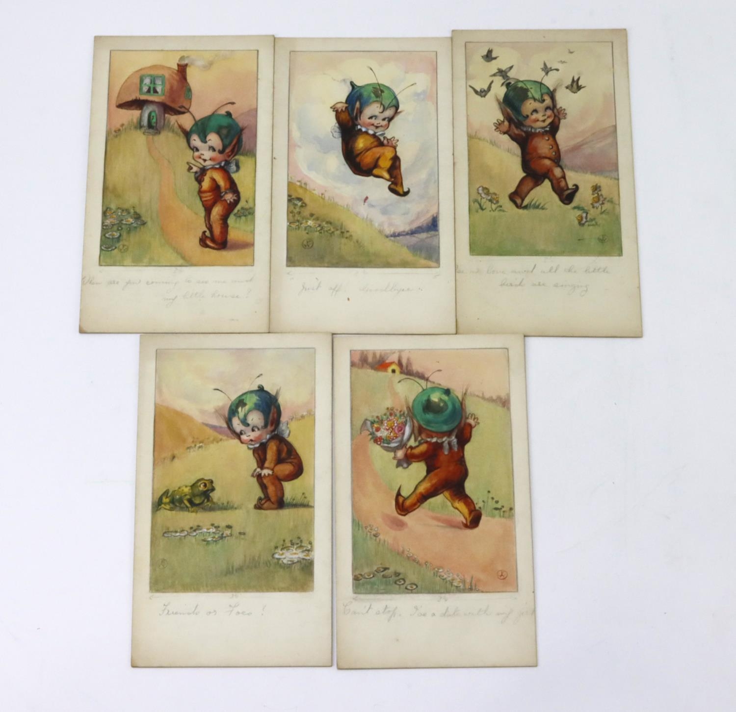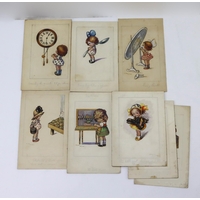 Flora White (20th century) original artwork for postcards, on board, PIXES - Just off, I'se in love, Friends or foe, Can't stop & When are you coming, approx 13cm x 24cm. (5)