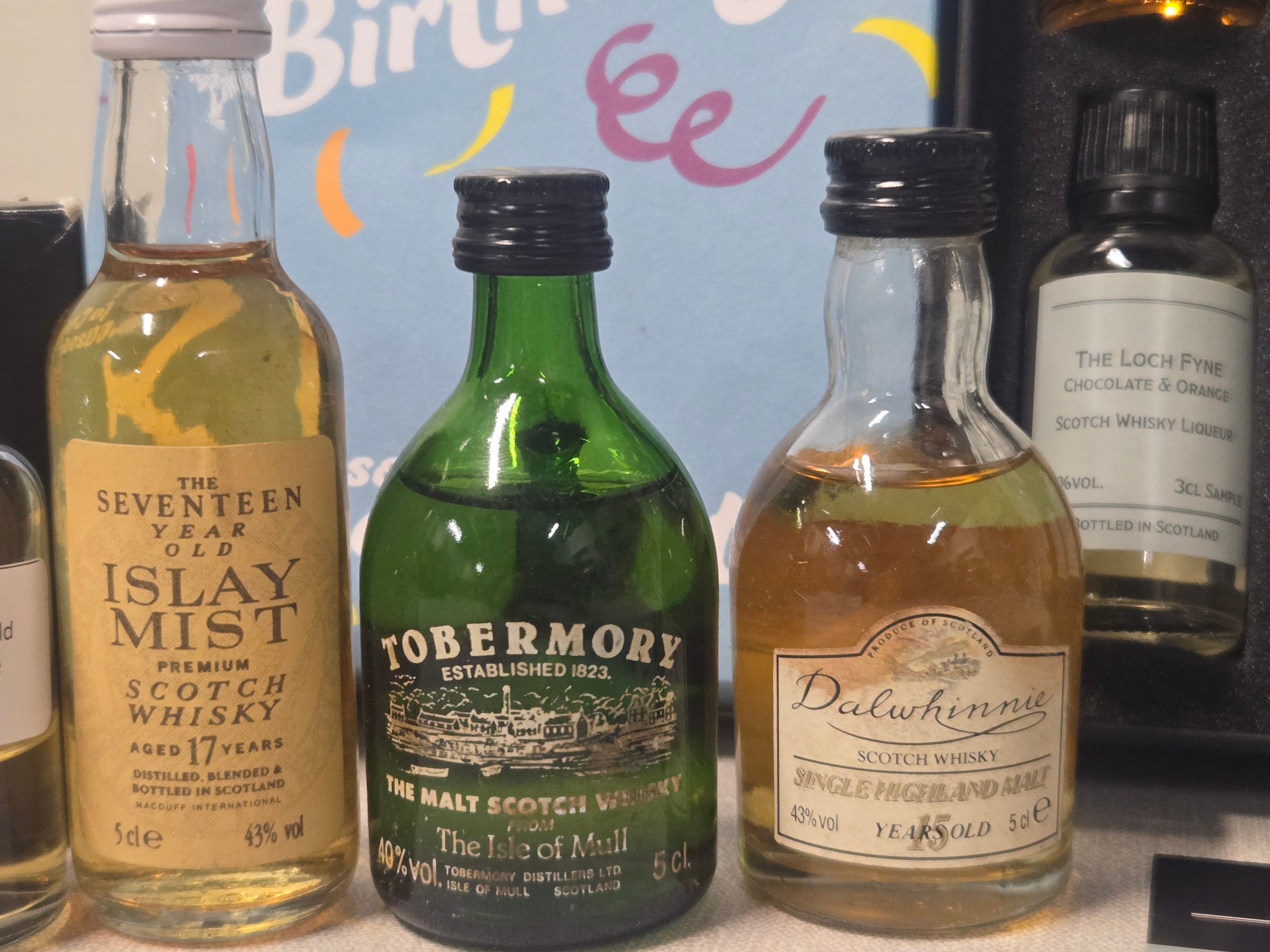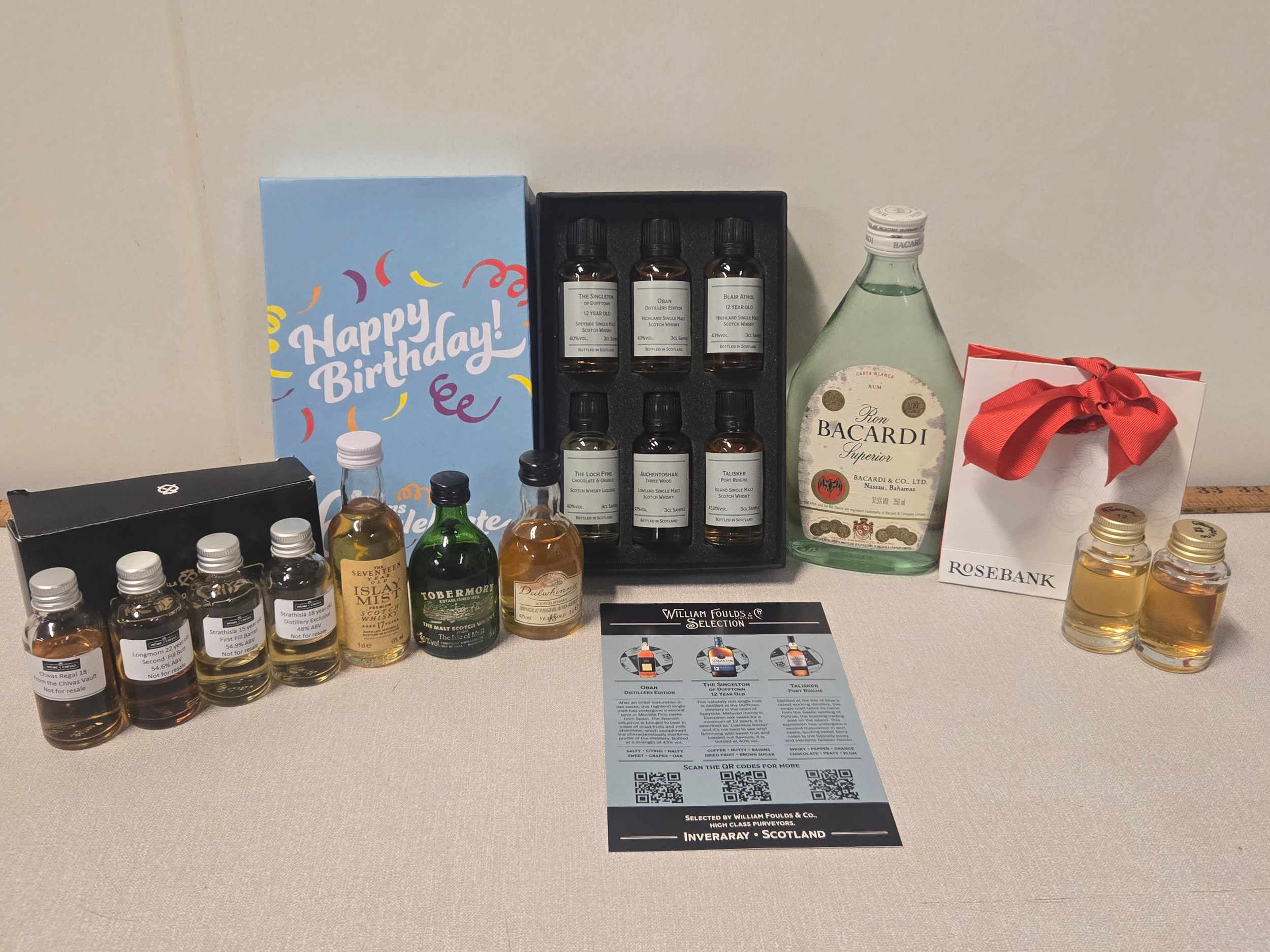 Selection of miniature whisky to include boxed Full & sealed William Faulds Selection of 6 to include Auchentoshan, Blair Athol etc, Vintage Full & Sealed 17 Year old Islay Mist, Tobermory & Dalwhinnie, 4 Home of Chivas (opened) & Rosebank Tasting bottles Tamdhu 12 & Glengoyne, along with full & sealed vintage Bacardi 35cl.