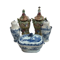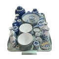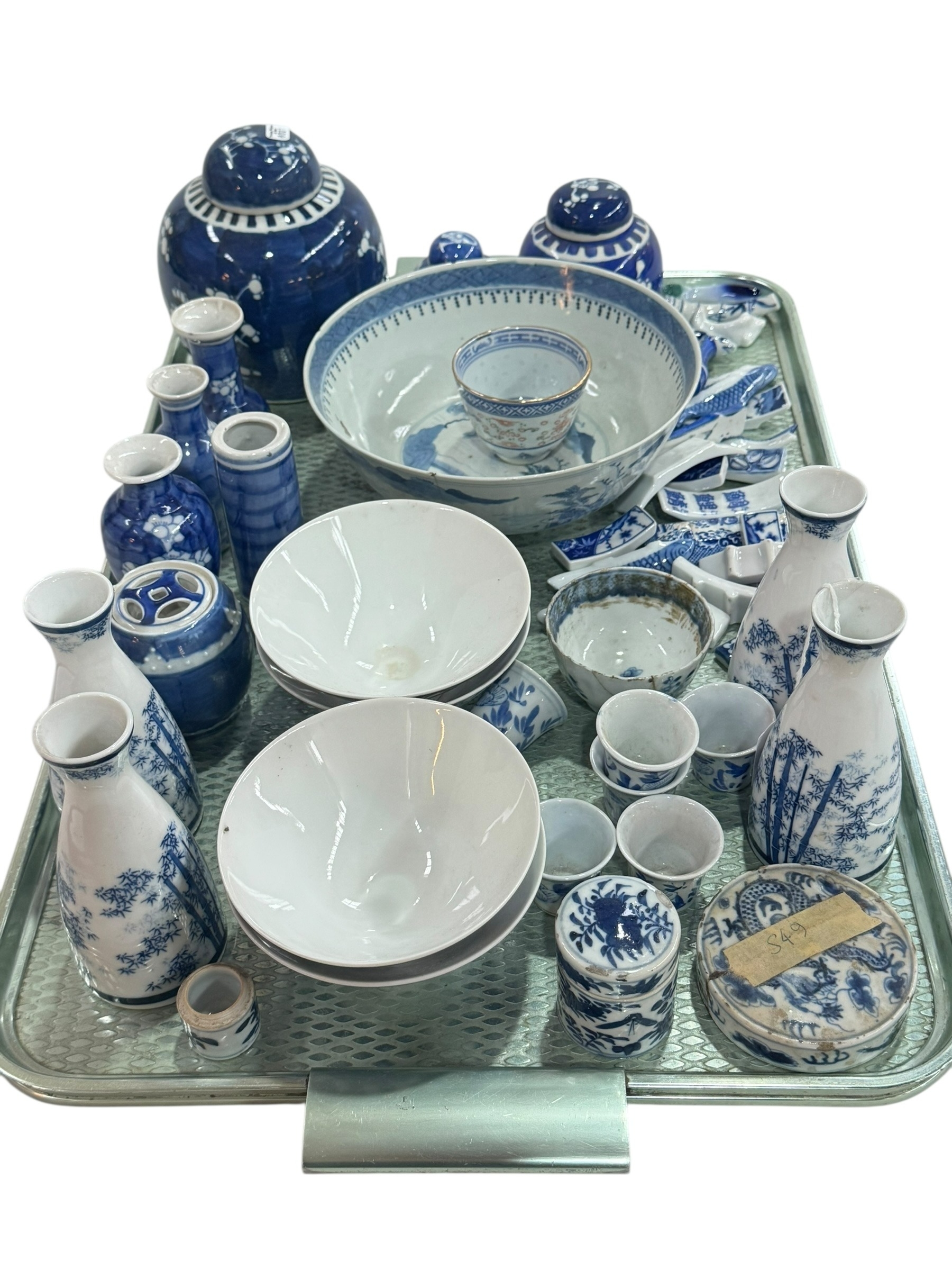 Collection of Oriental blue and white china including Chinese prunus ginger jars and vases.