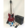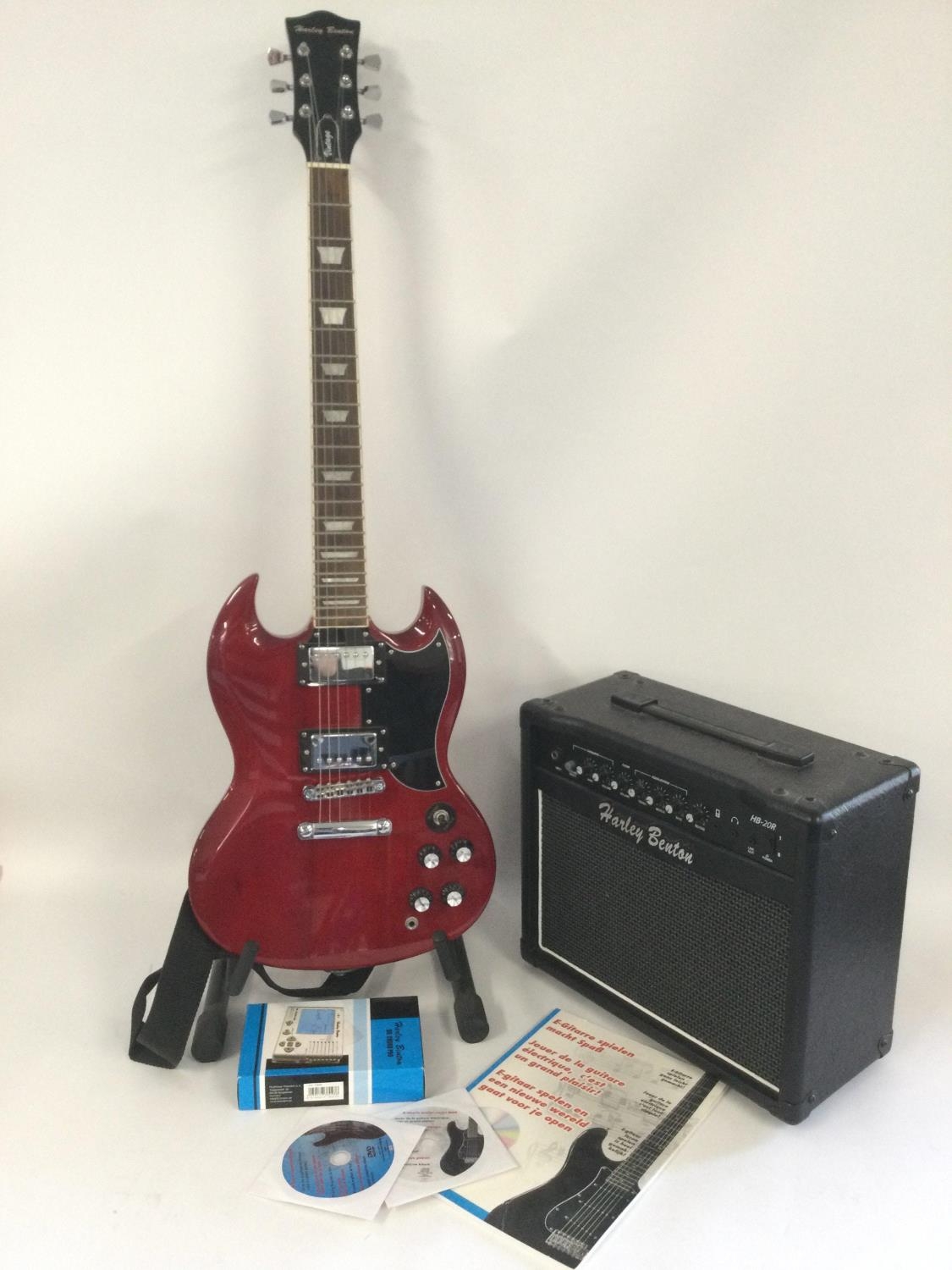 A Harley Benton SG style electric guitar with a Harley Benton HB-20R amplifier, stand, carry case and accessories.