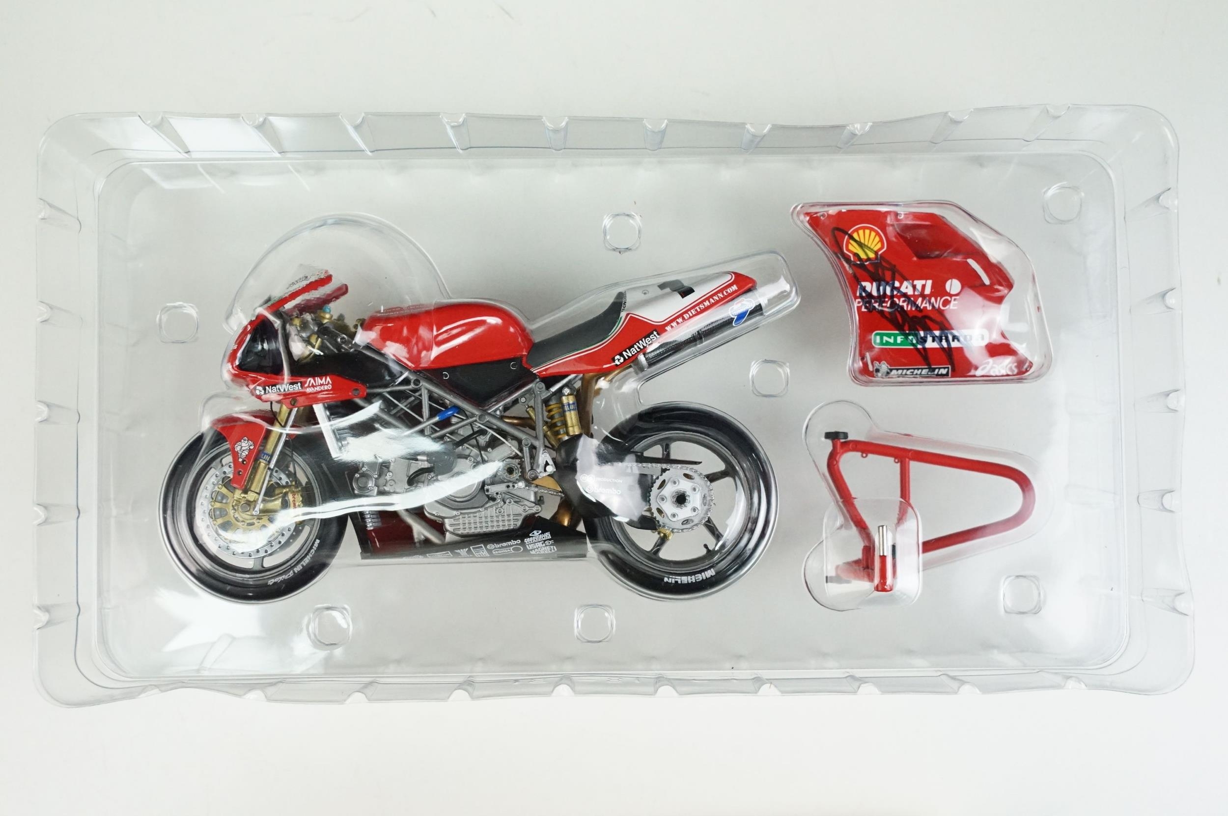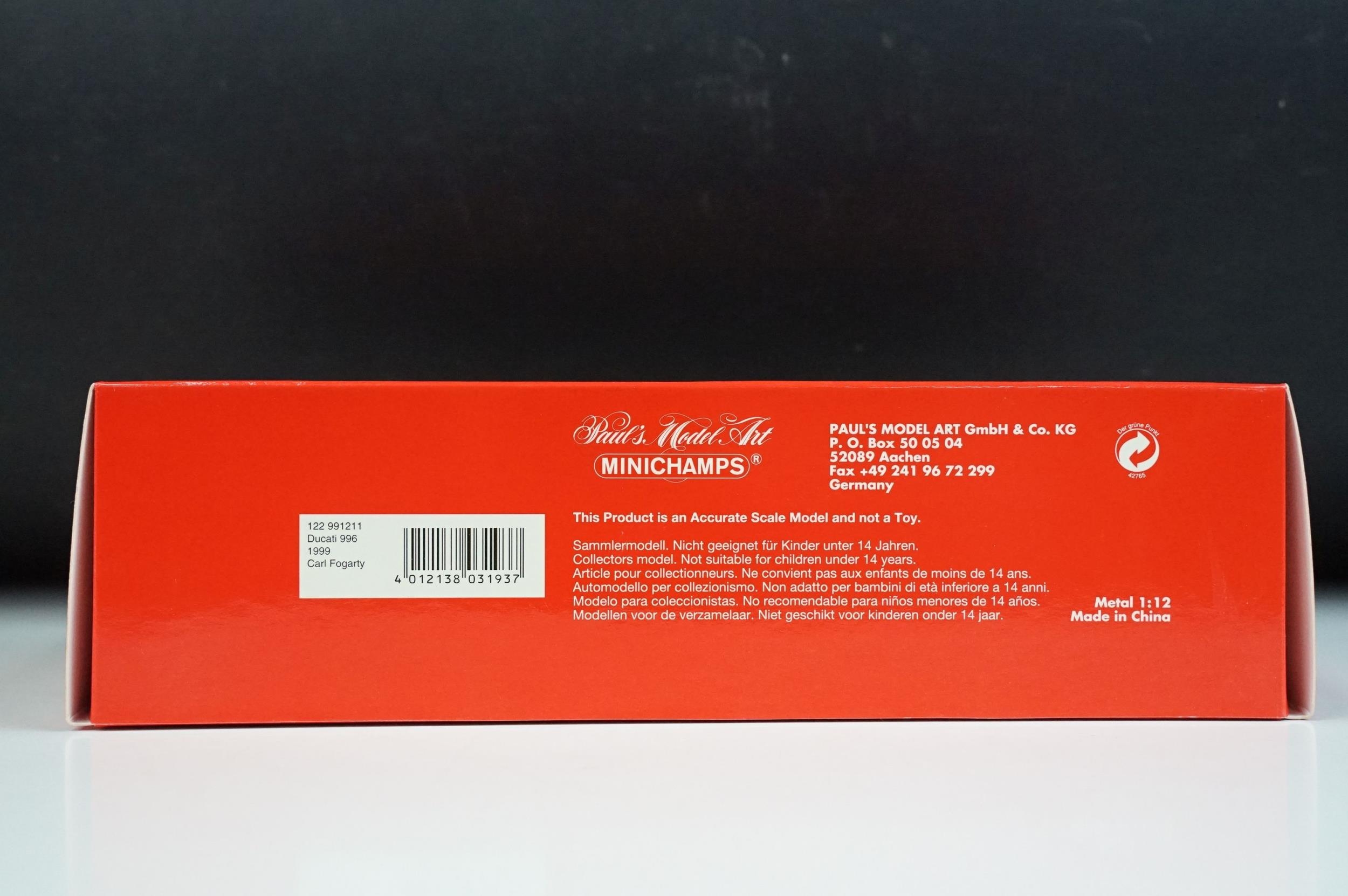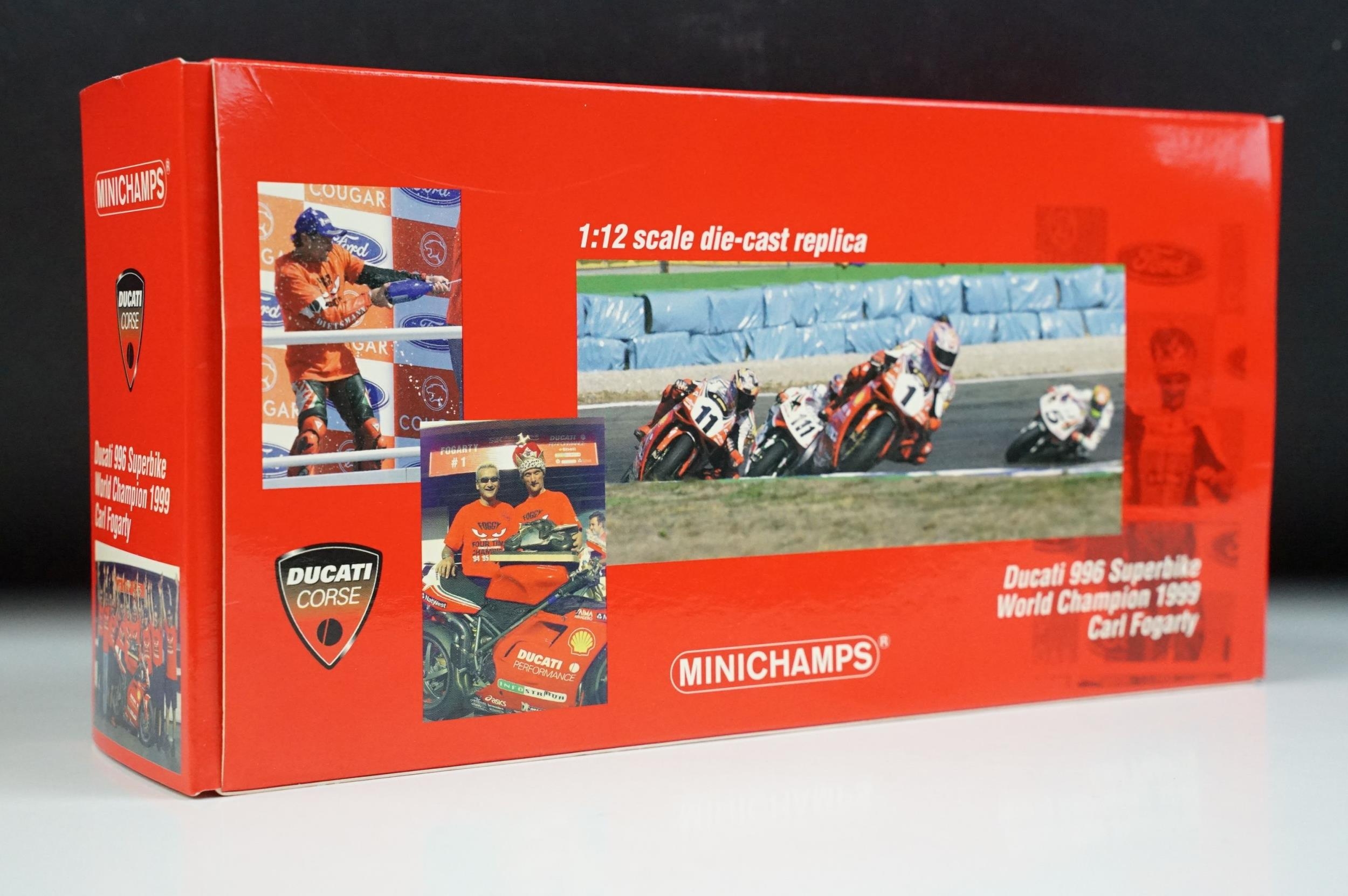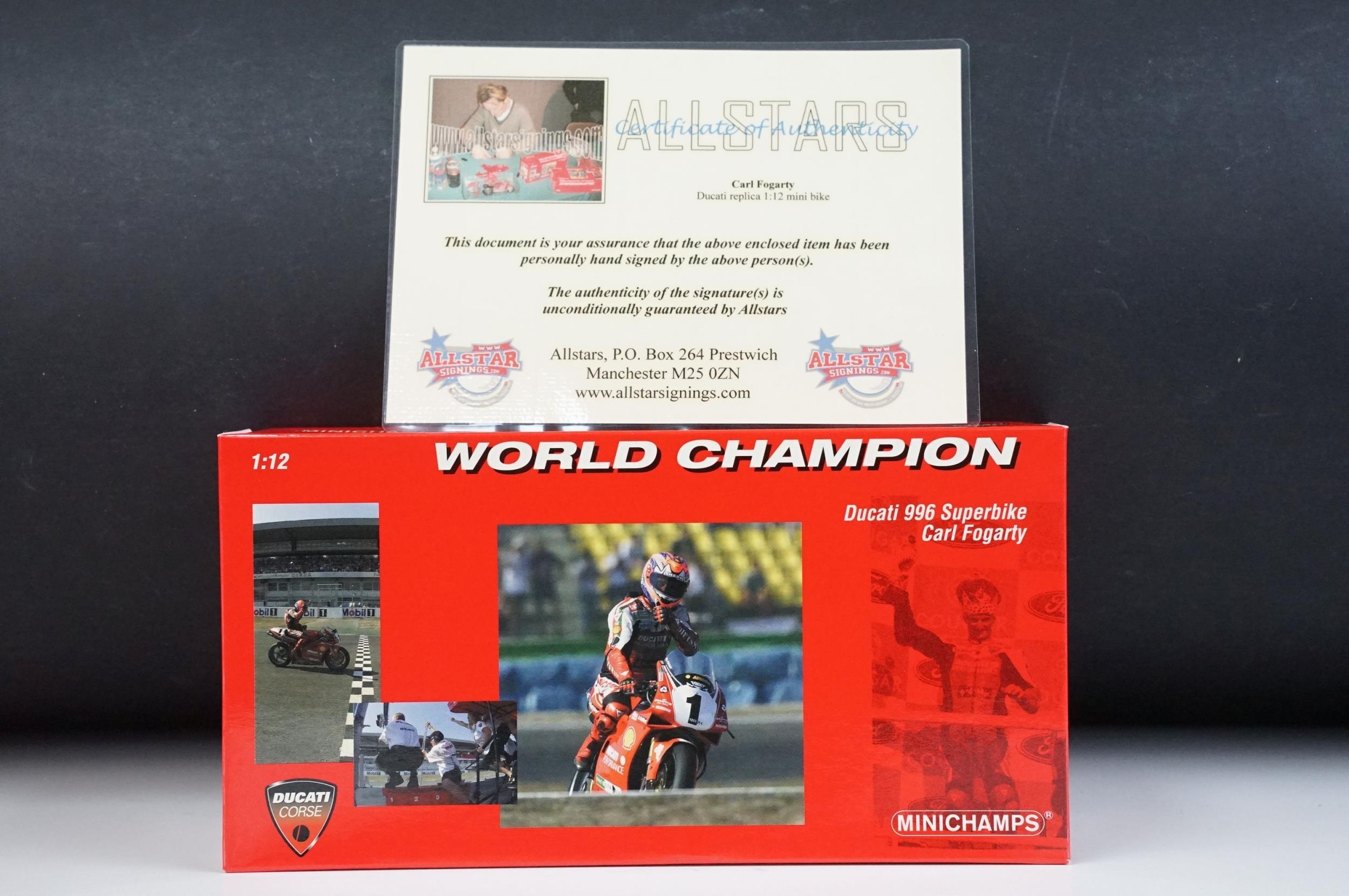 Autograph - Boxed Paul's Model Arts Minichamps 1/12 World Champion 122 991211 Ducati 996 1999 Carl Fogarty signed to the door by Fogarty, ex and with COA from Allstar Signings