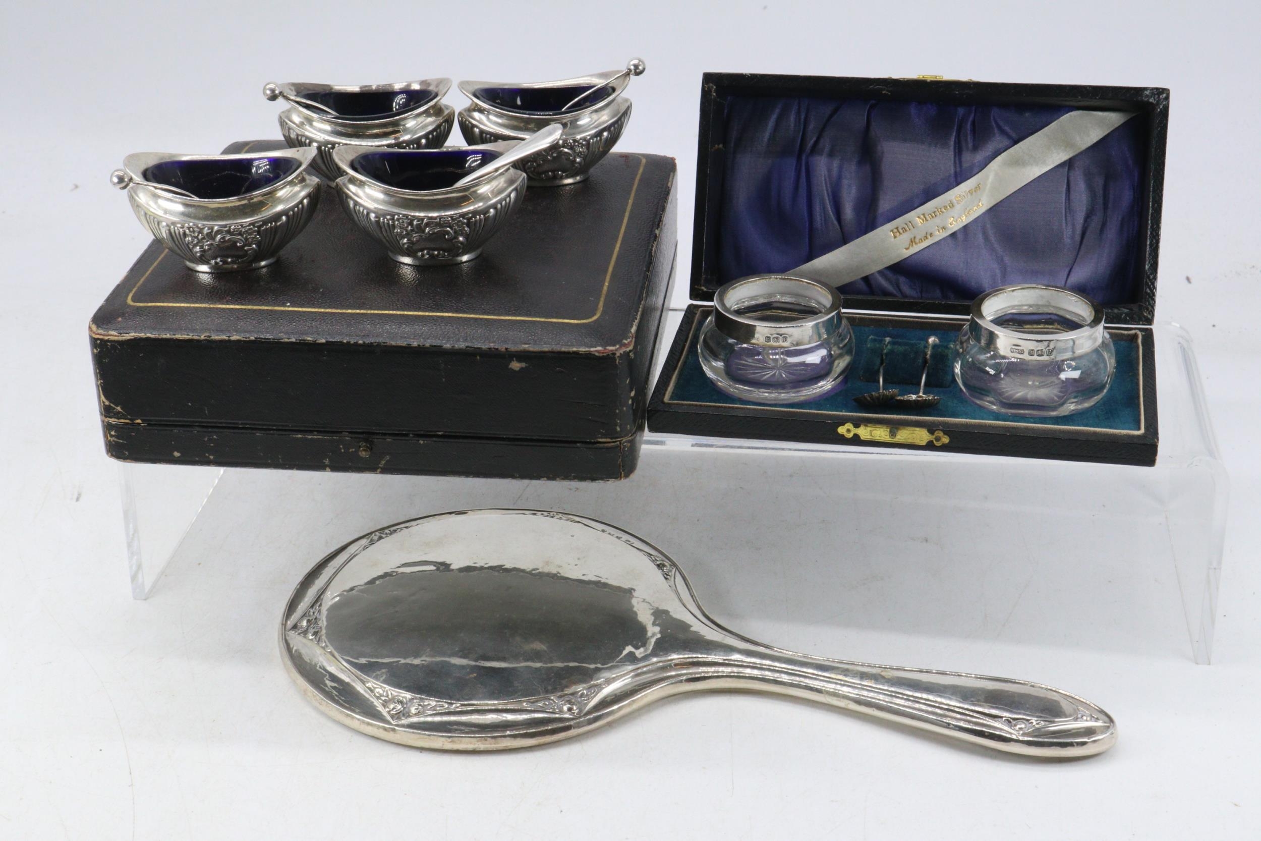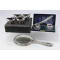 Cased set of silver salts, cased pair of silver rimmed mustard pots and spoons and a silver backed mirror