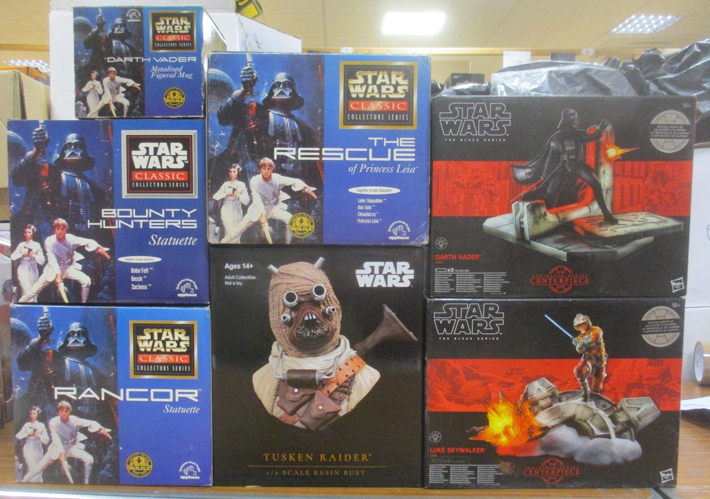 Star Wars. Range of collectable statuettes and centerpieces, generally near mint to mint in excellent to near mint boxes, with The Black Series Darth Vader, Kylo Ren, Luke Skywalker, Classic Collectors Series Bounty Hunters, Rancor, The Rescue and Diamond Select Toys Legends in 3-Dimensions Tusken Raider bust, plus Classic Collectors Series mug. Qty 8 (3B)