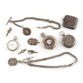 Property of a deceased estate - an early 20th century silver half hunter pocket watch, keyless wind, engraved presentation inscription to dust cover, appears to be working but no guarantees are given; together with a silver fob watch; a silver full hunter pocket watch CASE ONLY; two silver albert watch chains; three silver pendants; a silver vesta case; and a 1931 silver threepence coin (approximately 235 grams total EXCLUDING half hunter pocket watch and fob watch, and keys).