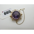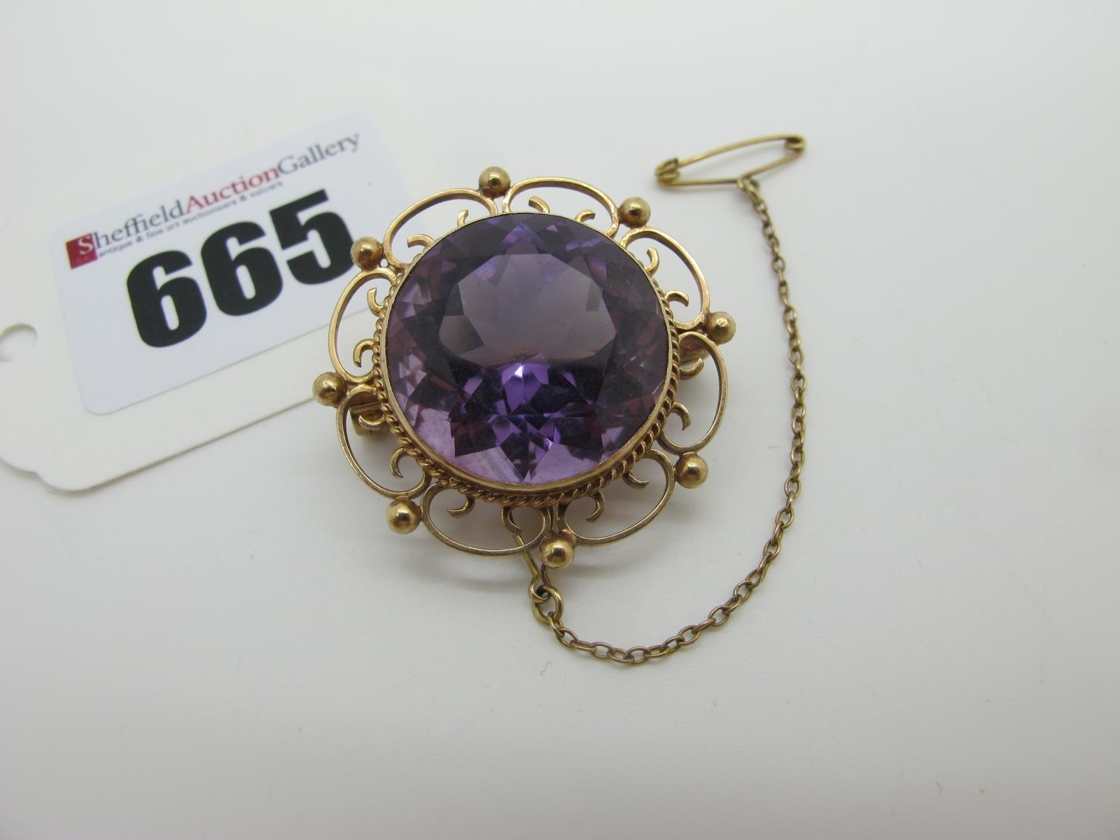 A Decorative Amethyst Single Stone Brooch, circular collet set within openwork scroll frame.