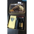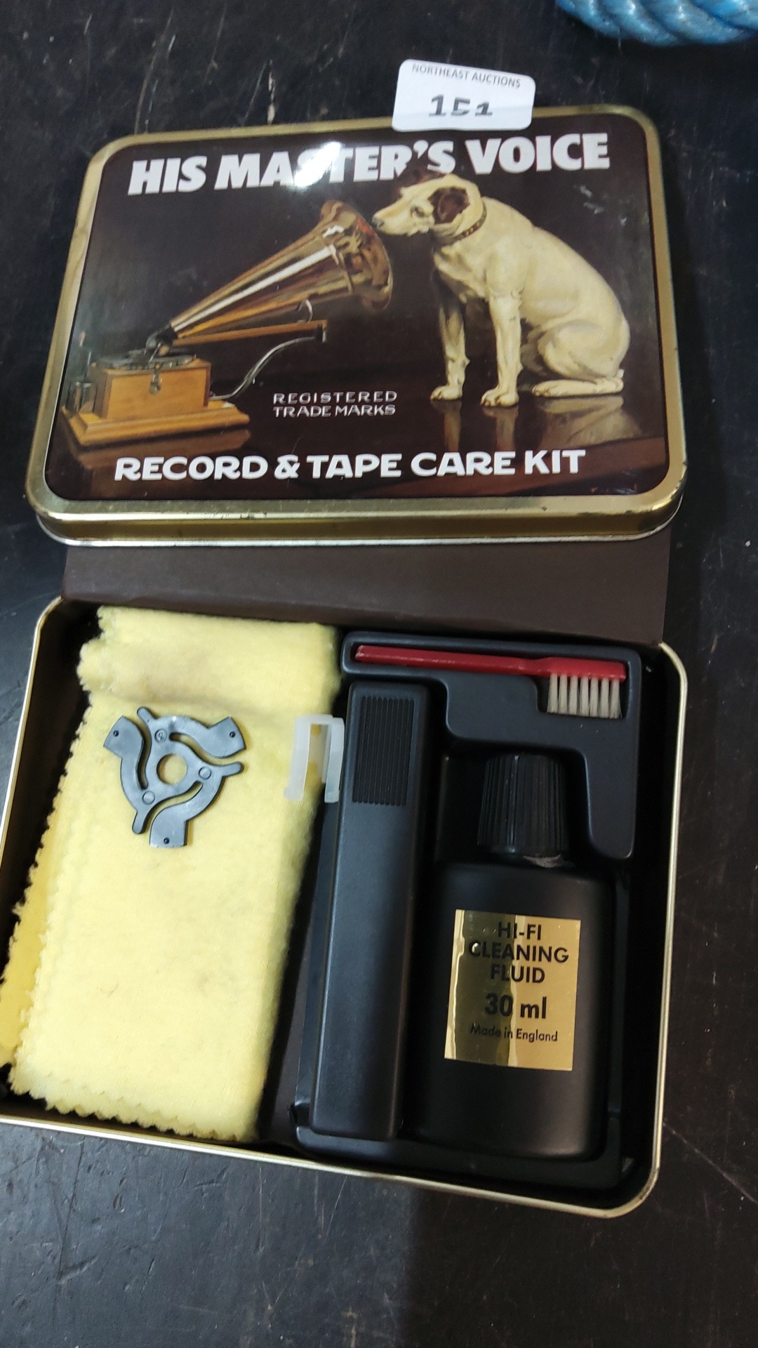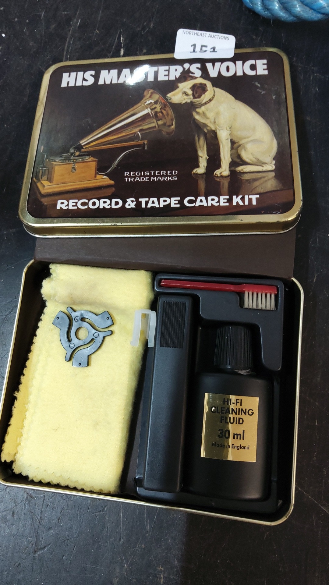 His Master’s Voice record and tape care kit, comprising a lithographed tin with Nipper and gramophone cover, containing brush, cloth, and Hi-Fi cleaning fluid (30 ml).
