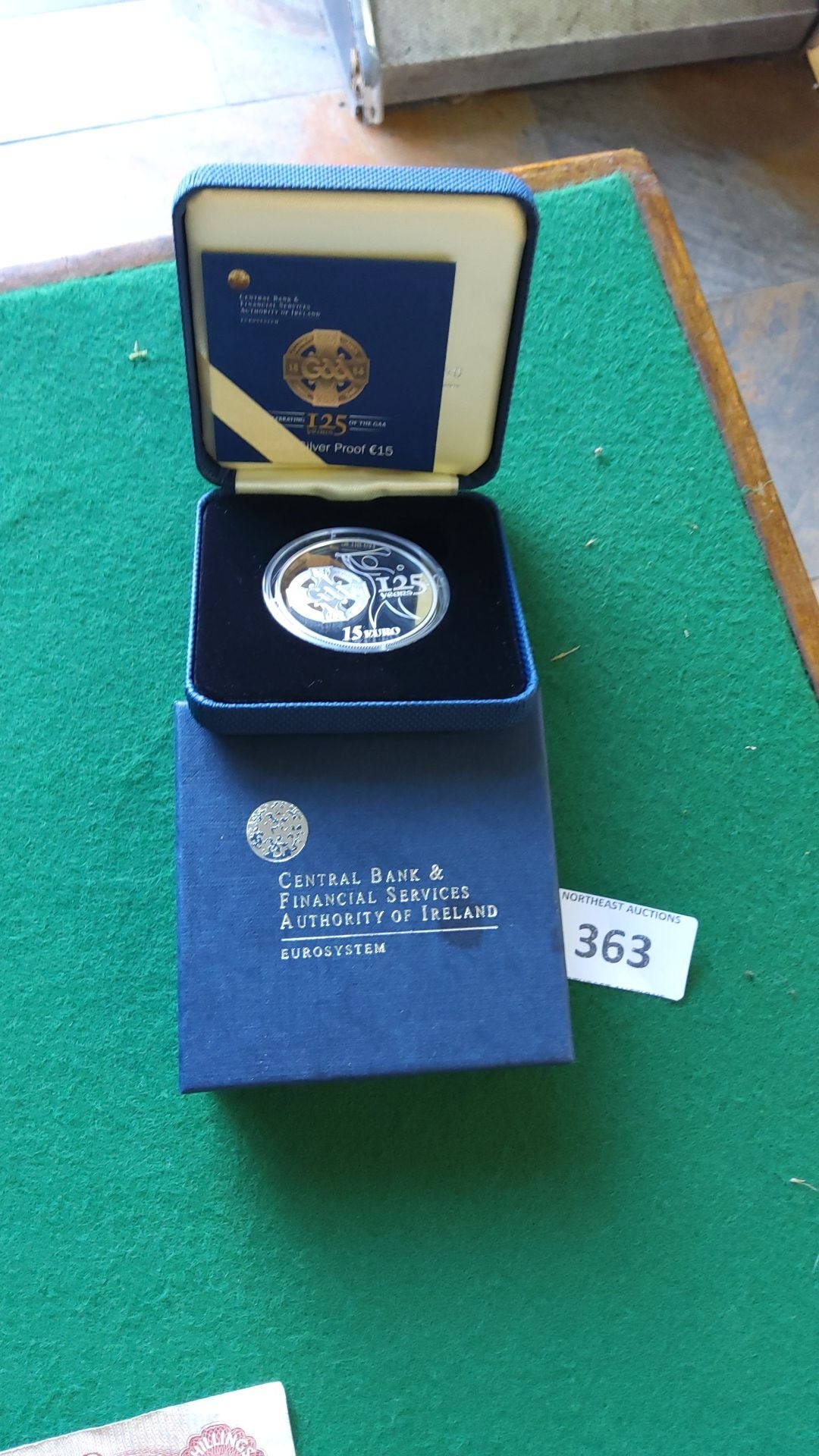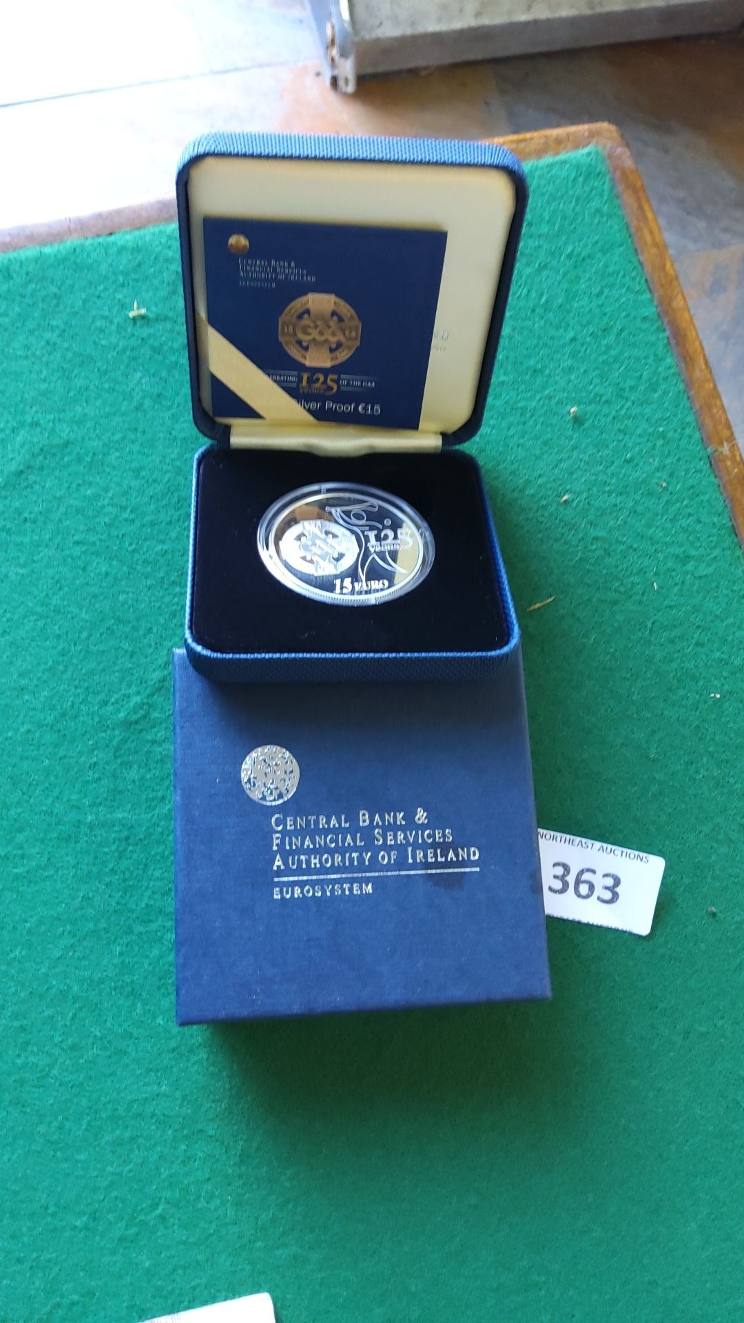 Silver proof 15 euro coin, commemorating 125 years of the GAA, boxed with authenticity certificate.