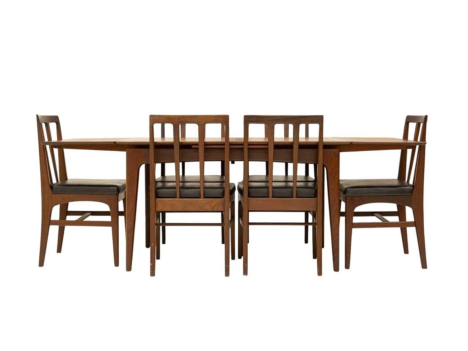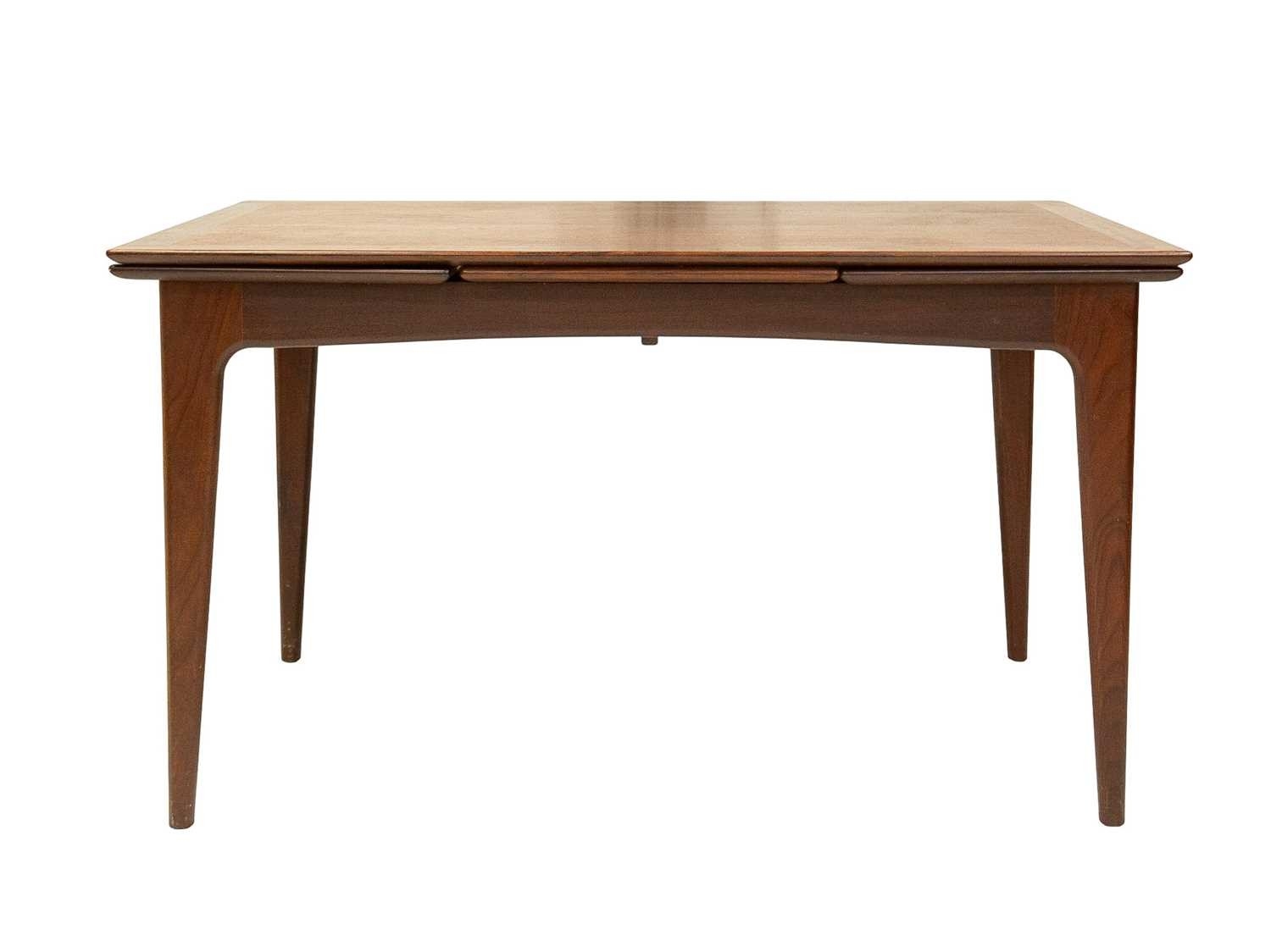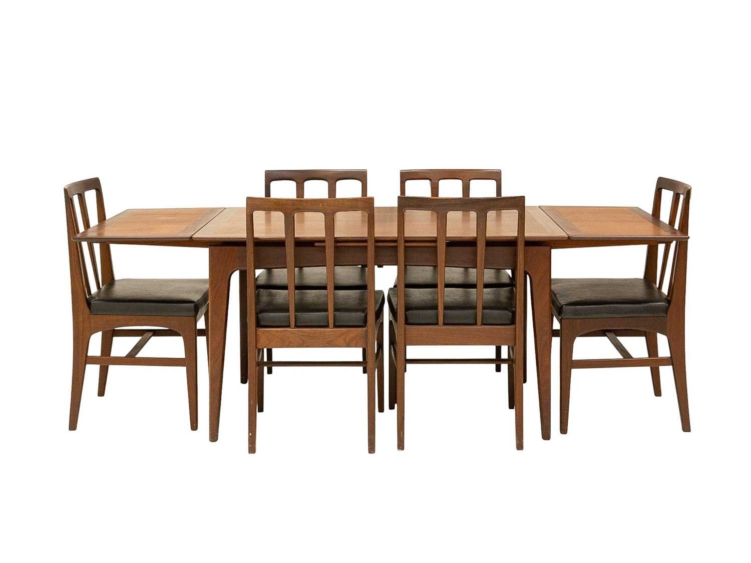 A mid-century teak dining table and six chairs. Circa 1964, Volnay, designed by John Herbert for A. Younger Ltd, the oiled teak with afrormosia finish, comprising a drawerleaf table, height 73.5cm, width 129cm (211cm extended), depth 80cm, the chairs with padded vinyl seats, with the original sales brochure and price list. We can see no defects of note. The chairs all seem solid.