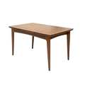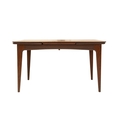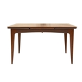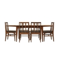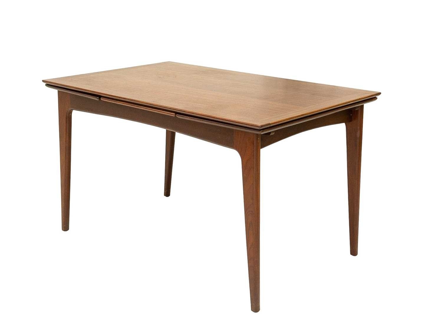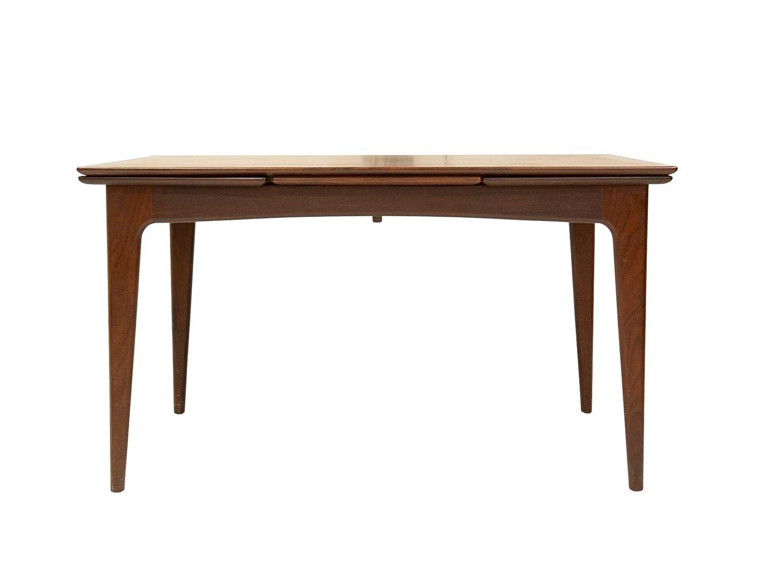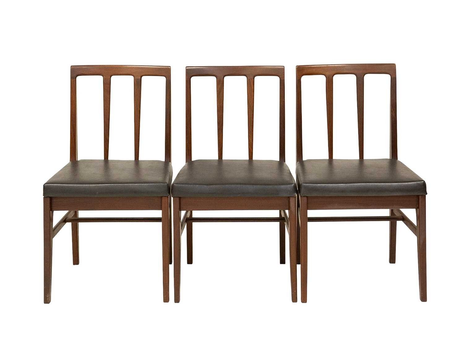 A mid-century teak dining table and six chairs. Circa 1964, Volnay, designed by John Herbert for A. Younger Ltd, the oiled teak with afrormosia finish, comprising a drawerleaf table, height 73.5cm, width 129cm (211cm extended), depth 80cm, the chairs with padded vinyl seats, with the original sales brochure and price list. We can see no defects of note. The chairs all seem solid.