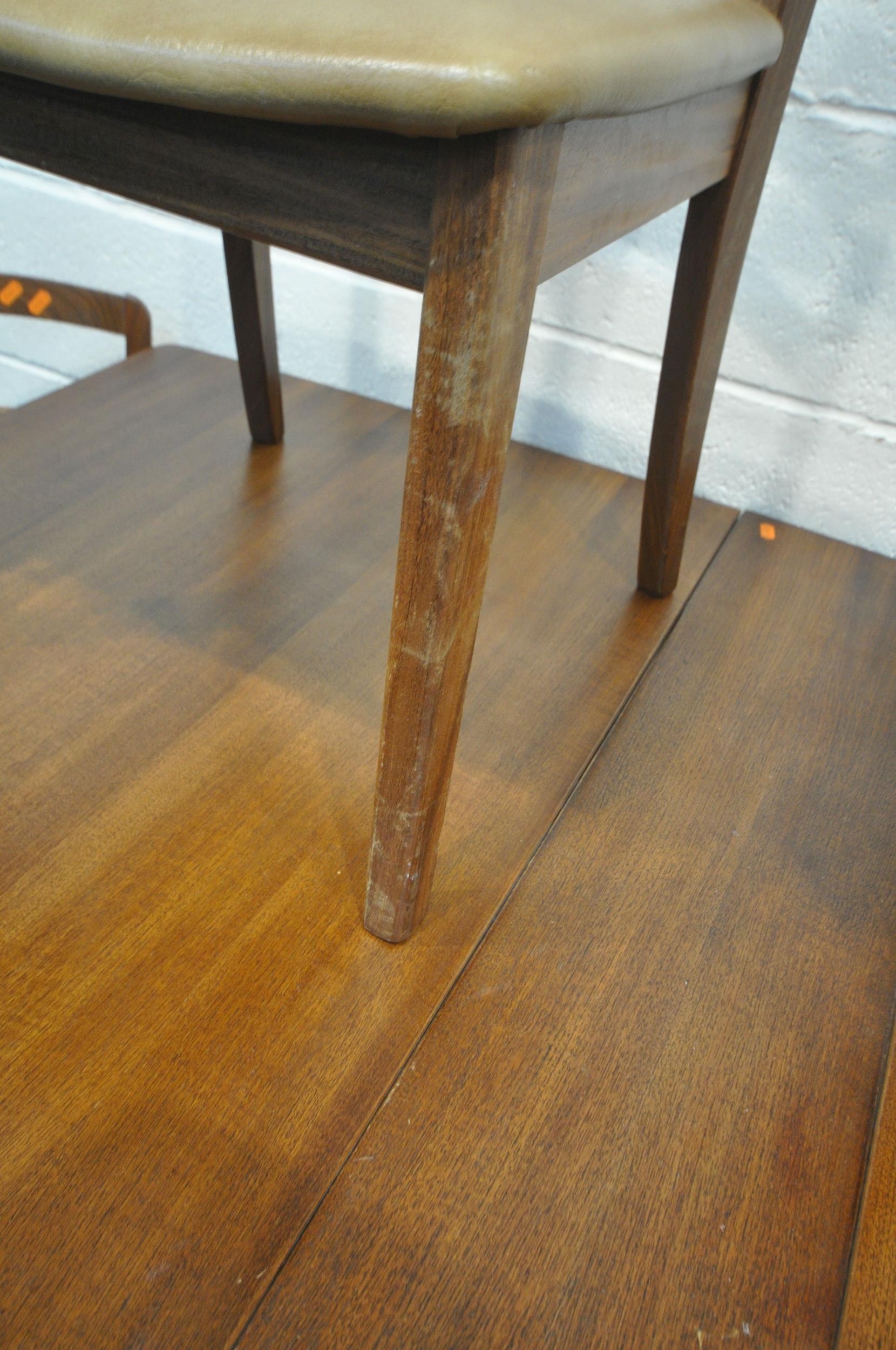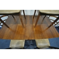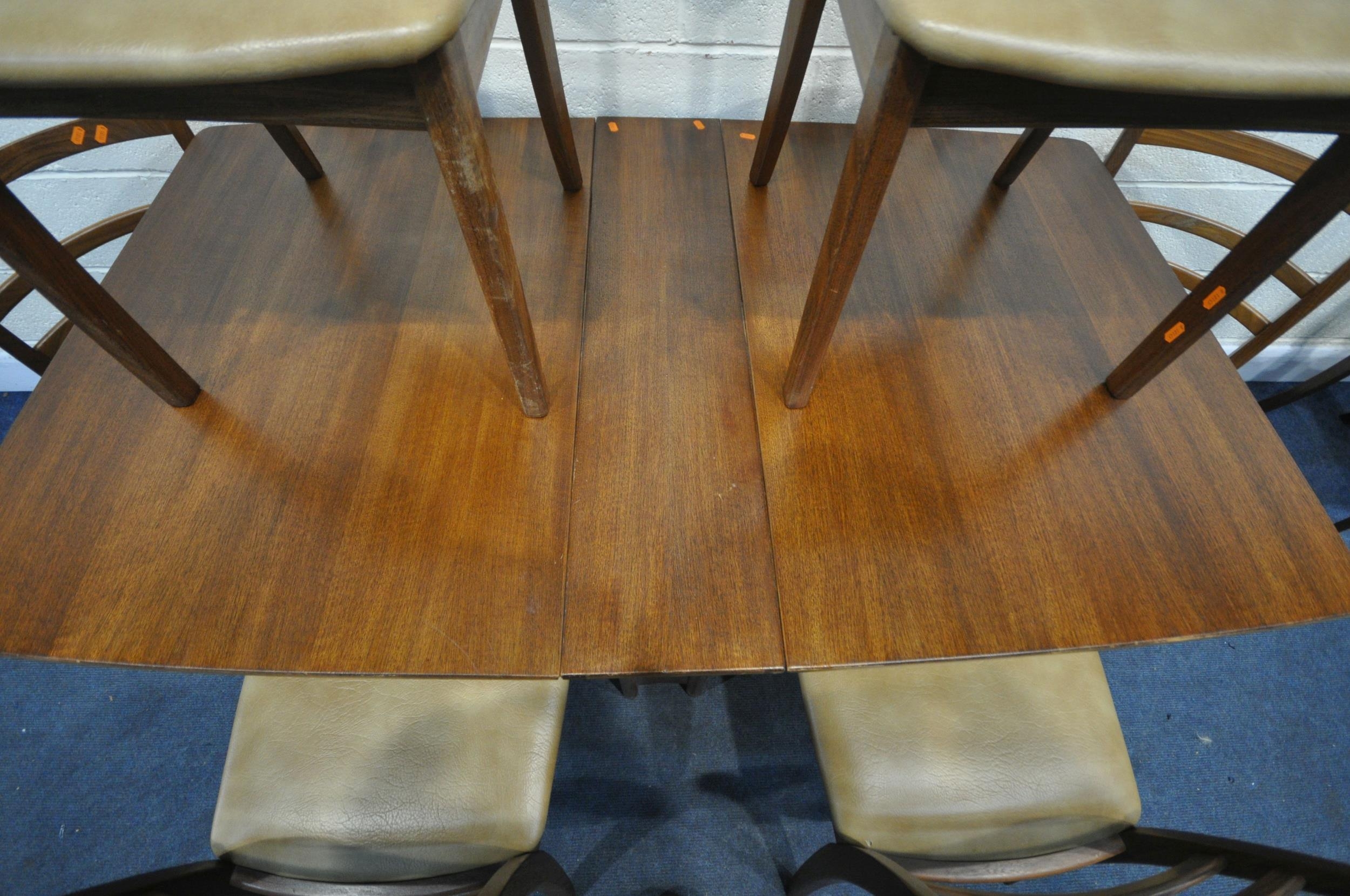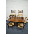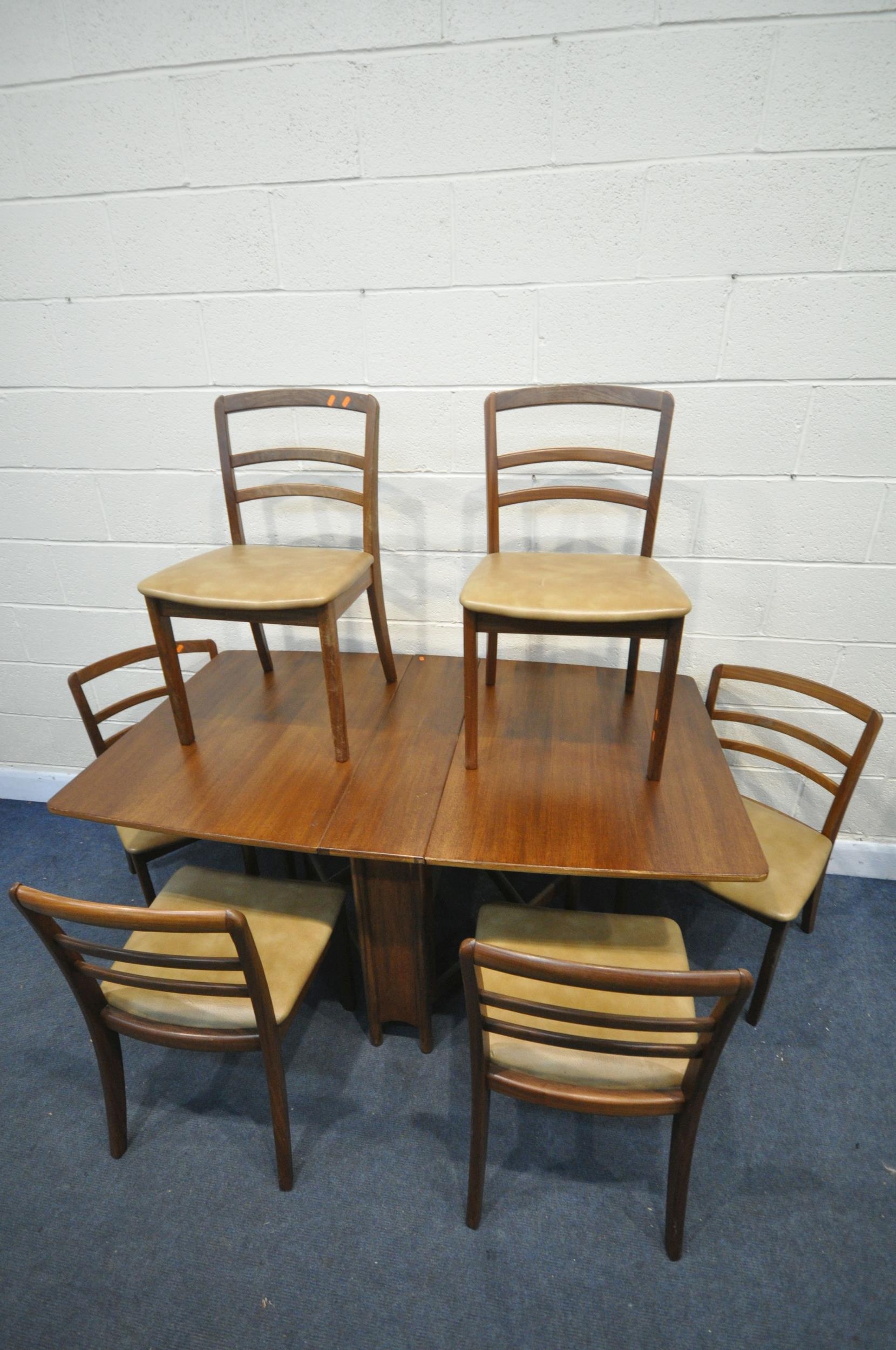 A MID CENTURY G PLAN TEAK RECTANGULAR DROP LEAF DINING TABLE, open length 149cm, closed length 22cm x depth 92cm x height 74cm, along with a set of six G plan dining chairs (condition - signs of usage to table and seat pads, and chair legs) (7)