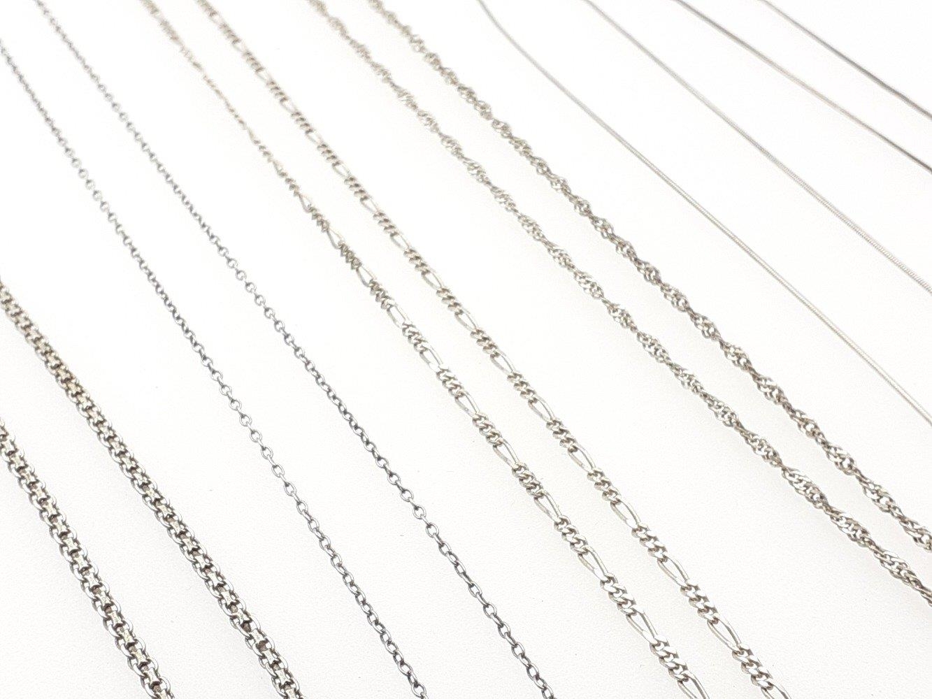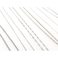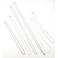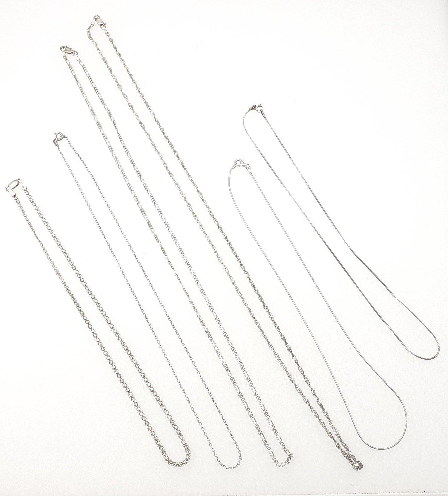 Six silver chains in various styles and lengths. 22g approx.