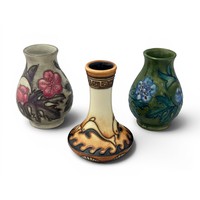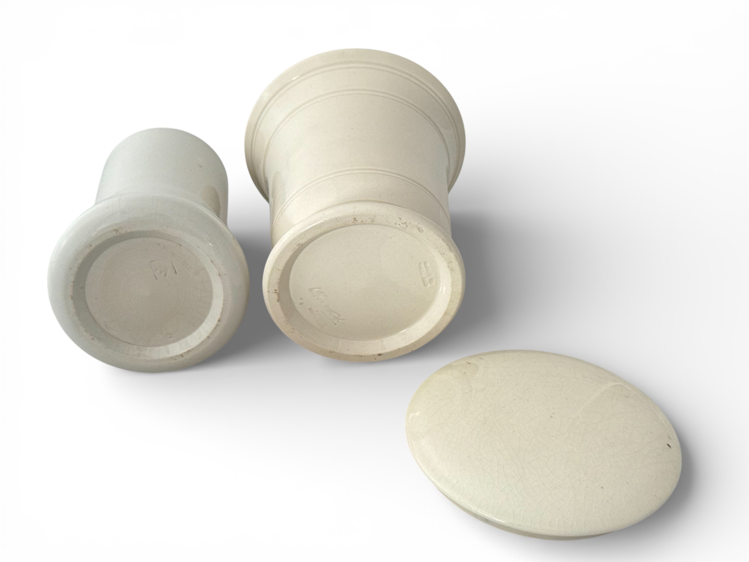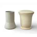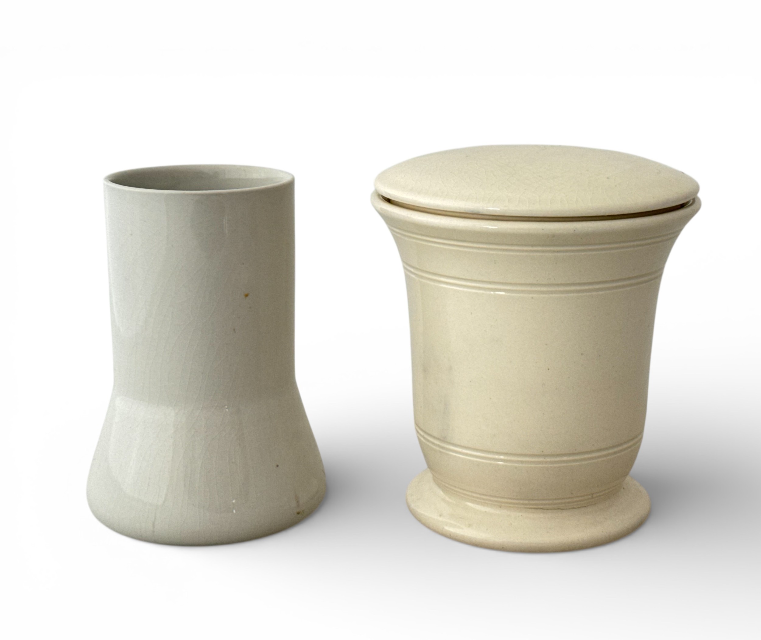 Two plain trial pieces of Moorcroft pottery, comprising a cylindrical white glazed vase 12cm high together with a lidded jar, the body ring turned, the base impressed factory marks 13cm high (2)