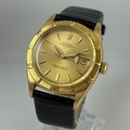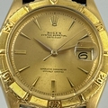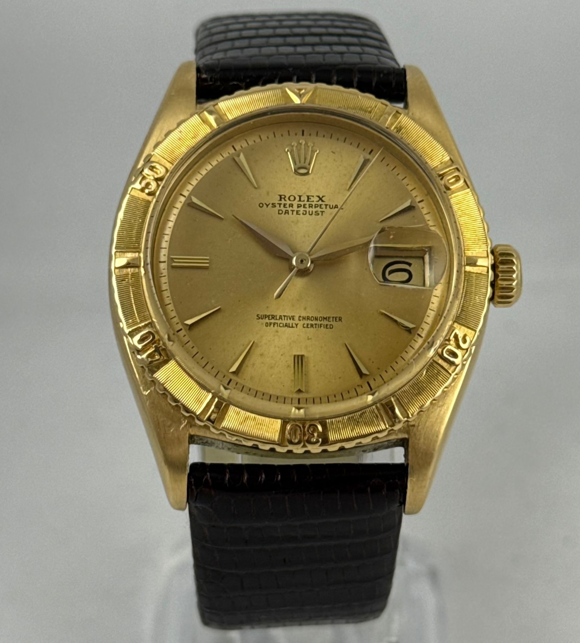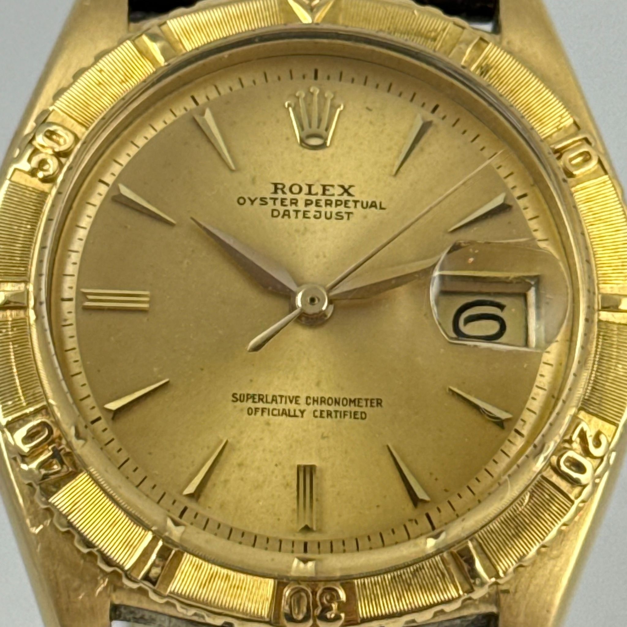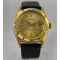 A GENTLEMAN'S 1959 ROLEX DATEJUST TURNOGRAPH THUNDERBIRD 6609 WRISTWATCH, 18 CARAT YELLOW GOLD CASE, 36 MM, WORKING AT TIME OF CATALOGING, COME WITH WATCH REGISTER CERTIFICATE. RARE ORIGINAL DIAL AND HAND, IN EXCELLENT CONDITION