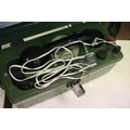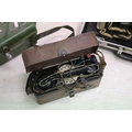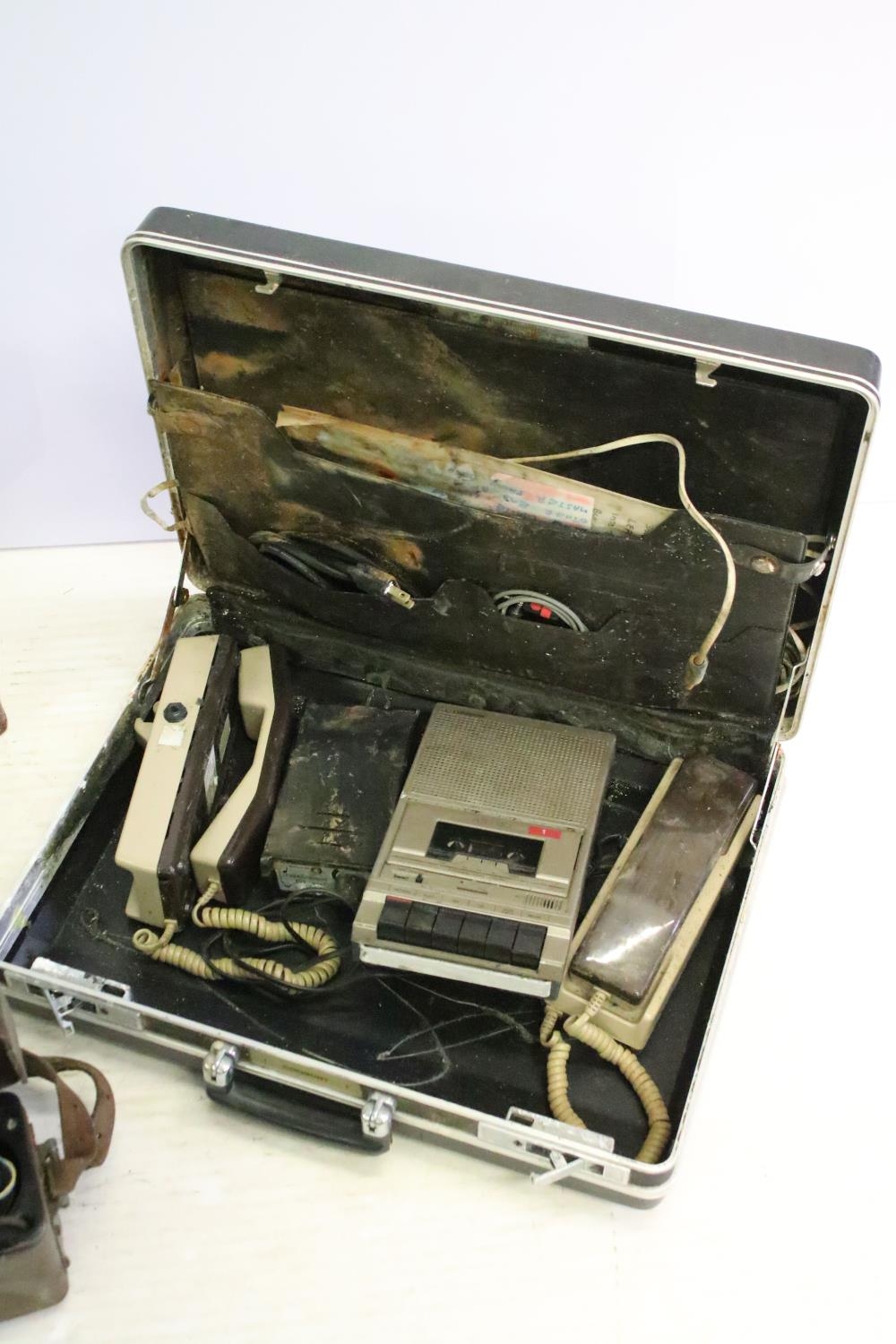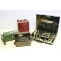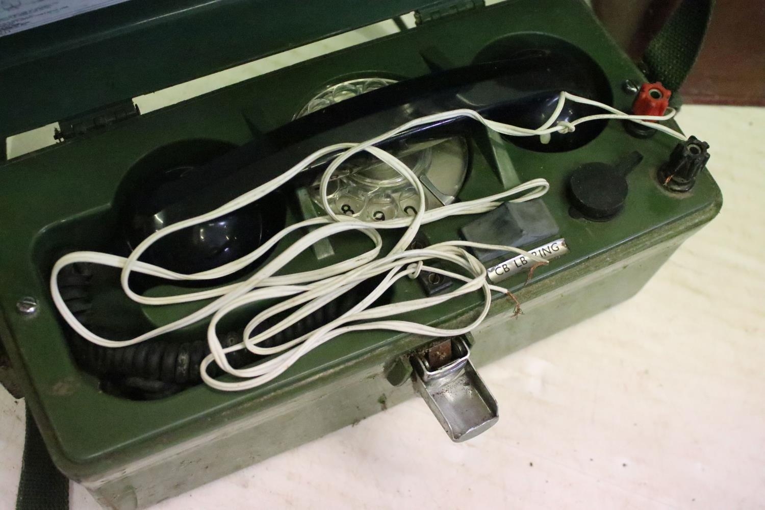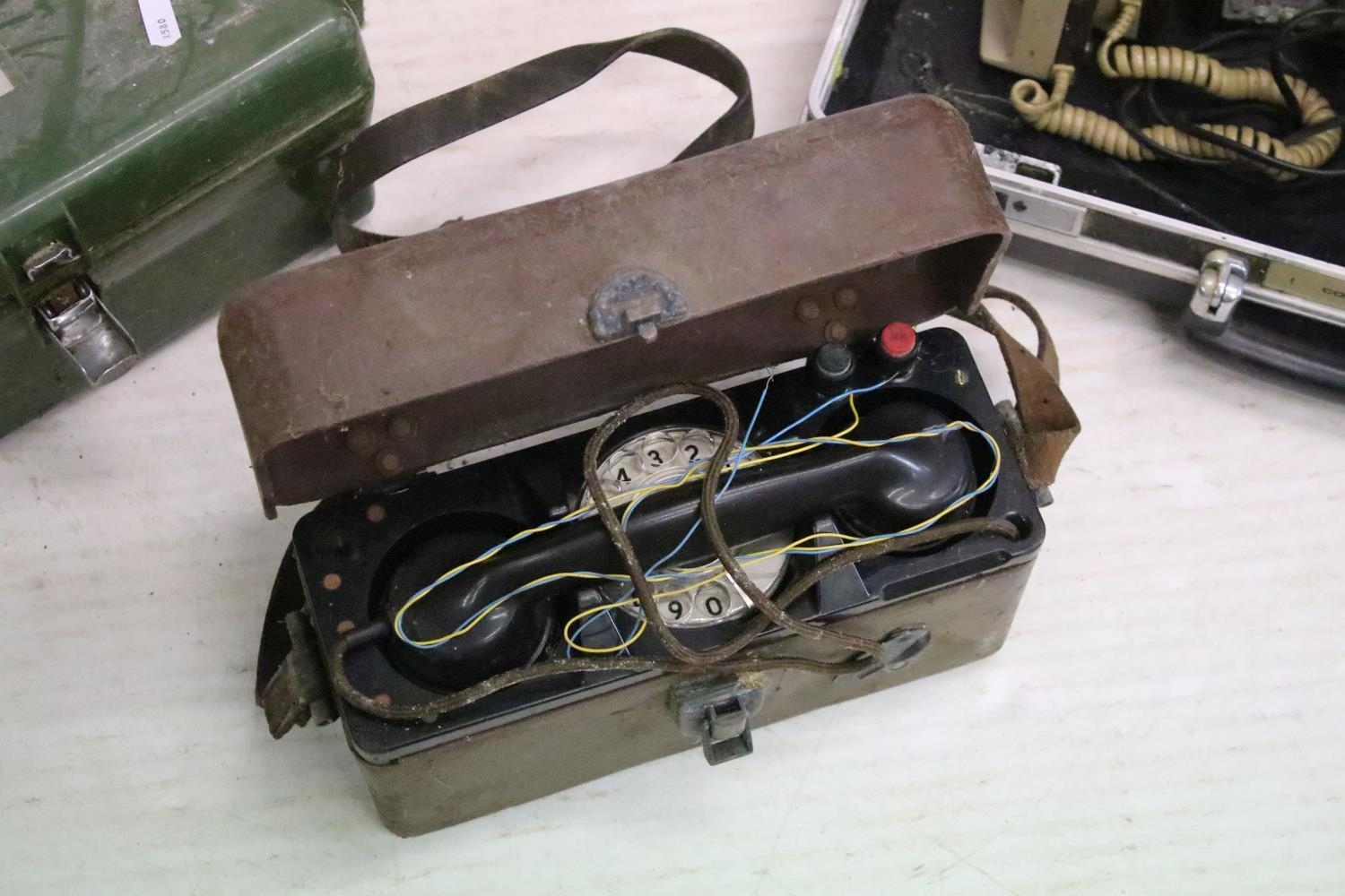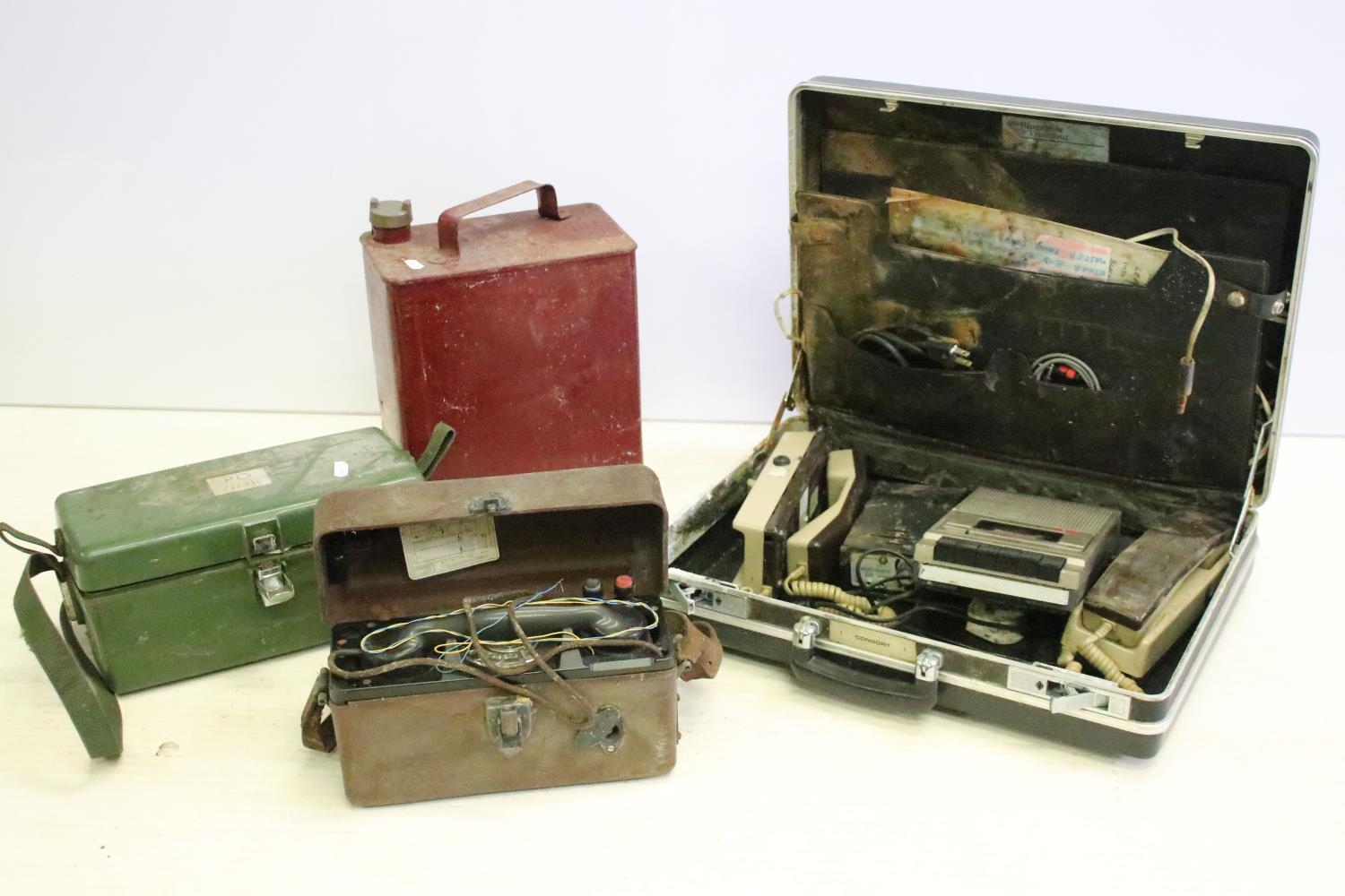 Two engineers line testing telephones, one marked PO 704B to the case, together with further telephones, a GPO oil can, etc