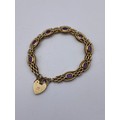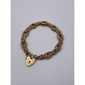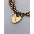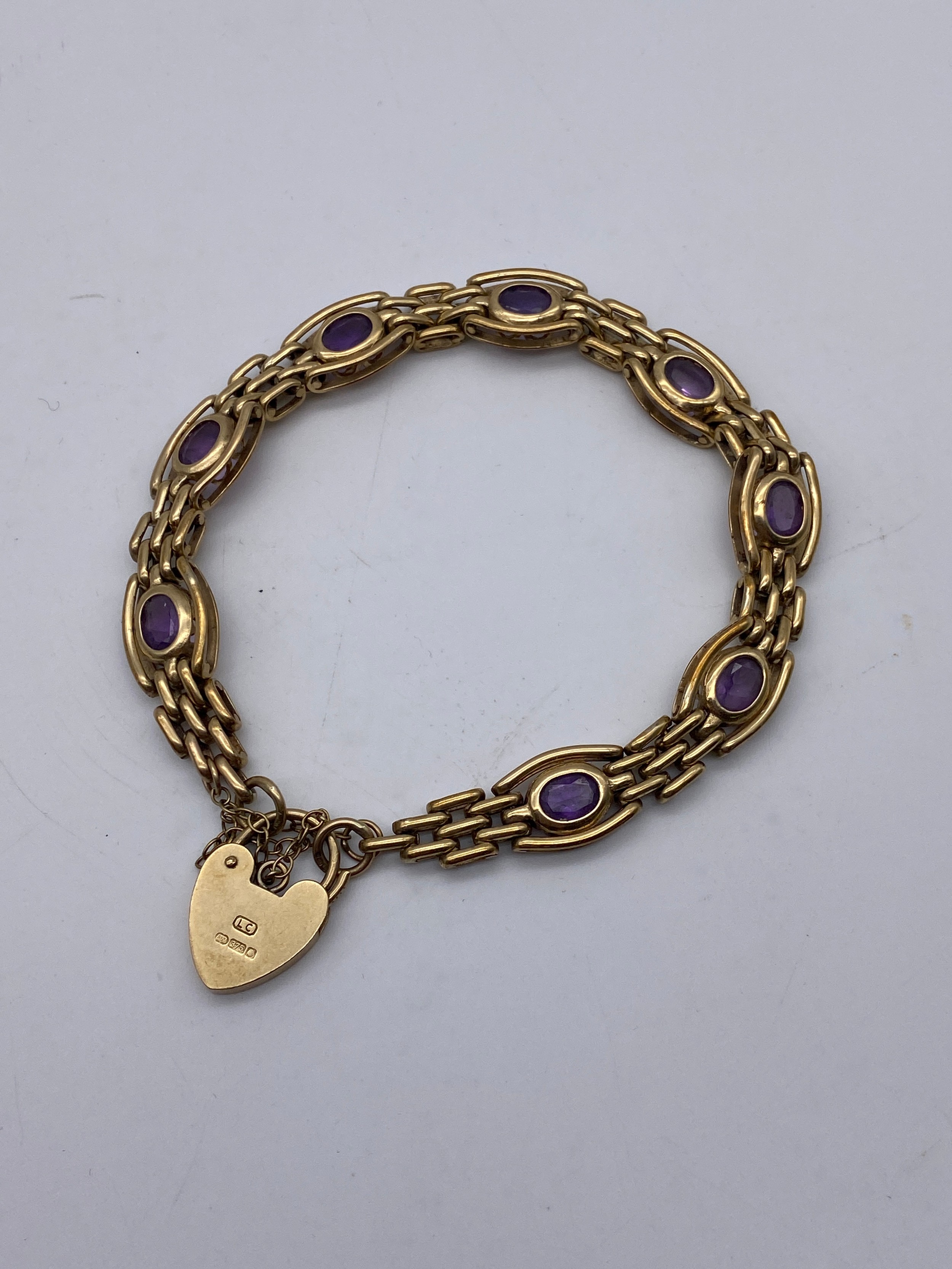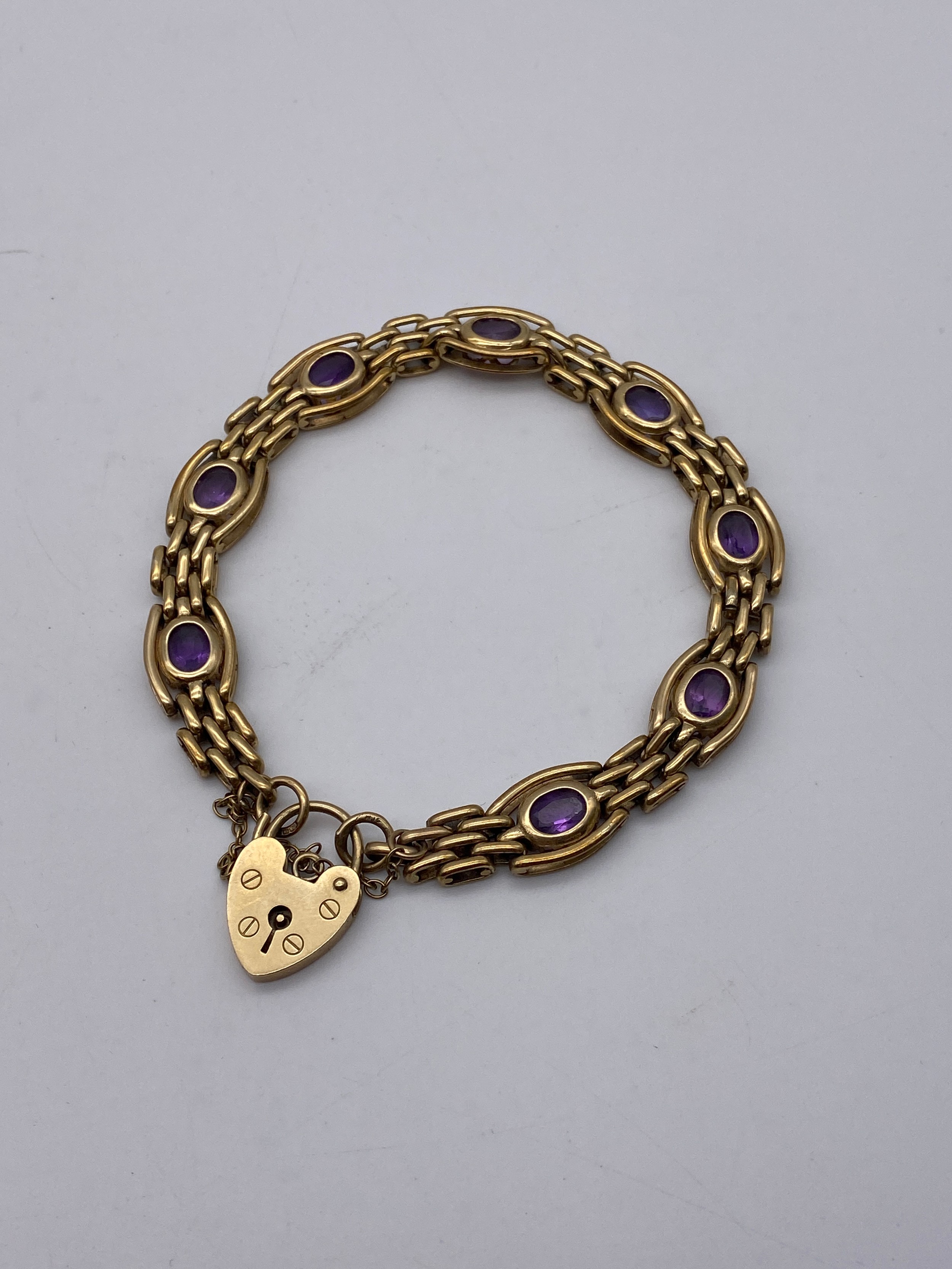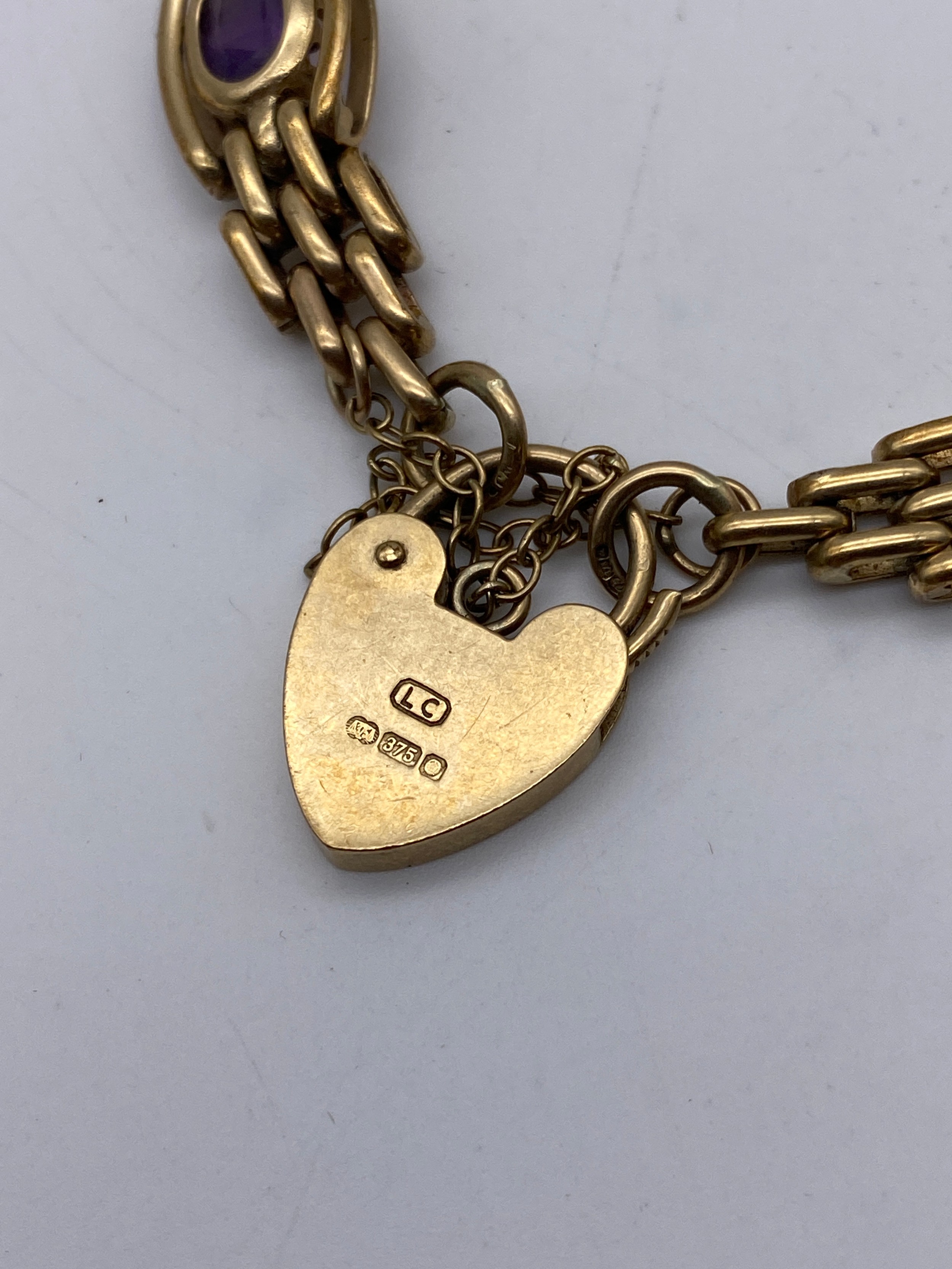 9CT GOLD GATE BRACELET WITH AMETHYST SET LINKS PADLOCK AND SAFETY CHAIN 19.8G APPROX
