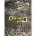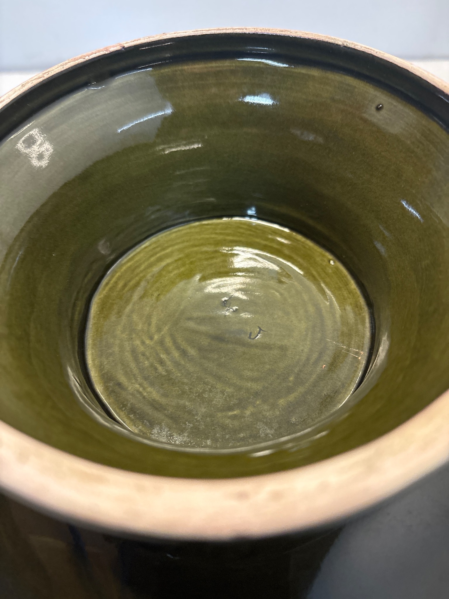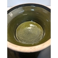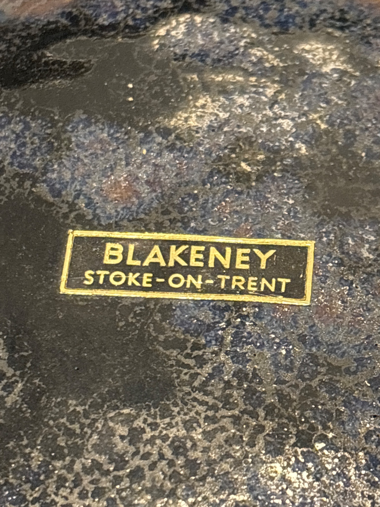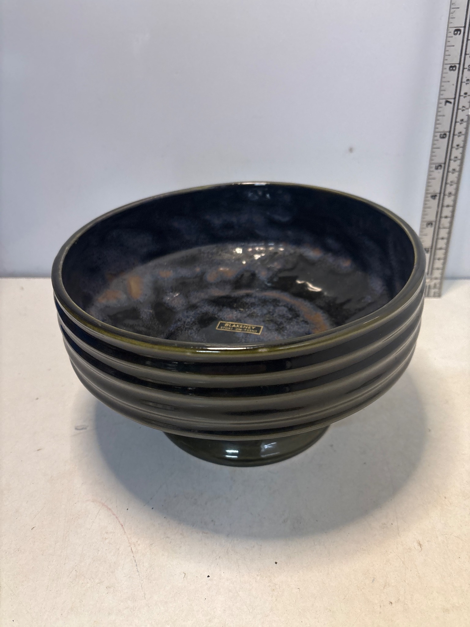 Mid-century ceramic bowl by Blakeney, Stoke-on-Trent. Features a ribbed exterior and glossy green and blue glaze. Marked on the bottom.