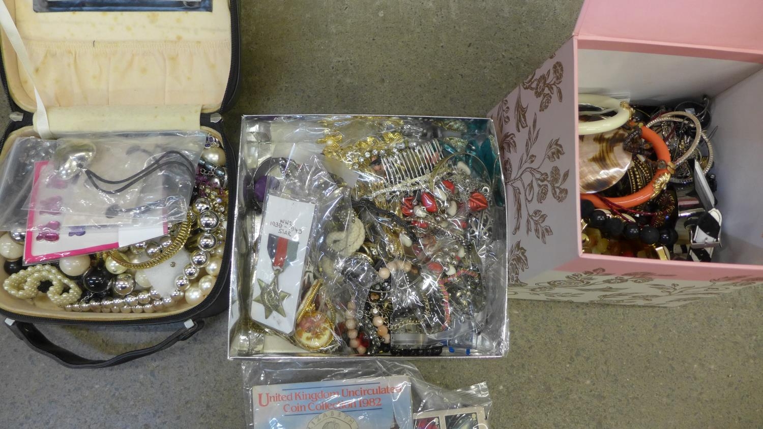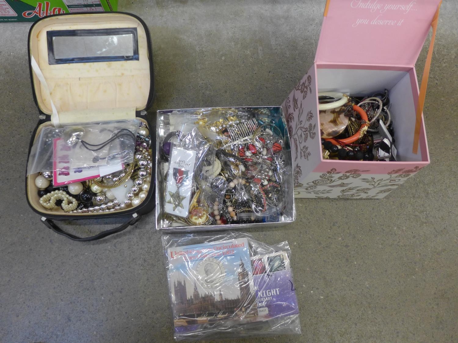 A collection of costume jewellery, etc., (replica WWII medal)