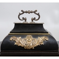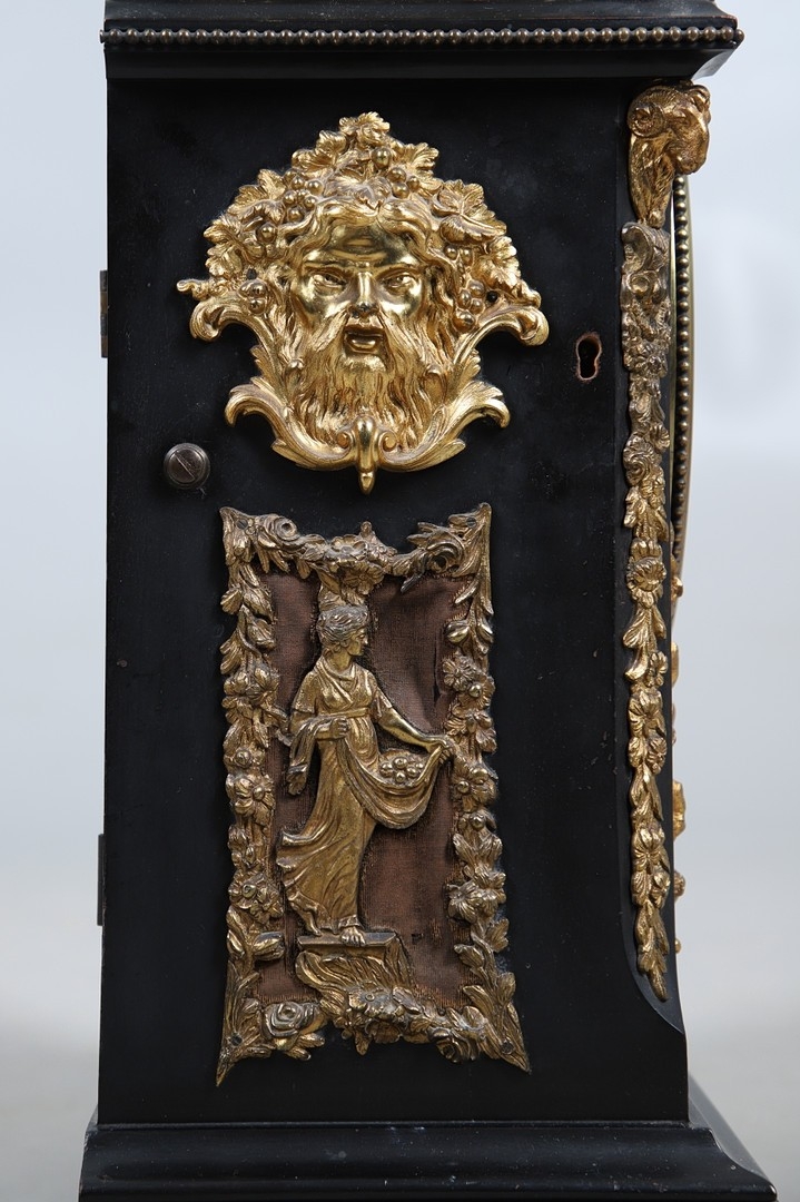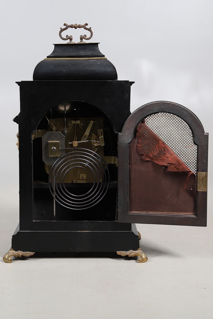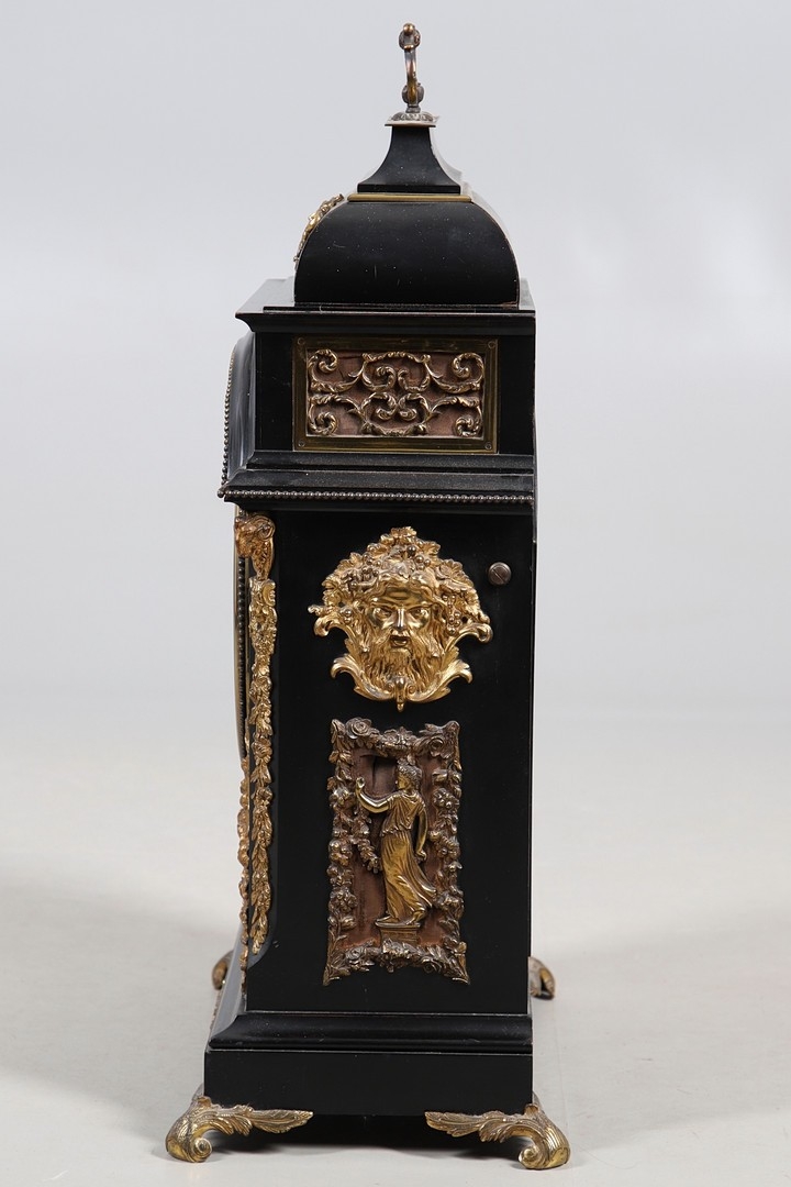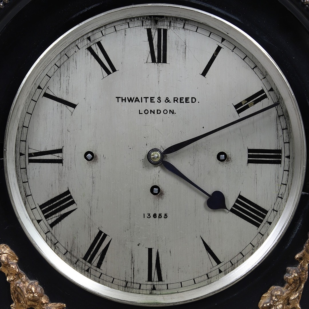 A SUBSTANTIAL 19TH CENTURY EBONISED CHIMING TABLE CLOCK BY THWAITES & REED, LONDON. the 9 1/2" silvered dial signed Thwaites & Reed, London, 13655 with strike/silent lever, to a three train movement, quarter chiming on a nest of eight bells and a gong for the hours, the caddy top case with carrying handle and gilt metal mounts of Classical ornamentation, cast as rams heads, floral trails and swags, female figures and masks, with repeater pull, height 77cm inc handle, width 47cm, depth 28cm.