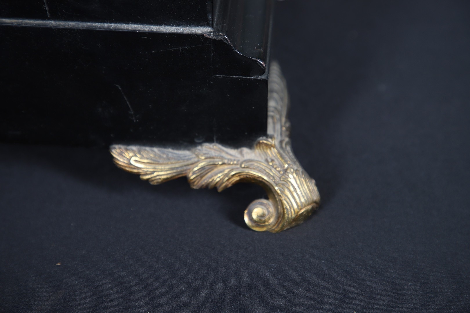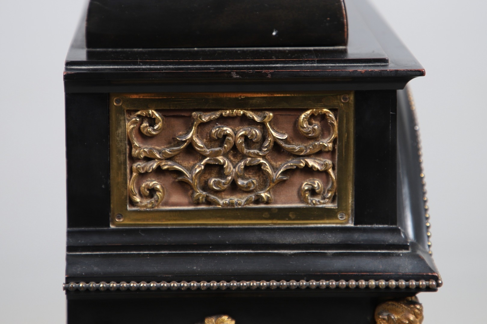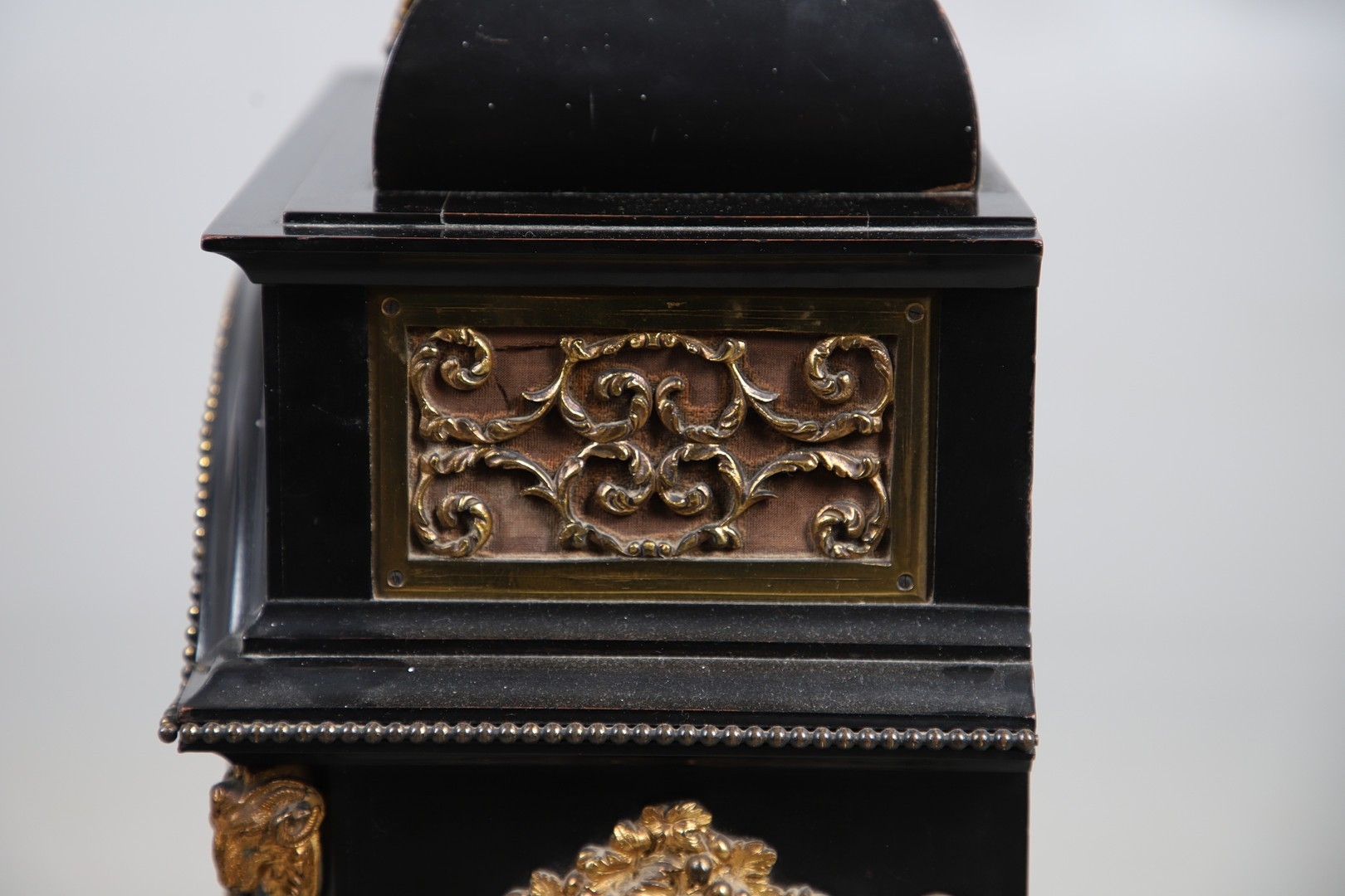 A SUBSTANTIAL 19TH CENTURY EBONISED CHIMING TABLE CLOCK BY THWAITES & REED, LONDON. the 9 1/2" silvered dial signed Thwaites & Reed, London, 13655 with strike/silent lever, to a three train movement, quarter chiming on a nest of eight bells and a gong for the hours, the caddy top case with carrying handle and gilt metal mounts of Classical ornamentation, cast as rams heads, floral trails and swags, female figures and masks, with repeater pull, height 77cm inc handle, width 47cm, depth 28cm.