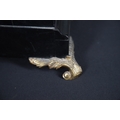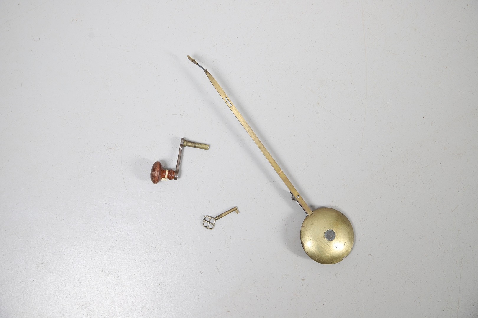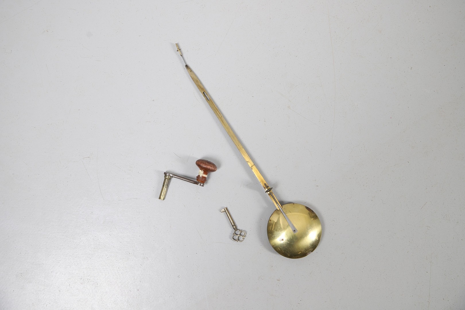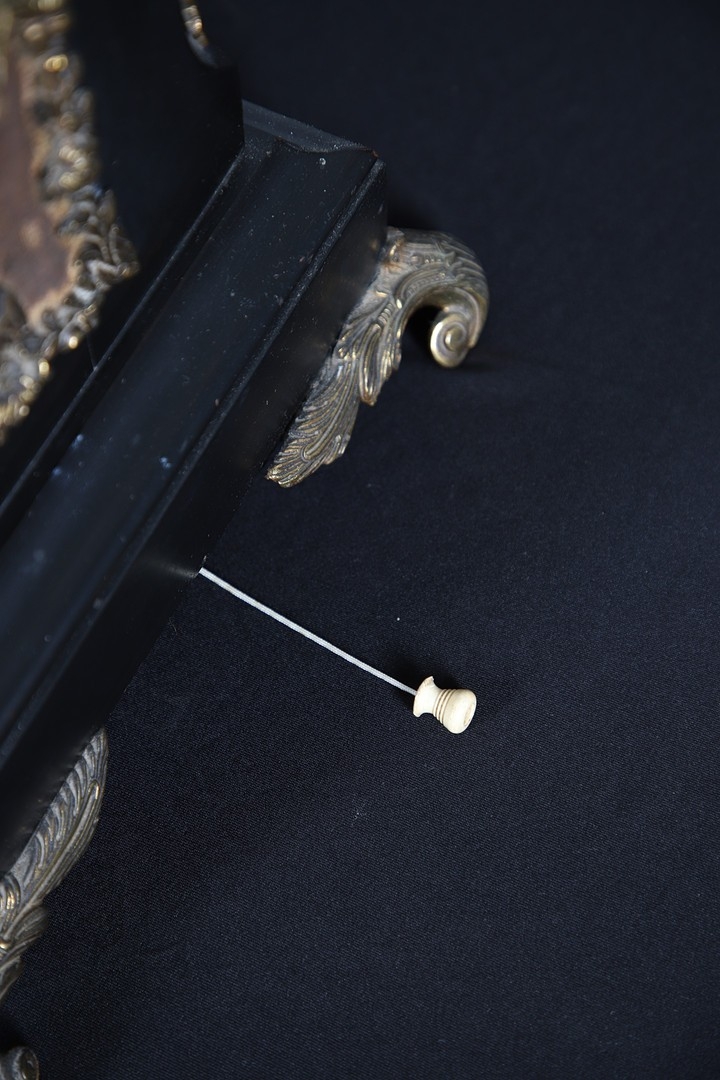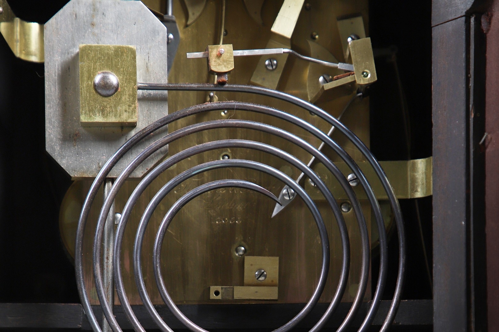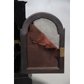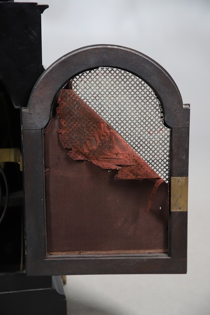 Surface wear to dial, movement winds, strikes accurately and chimes, rear door grille and fabric lining partially loose, fabric side panels worn, slight separation at joins of caddy top, top section slightly loose.