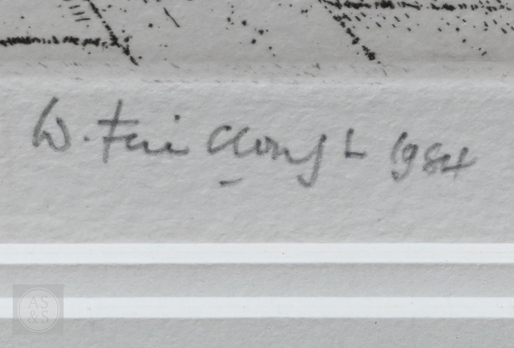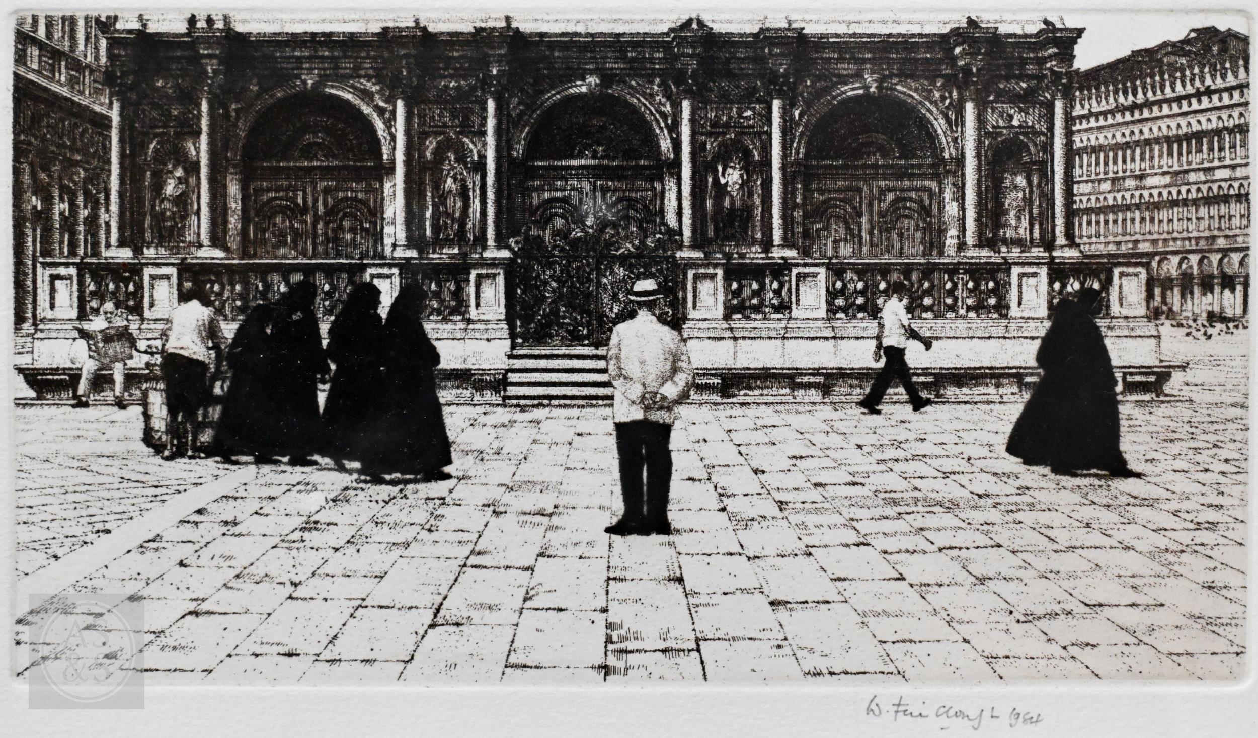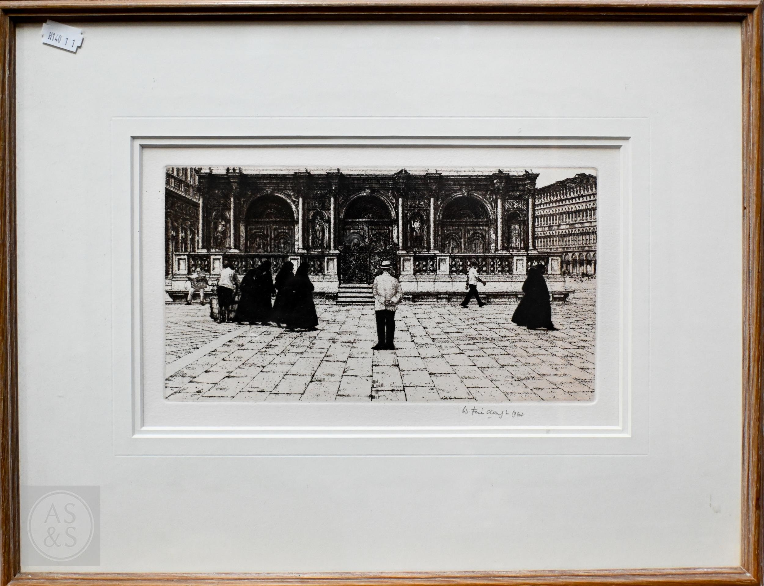 Wilfred R E Fairclough (1907-96) - Nuns crossing the piazza, etching, pencil signed and dated 1984 to lower right margin, 14.5 x 26 cm
