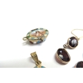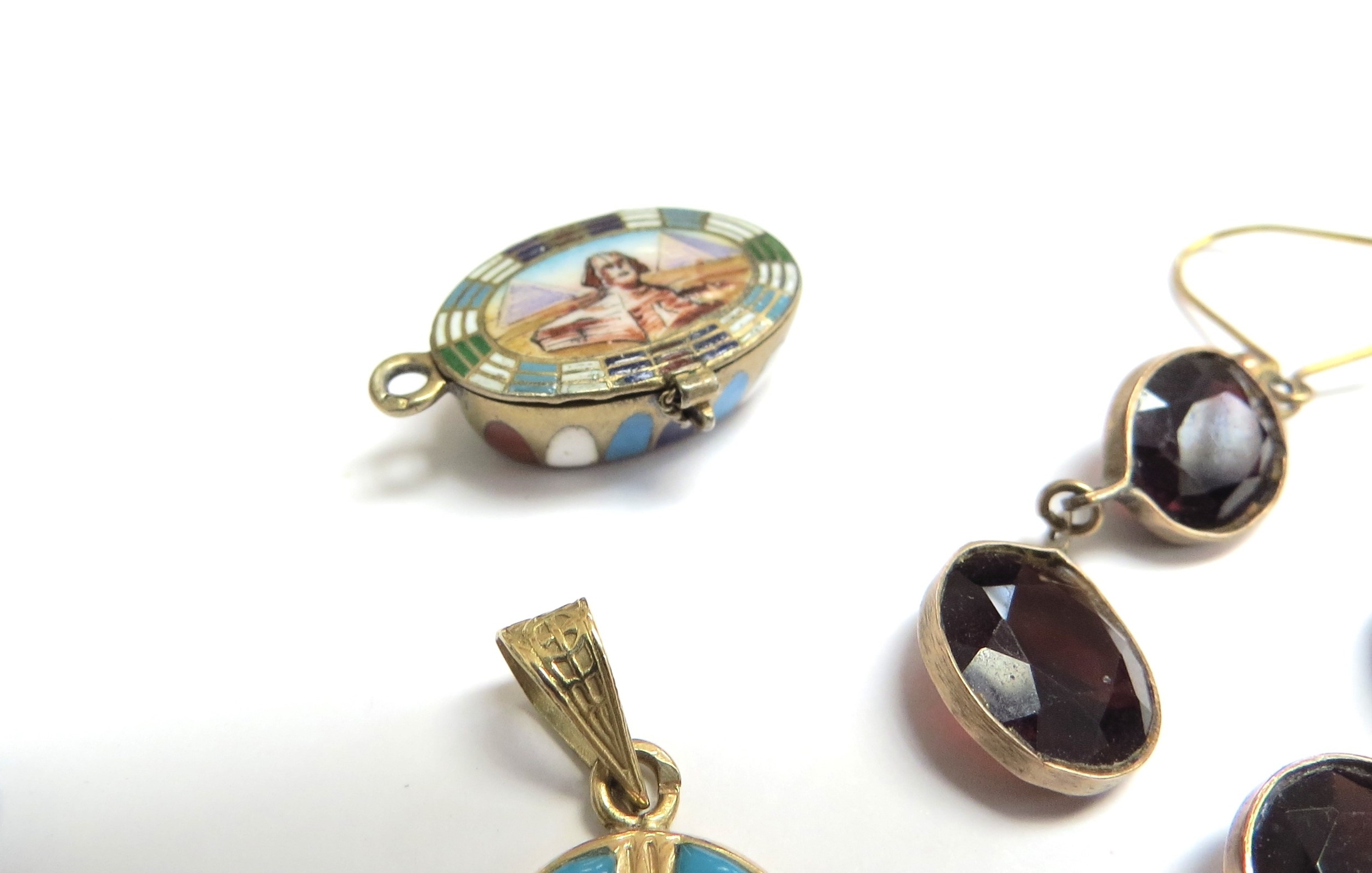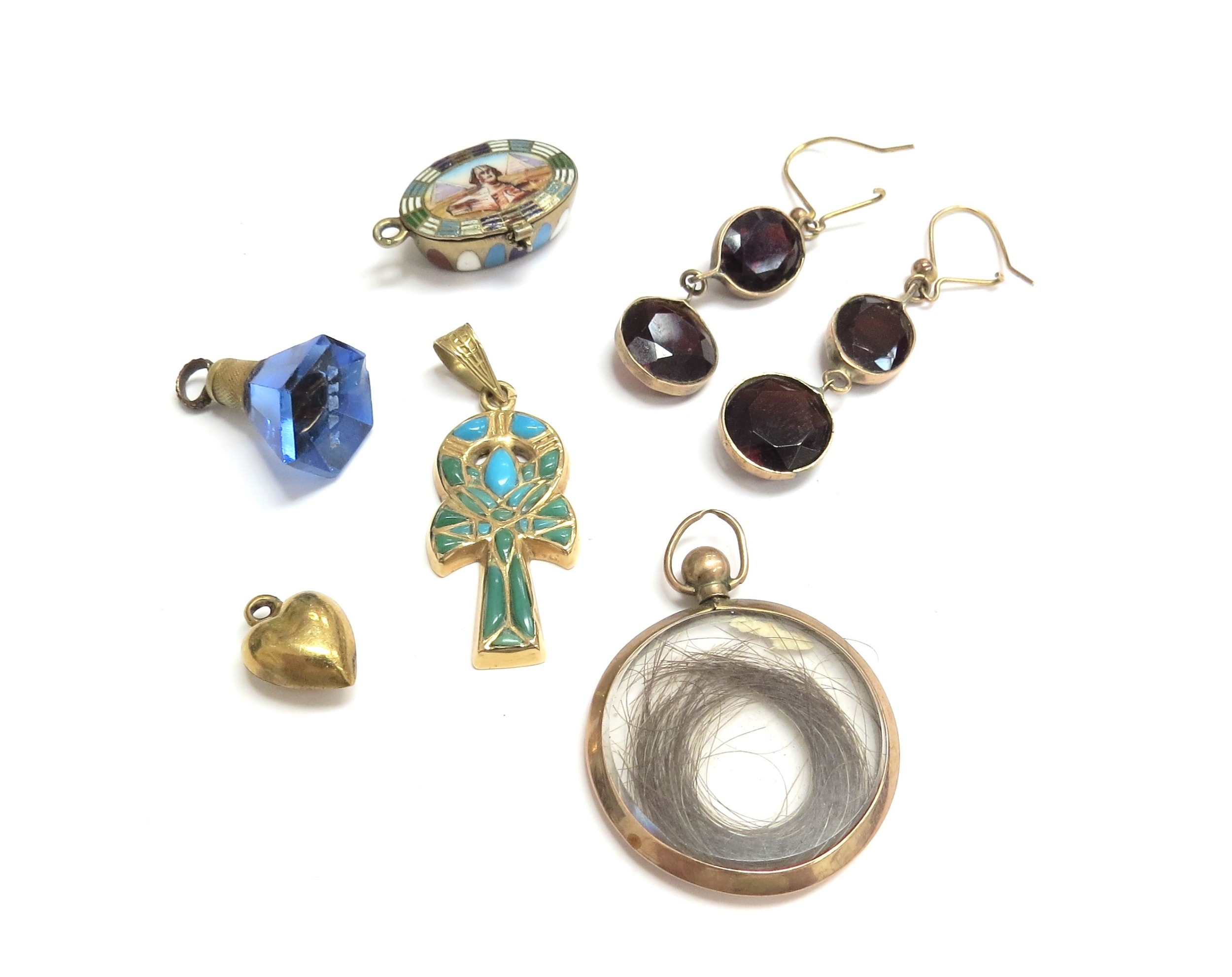 A pair of garnet coloured drop earrings, Egyptian charms, hair panel pendant etc