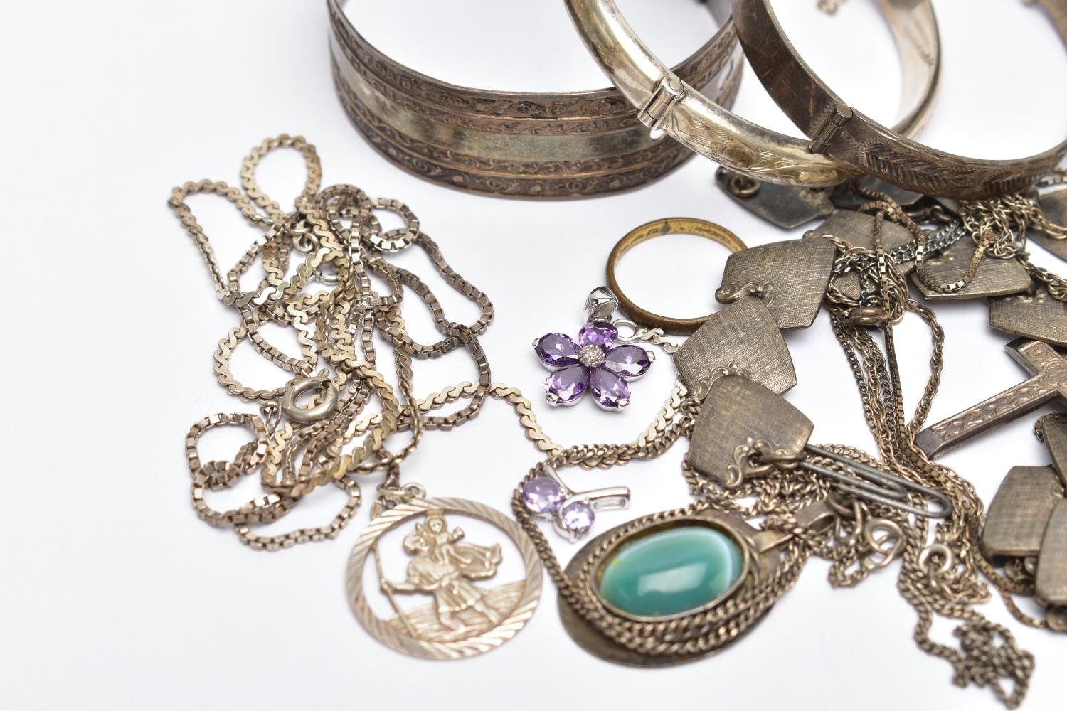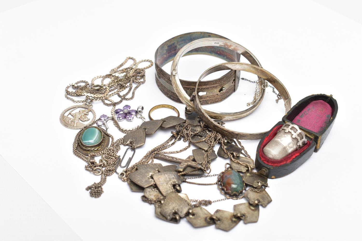 AN ASSORTMENT OF SILVER AND WHITE METAL JEWELLERY, to include a hinged silver domed bangle, engraved with foliage detailing, hallmarked Chester 1960, a hinged silver bangle, engraved with foliage detailing, hallmarked Birmingham 1988, a cased silver thimble, hallmark indistinguishable possibly Birmingham 1890, to include a silver pendant set with a banded agate, hallmarked Birmingham 1978, approximate gross weight 43.2 grams, together with a buckle bangle stamped sterling silver, and a selection of other white metal jewellery items, approximate gross weight 83.6 grams (condition report: general moderate wear, distortion to buckle bangle)