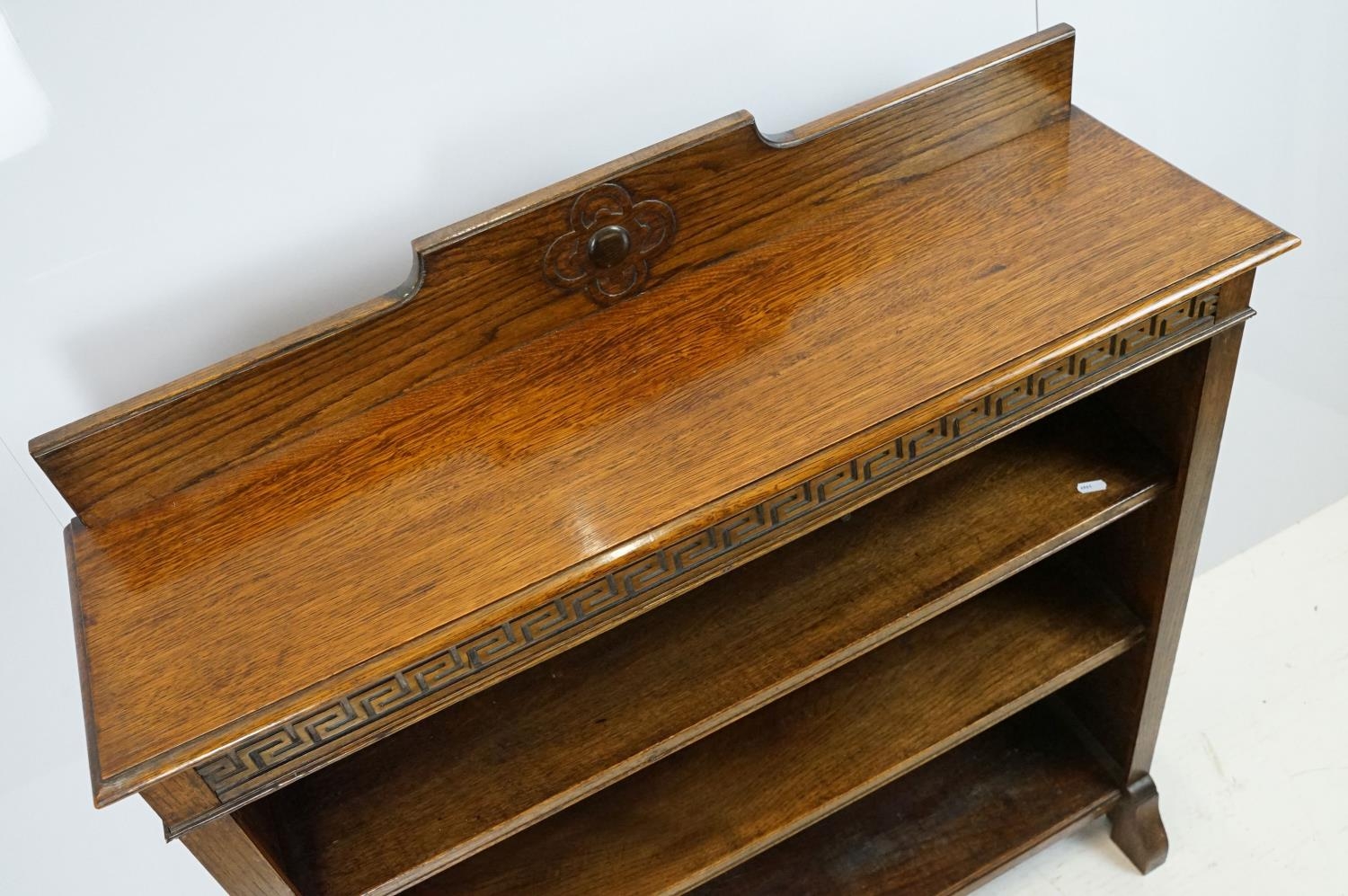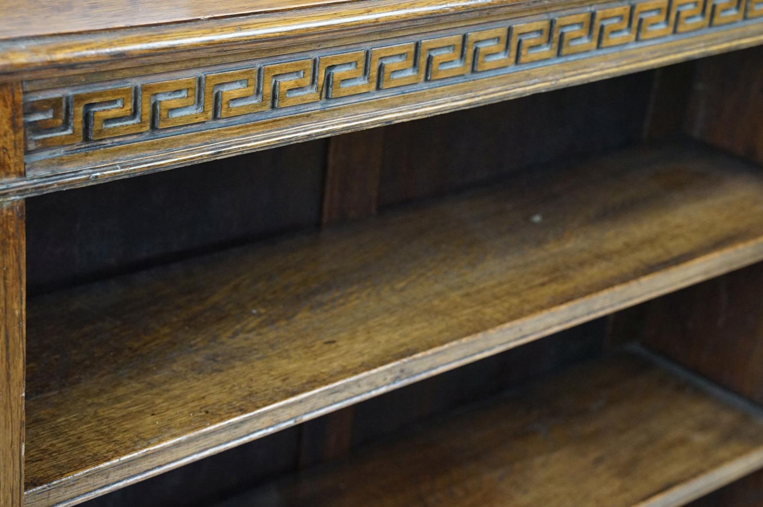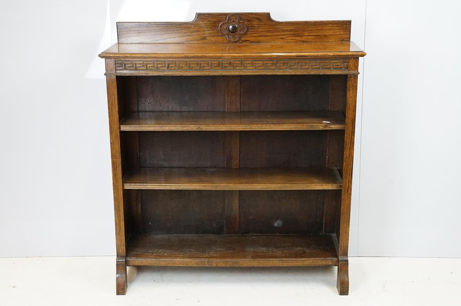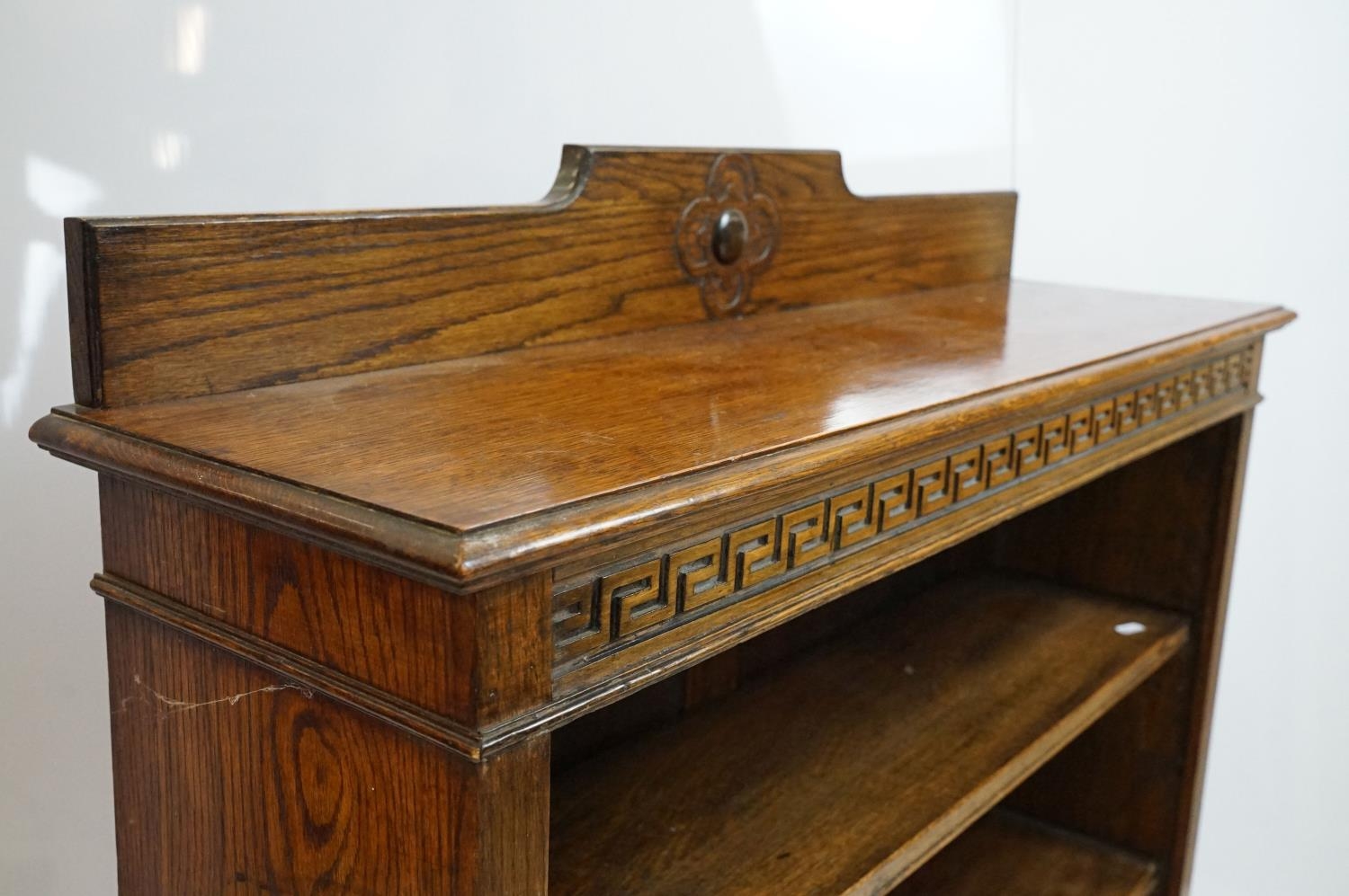 Oak three shelf bookcase with Greek key frieze design, 102cm high x 92cm wide x 26cm deep
