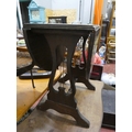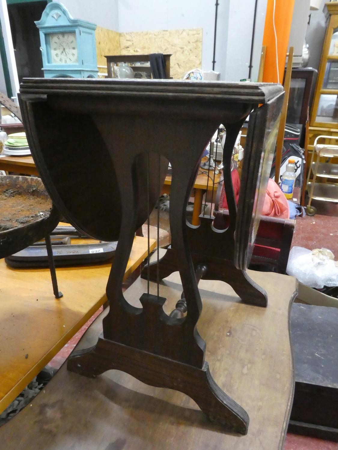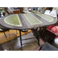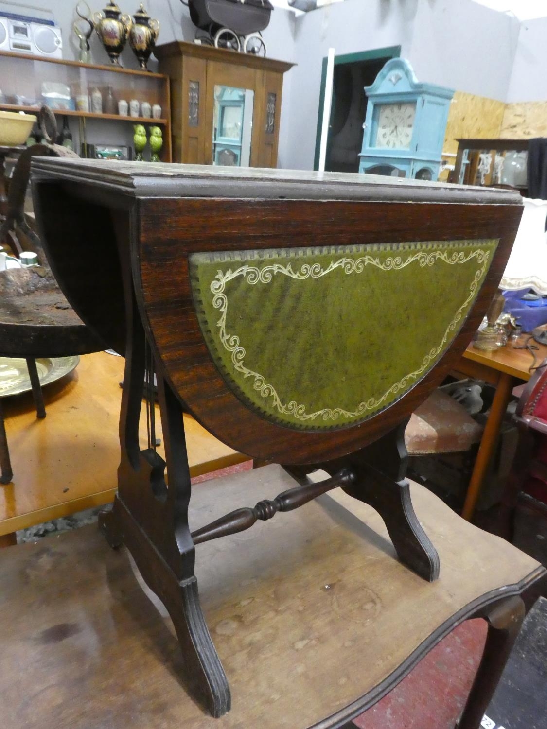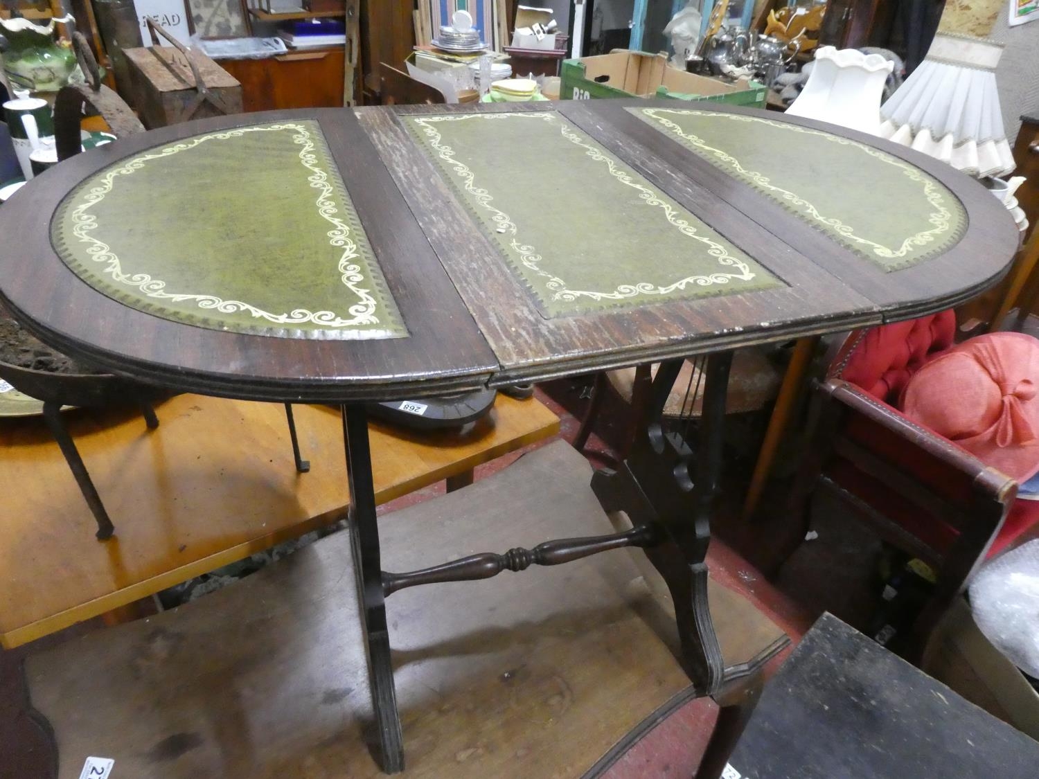 A small drop leaf table with leather top.