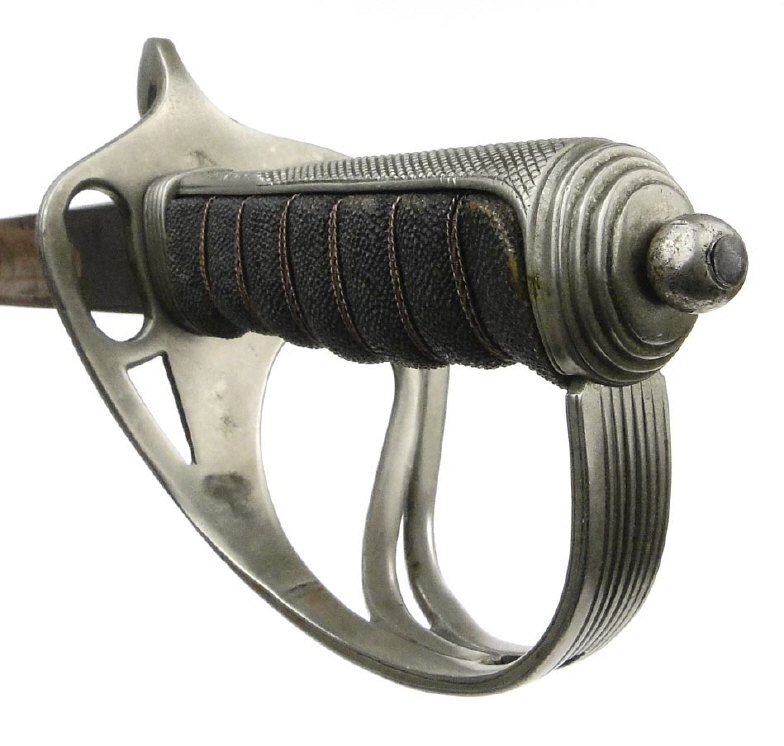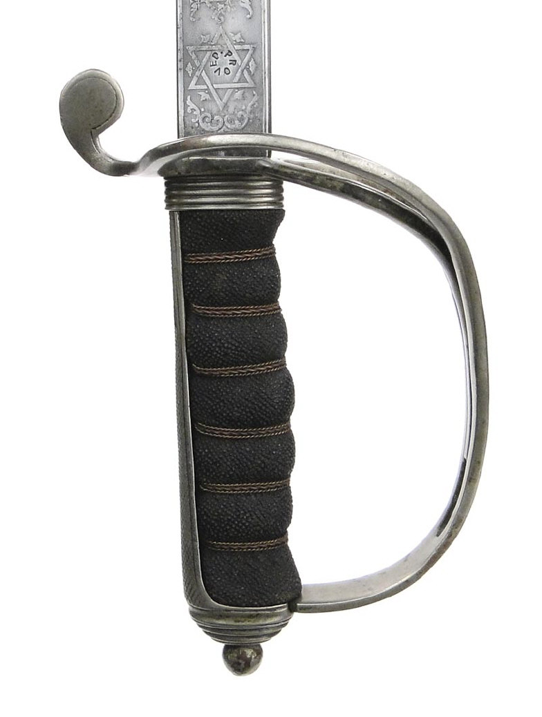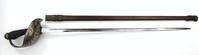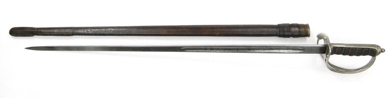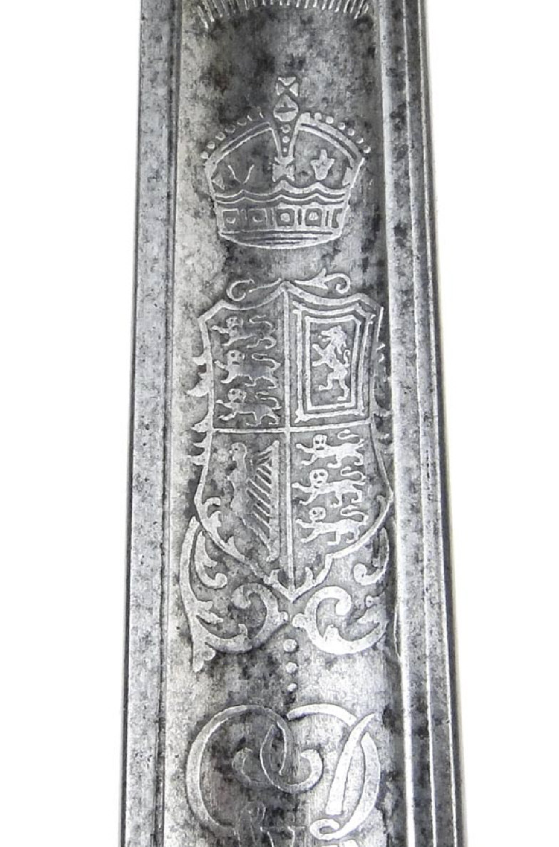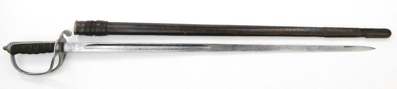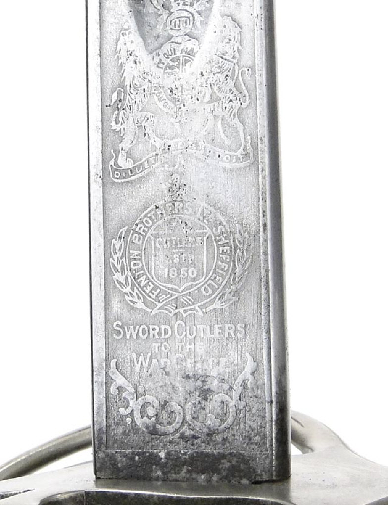 George V British military dress sword with chased blades by Fenton Brothers, Sheffield, wire bound simulated shagreen grip and leather mounted sheath, approximately 100cm in length