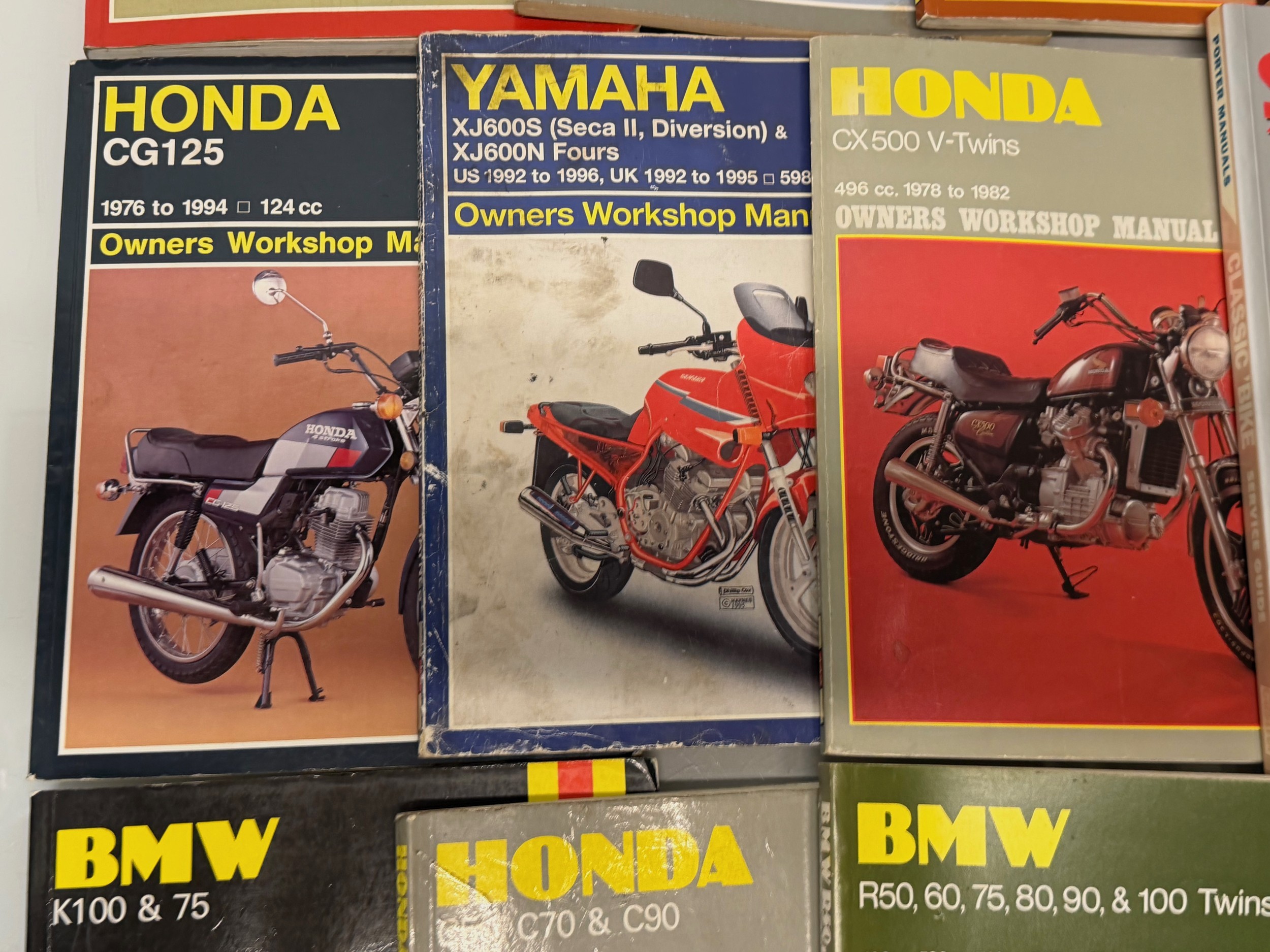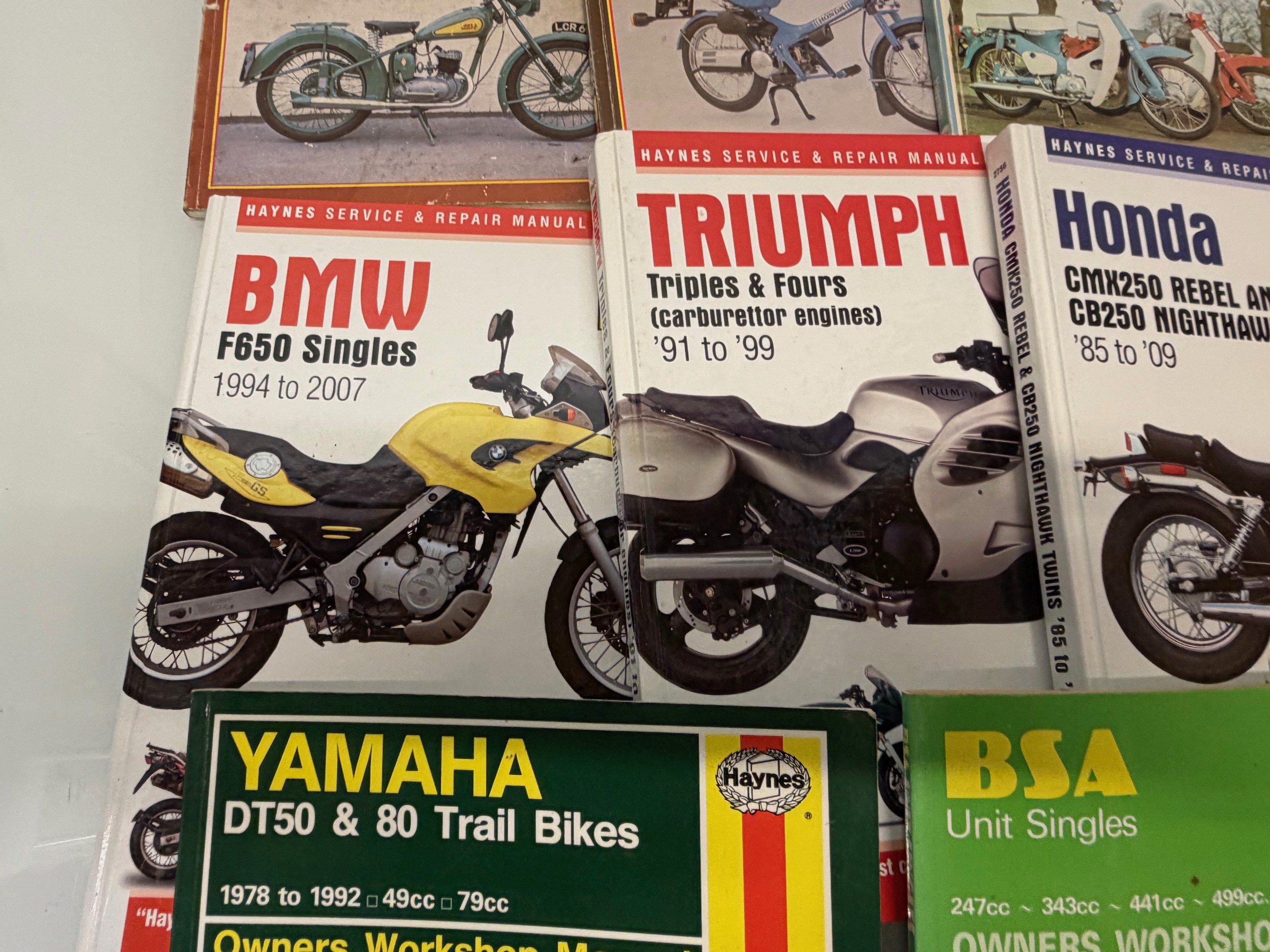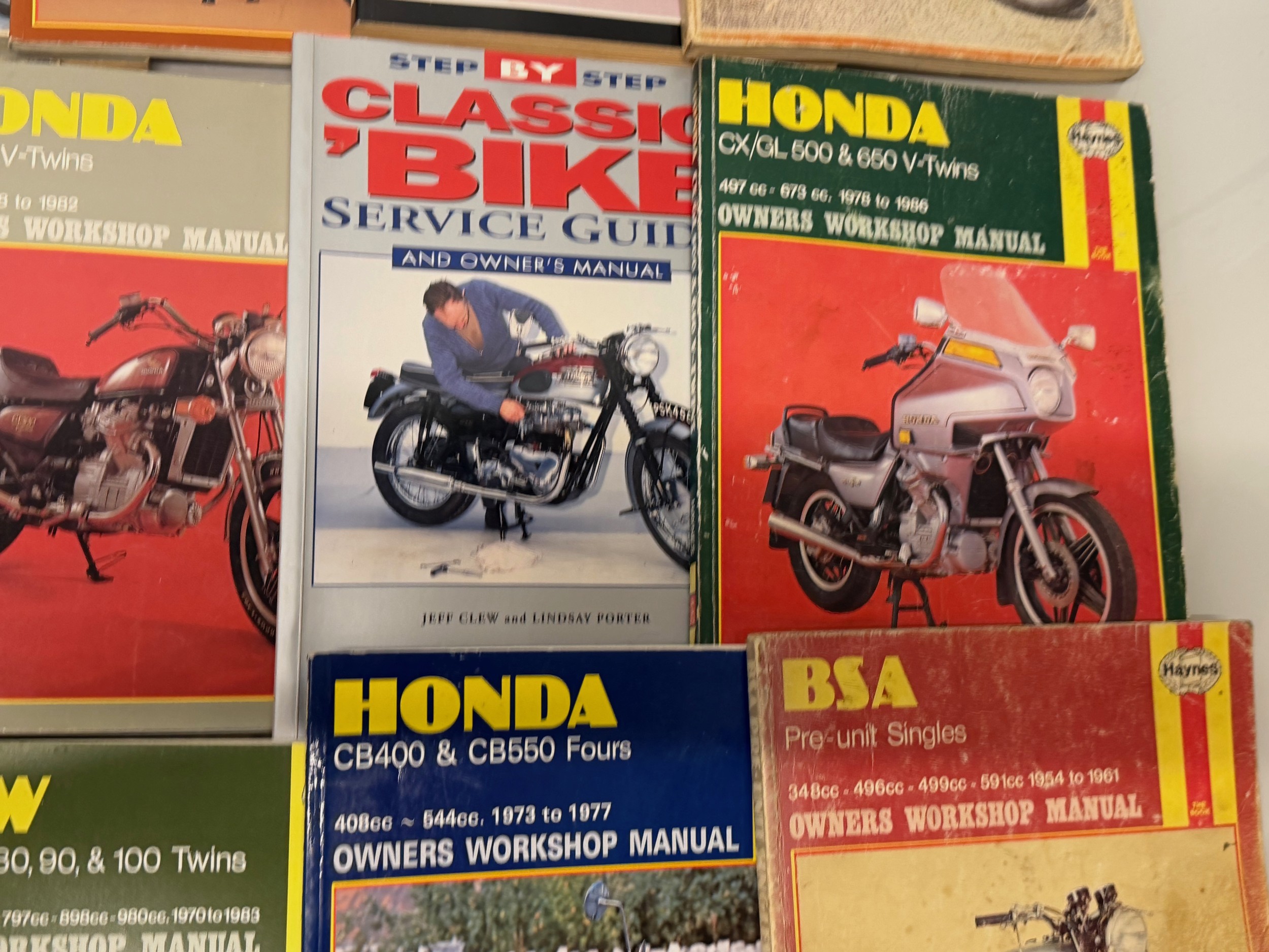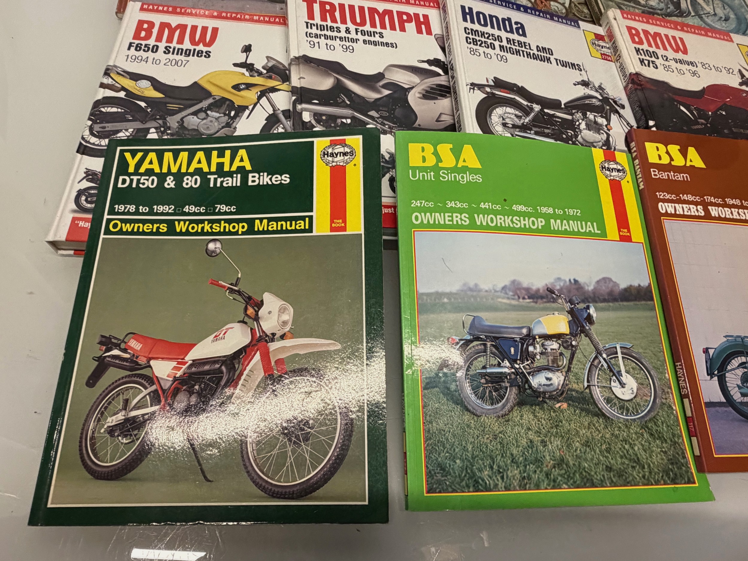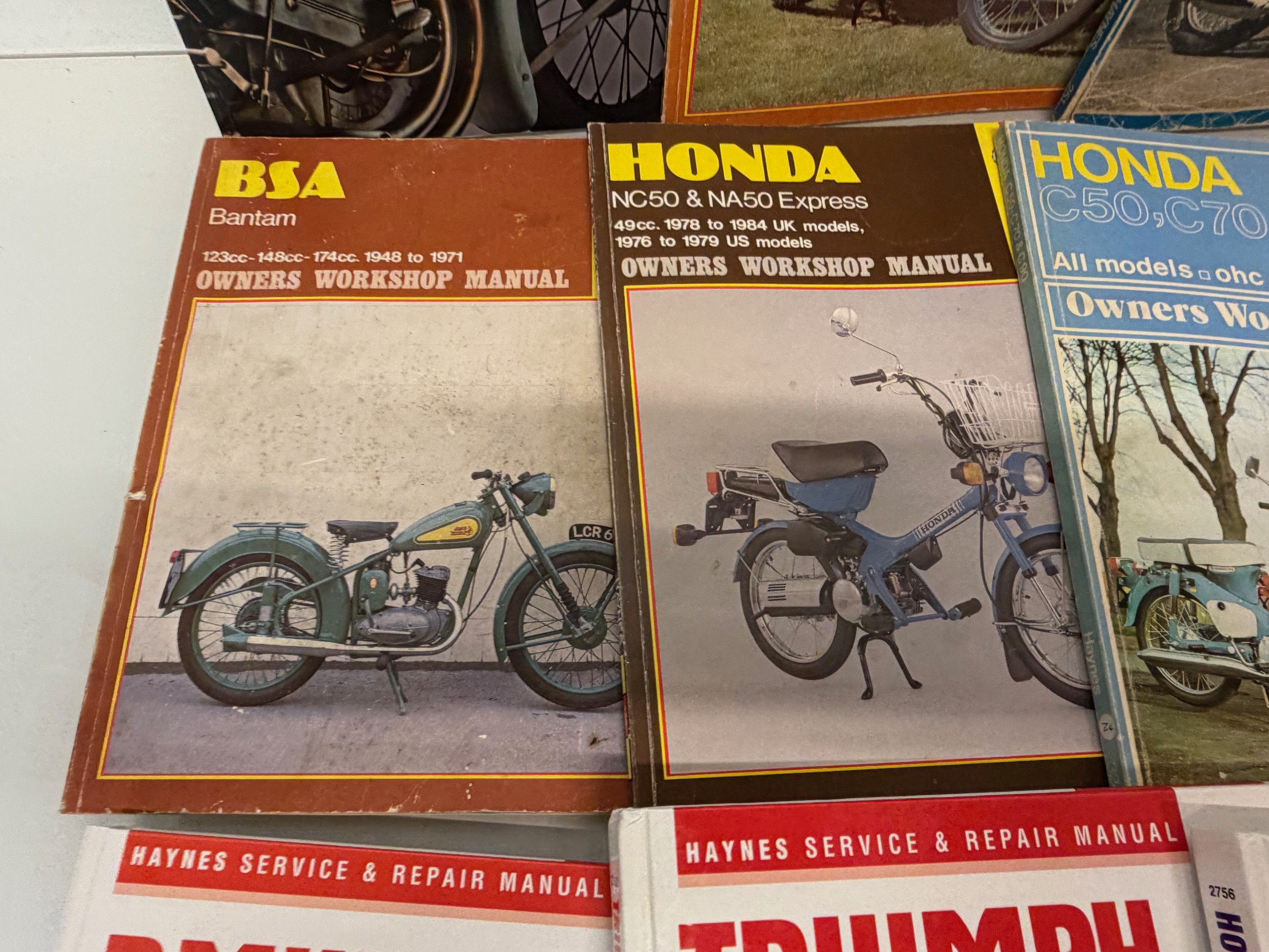 Automobilia, workshop equipment, a collection of motorcycle repair manuals, Haynes etc, 47 in all.