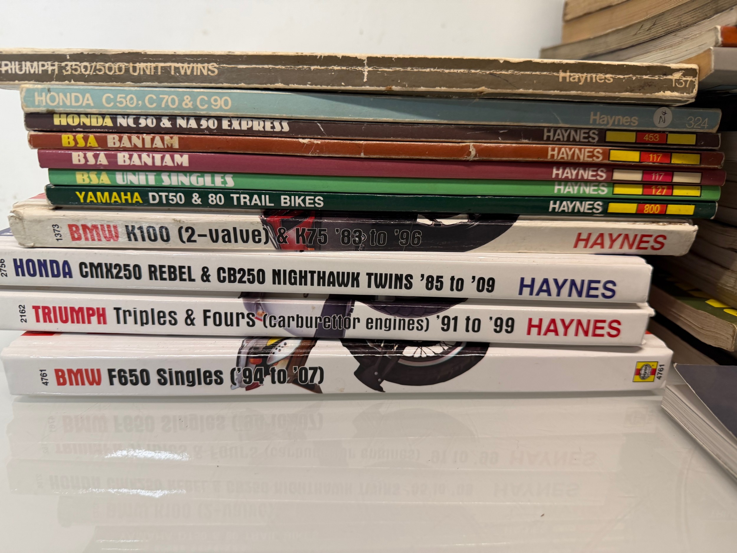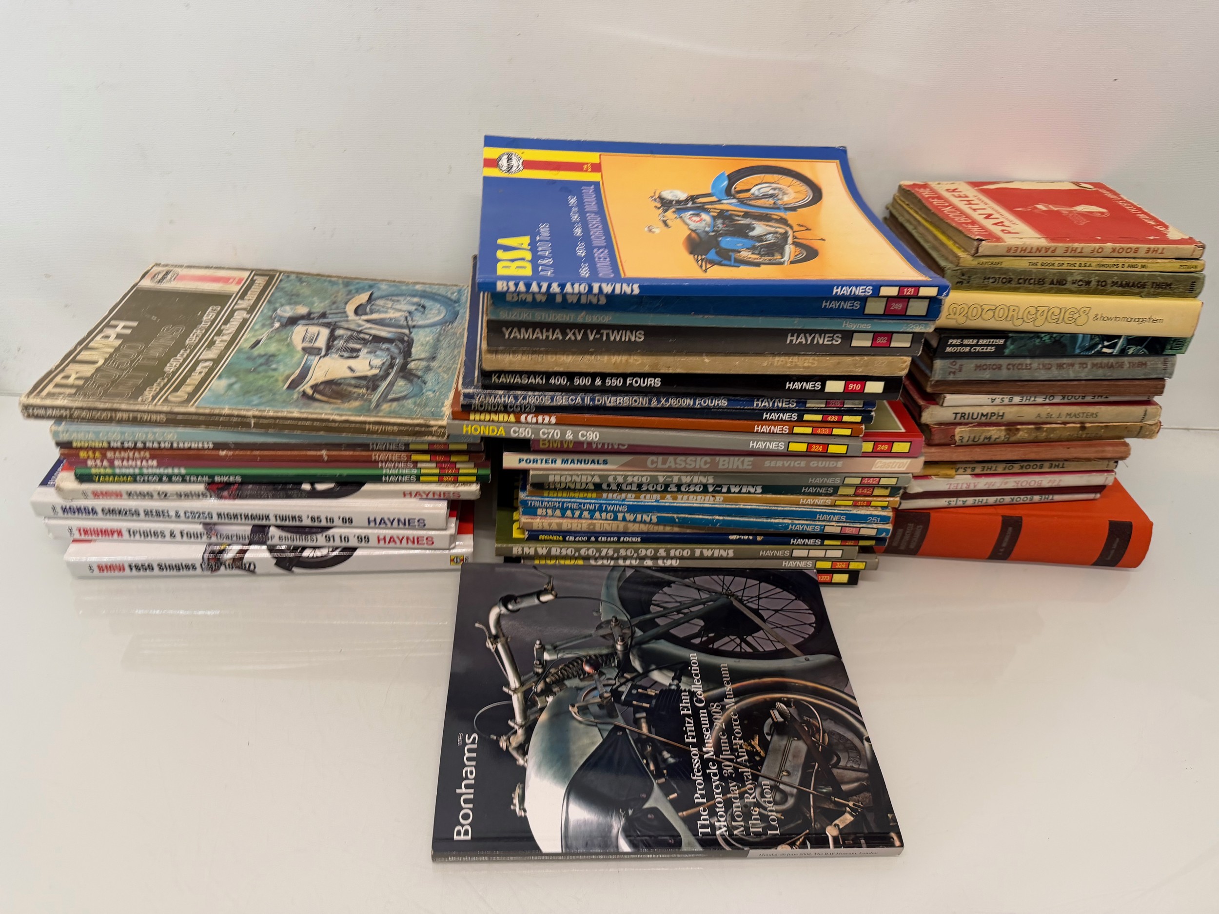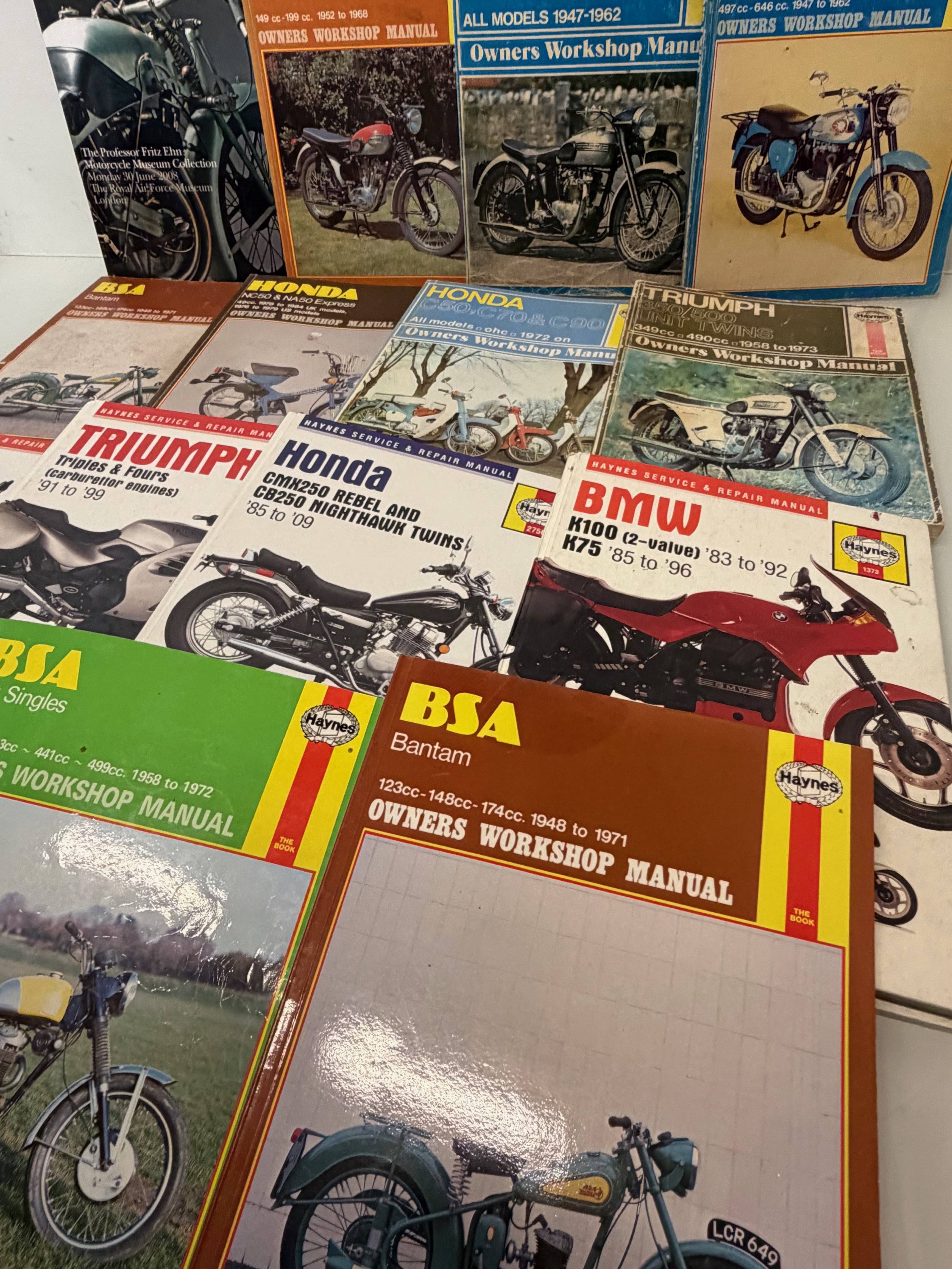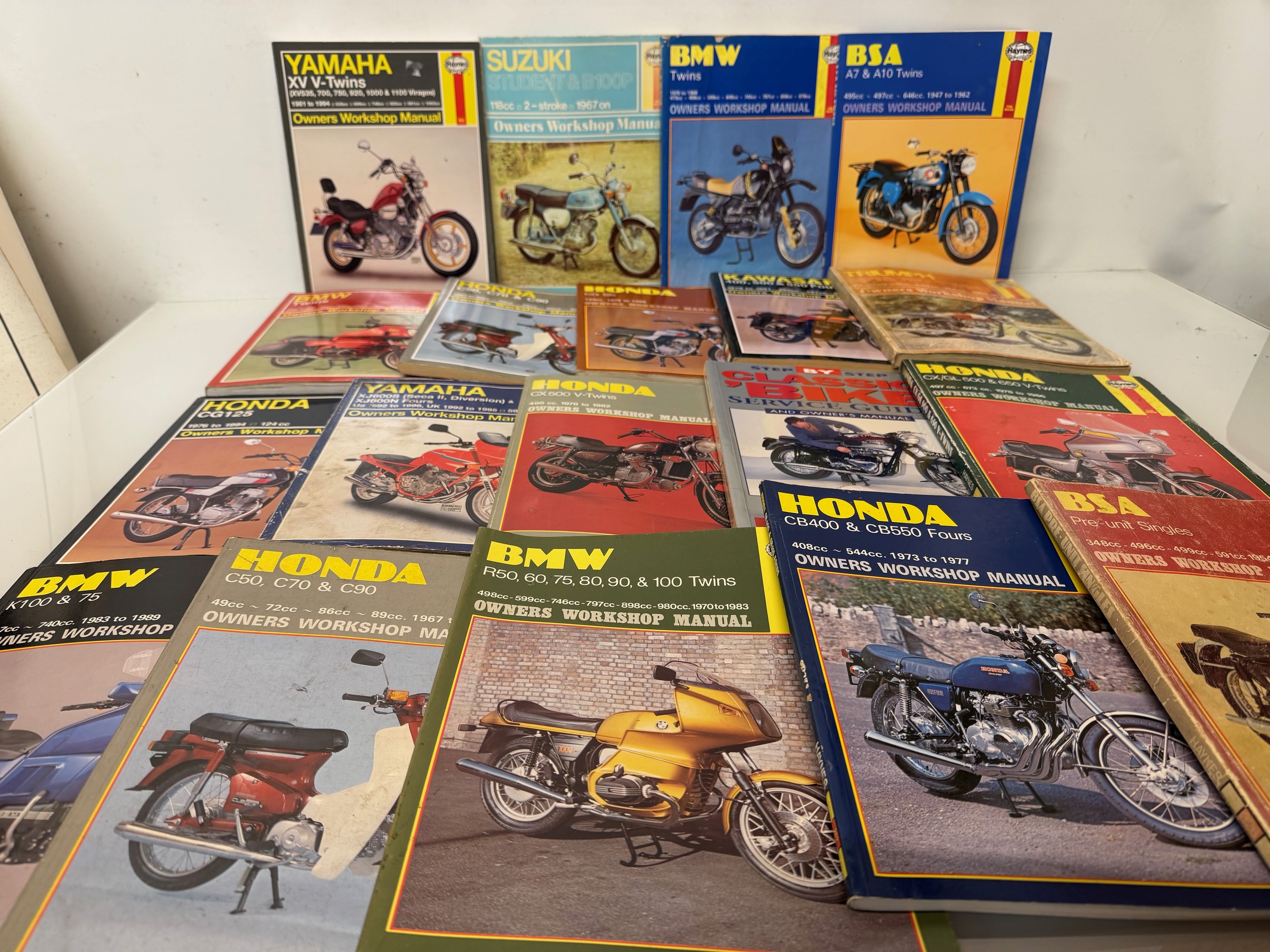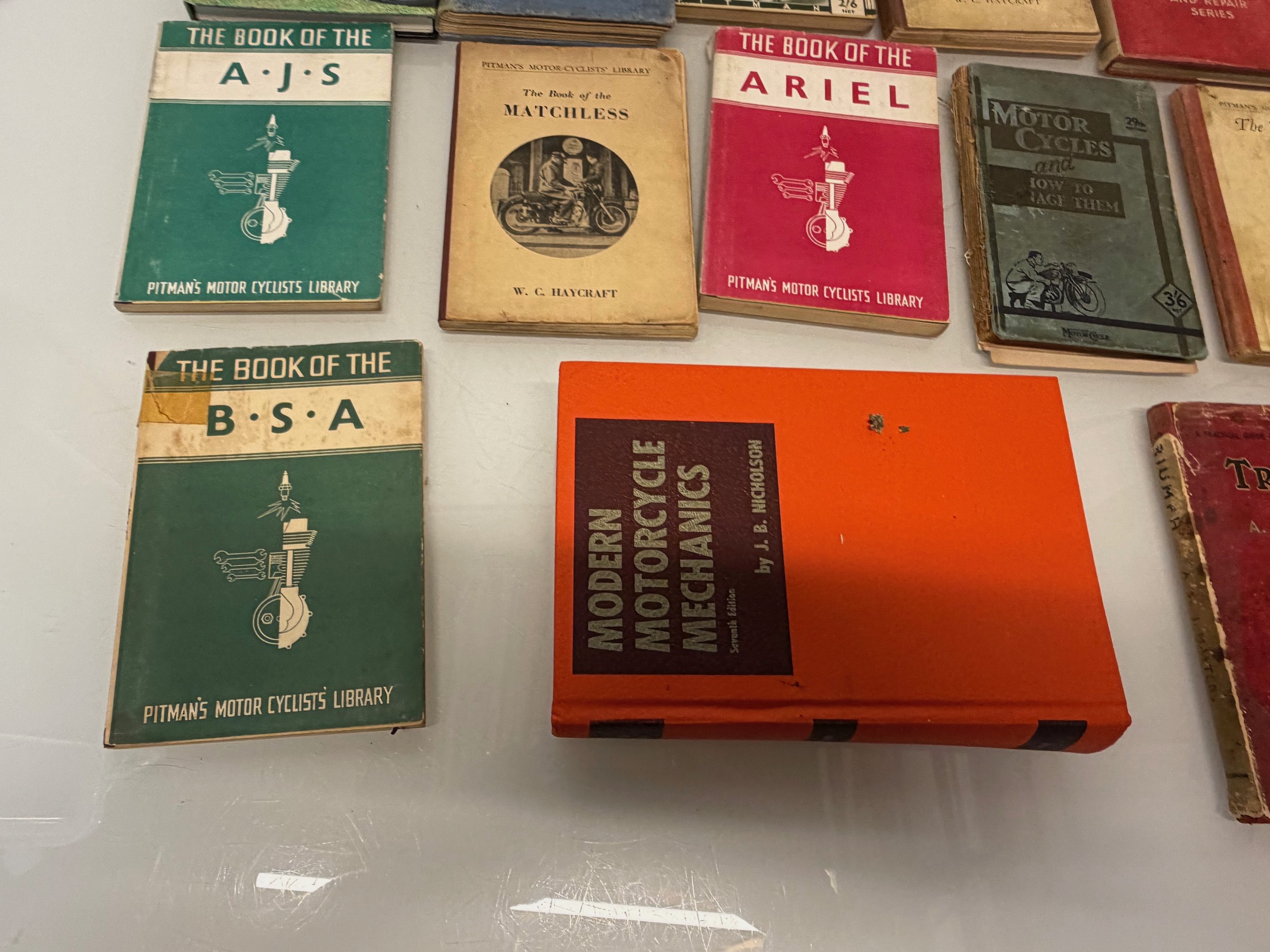 Automobilia, workshop equipment, a collection of motorcycle repair manuals, Haynes etc, 47 in all.