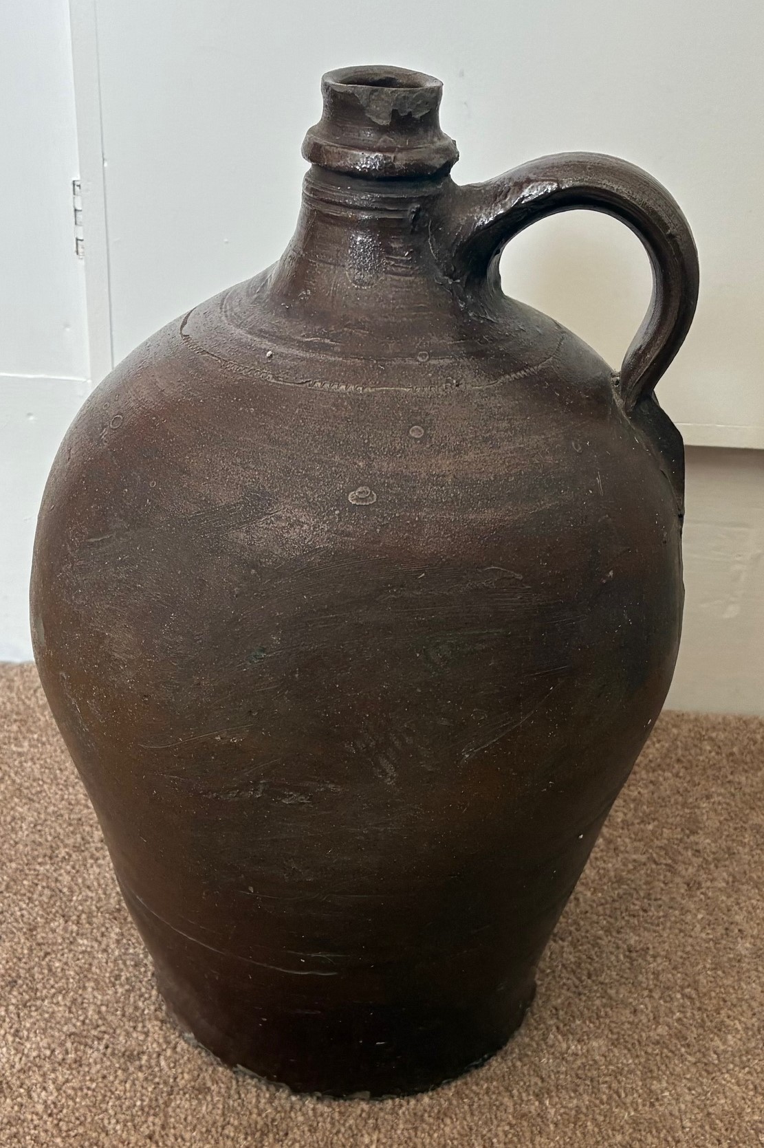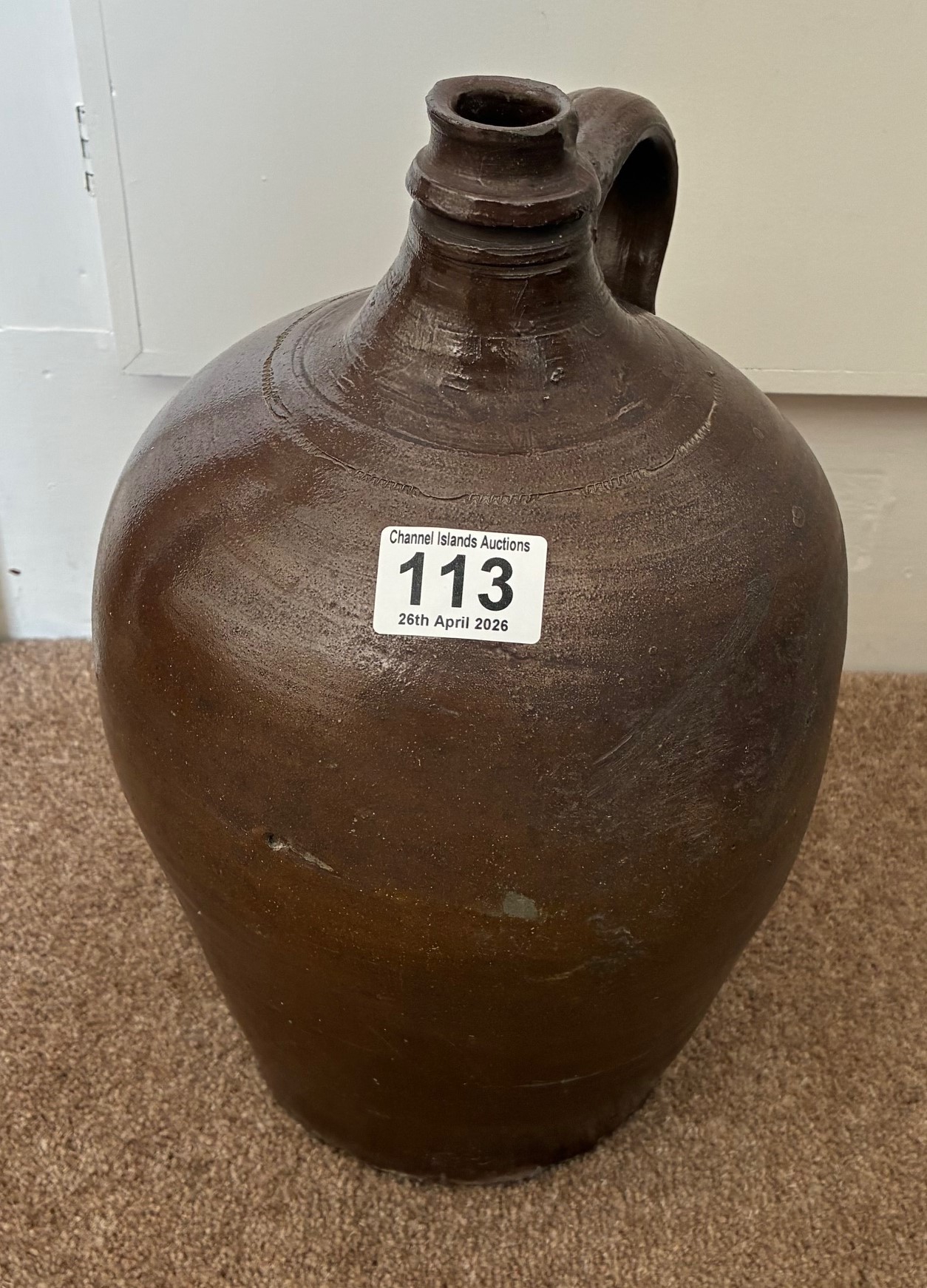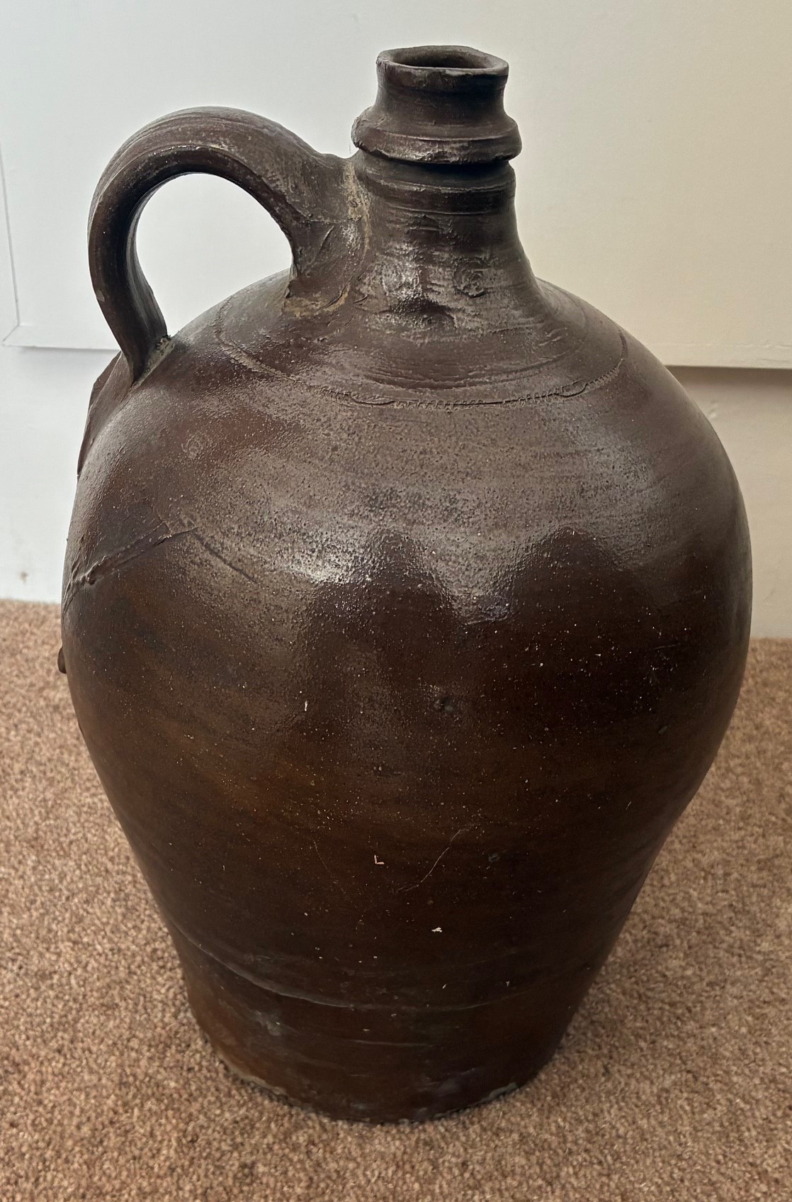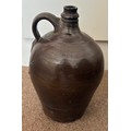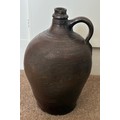 A salt glazed stoneware cider flagon, French 19th century, with ring handle and incised decoration, 31cm high.
