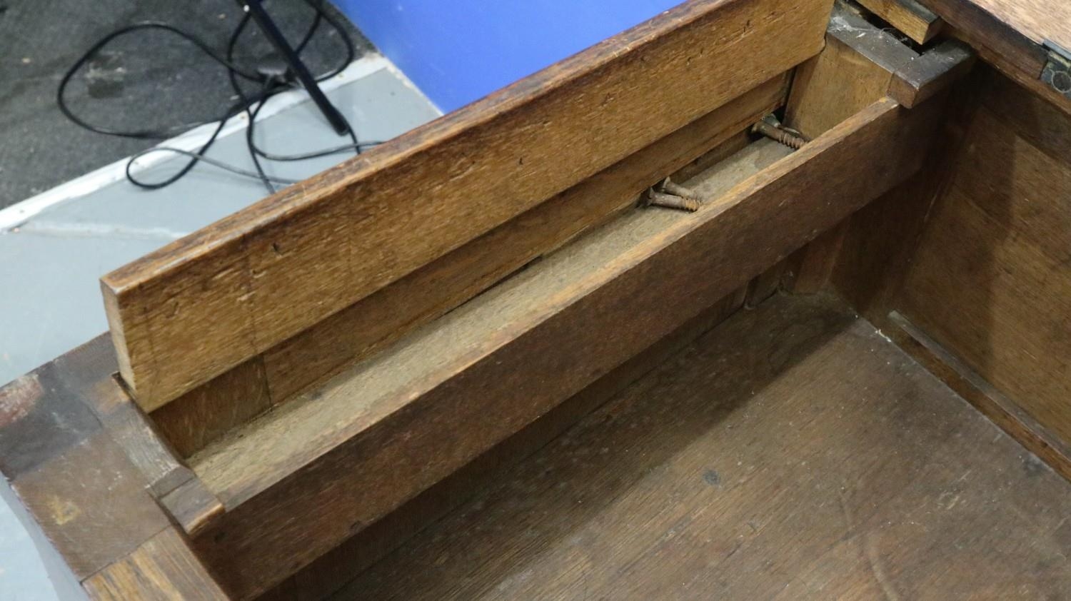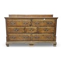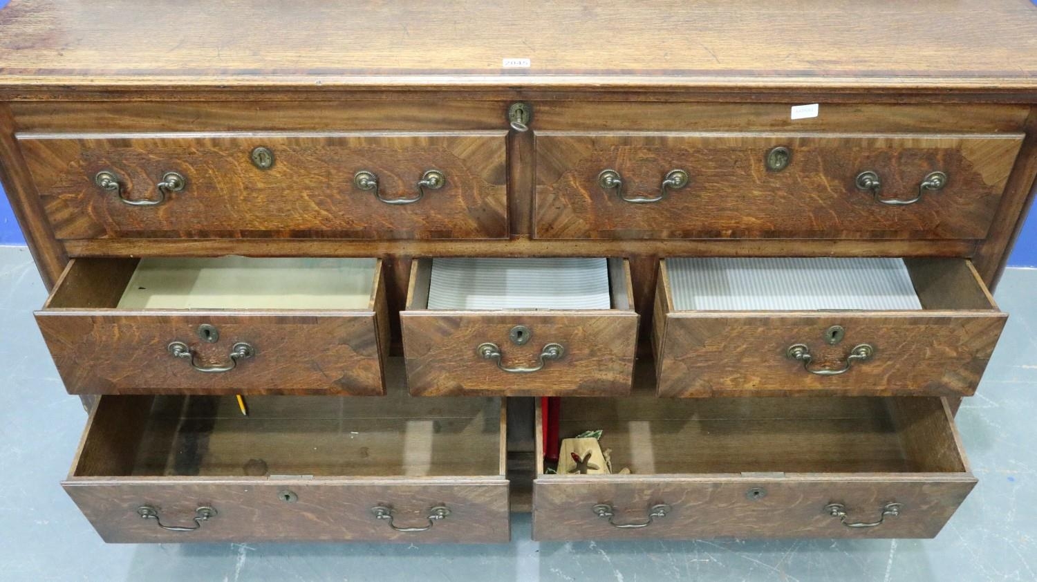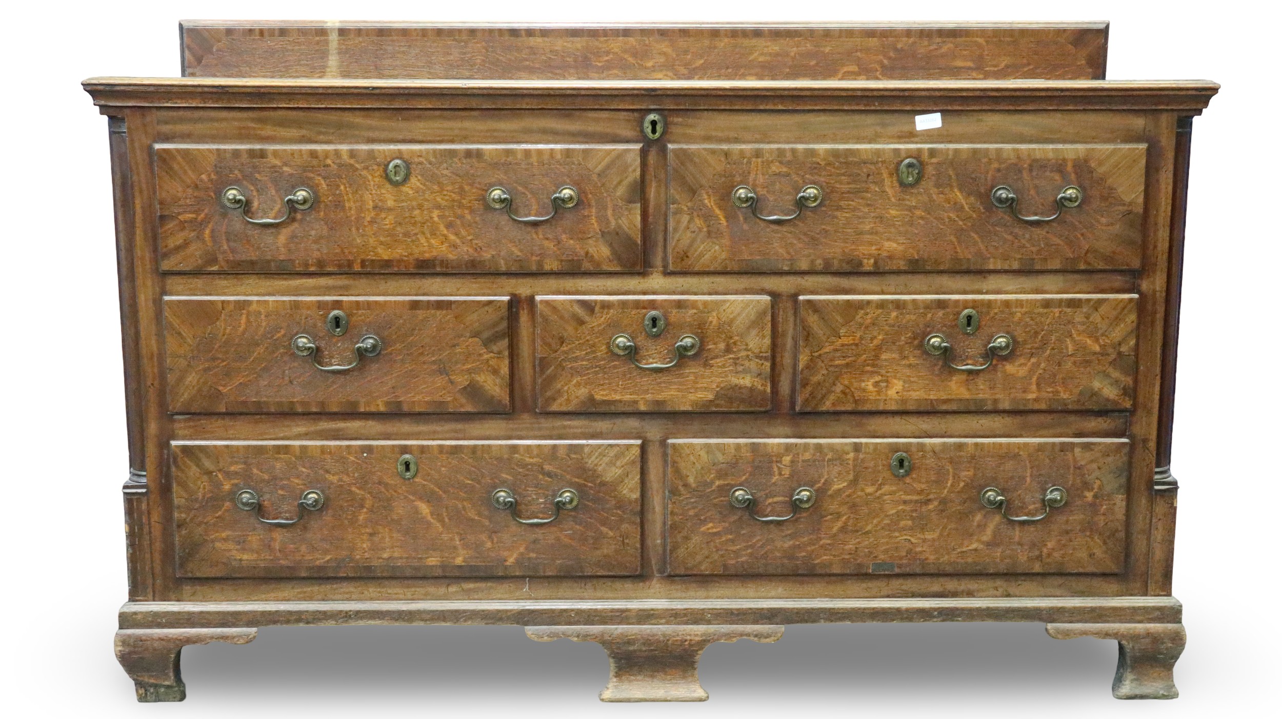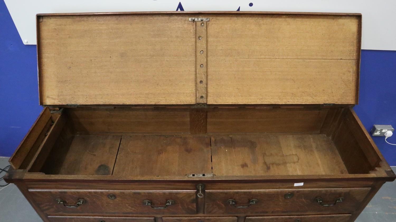 Early 19th century crossbanded oak Lancashire mule chest, 170 x 55 x 108cm. Not available for in-house P&P