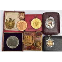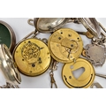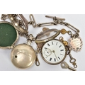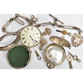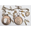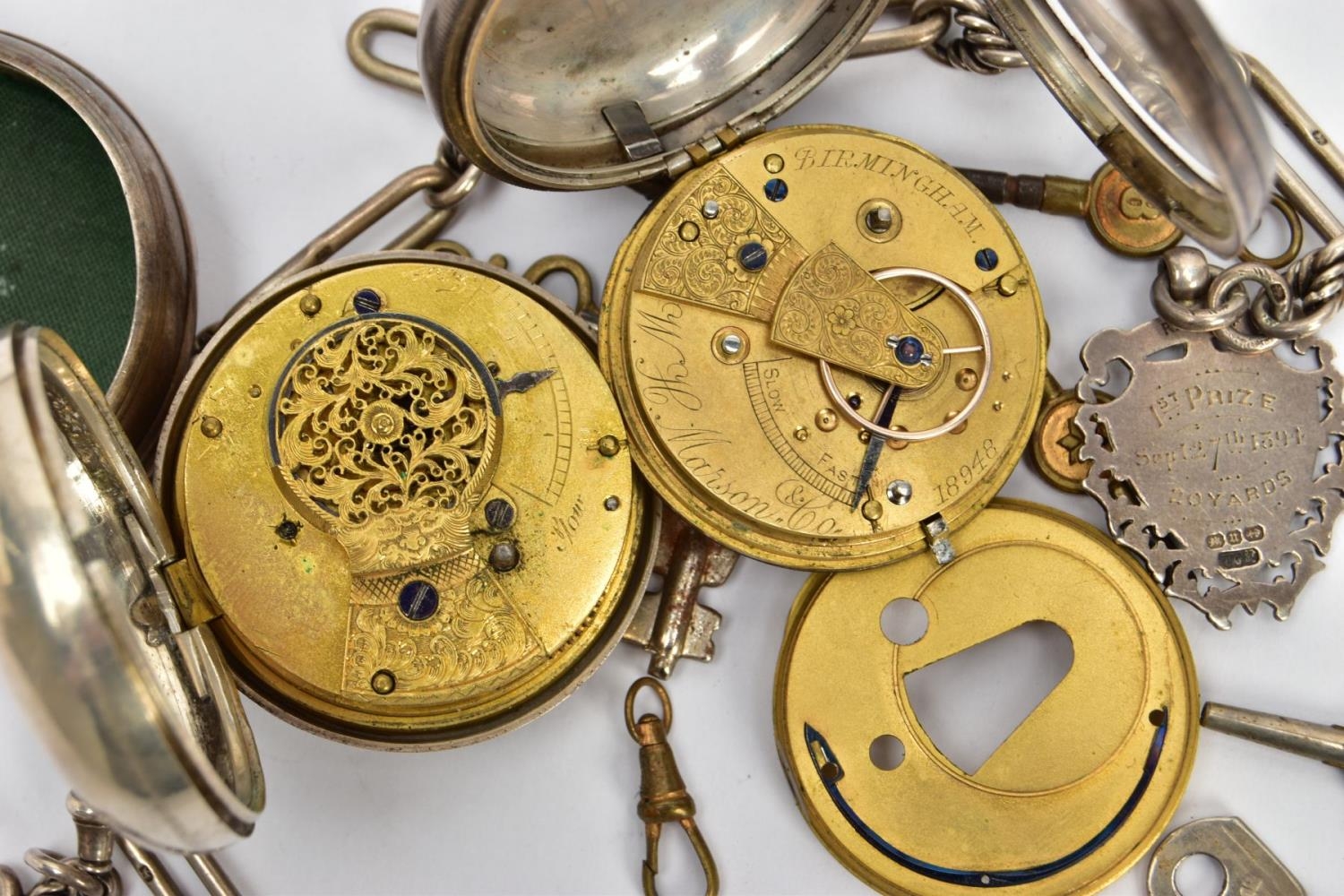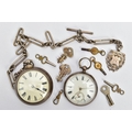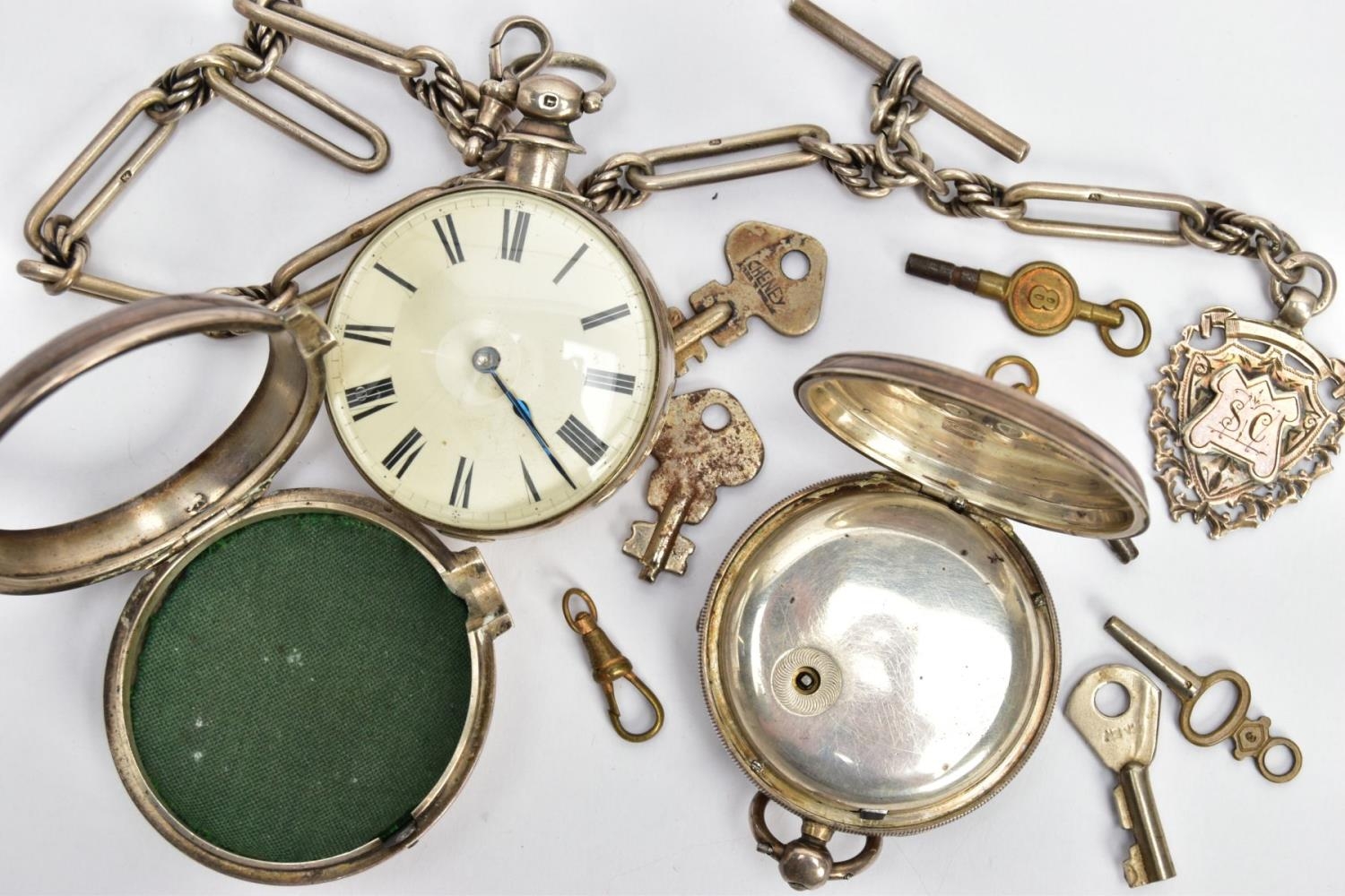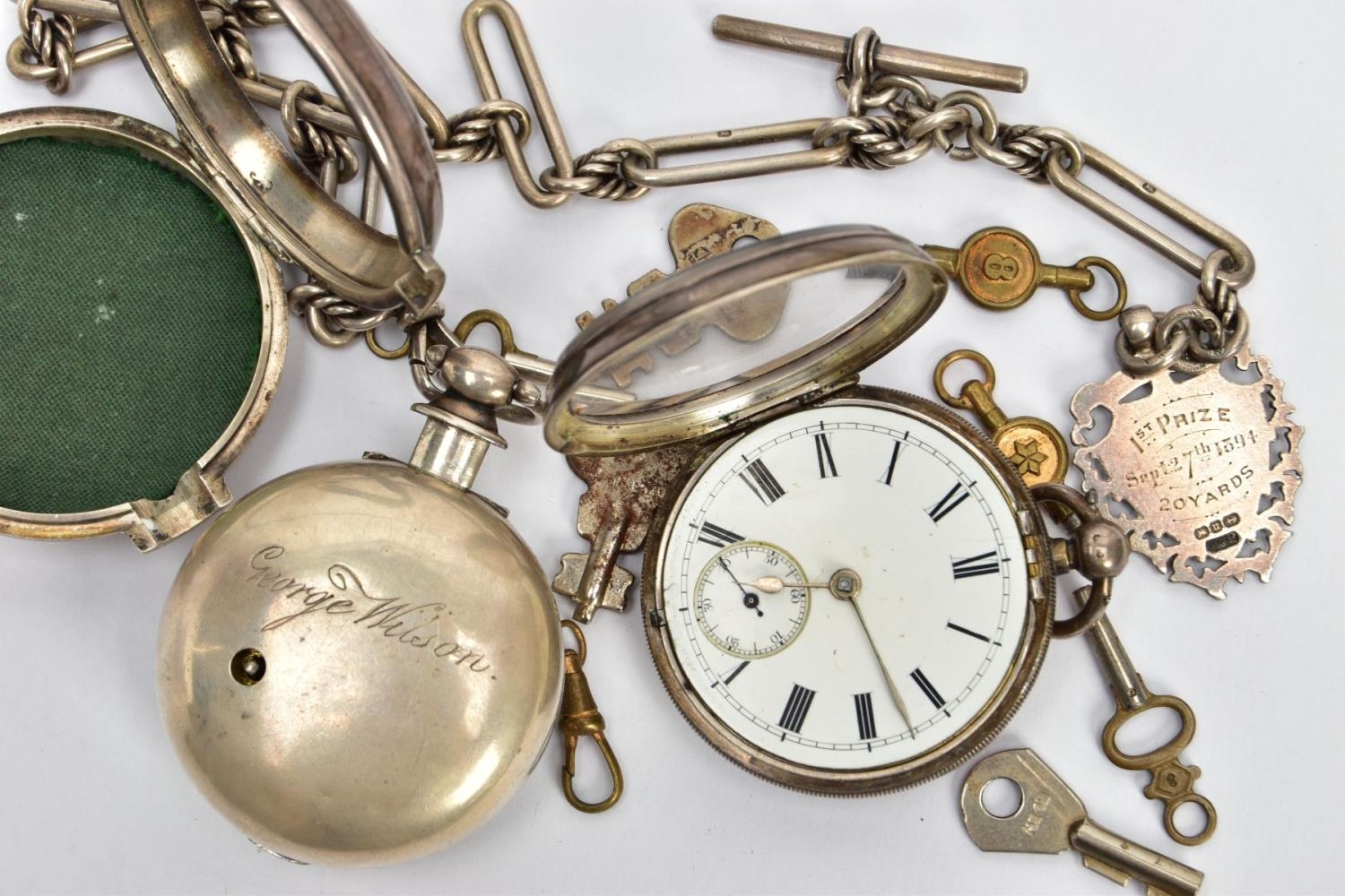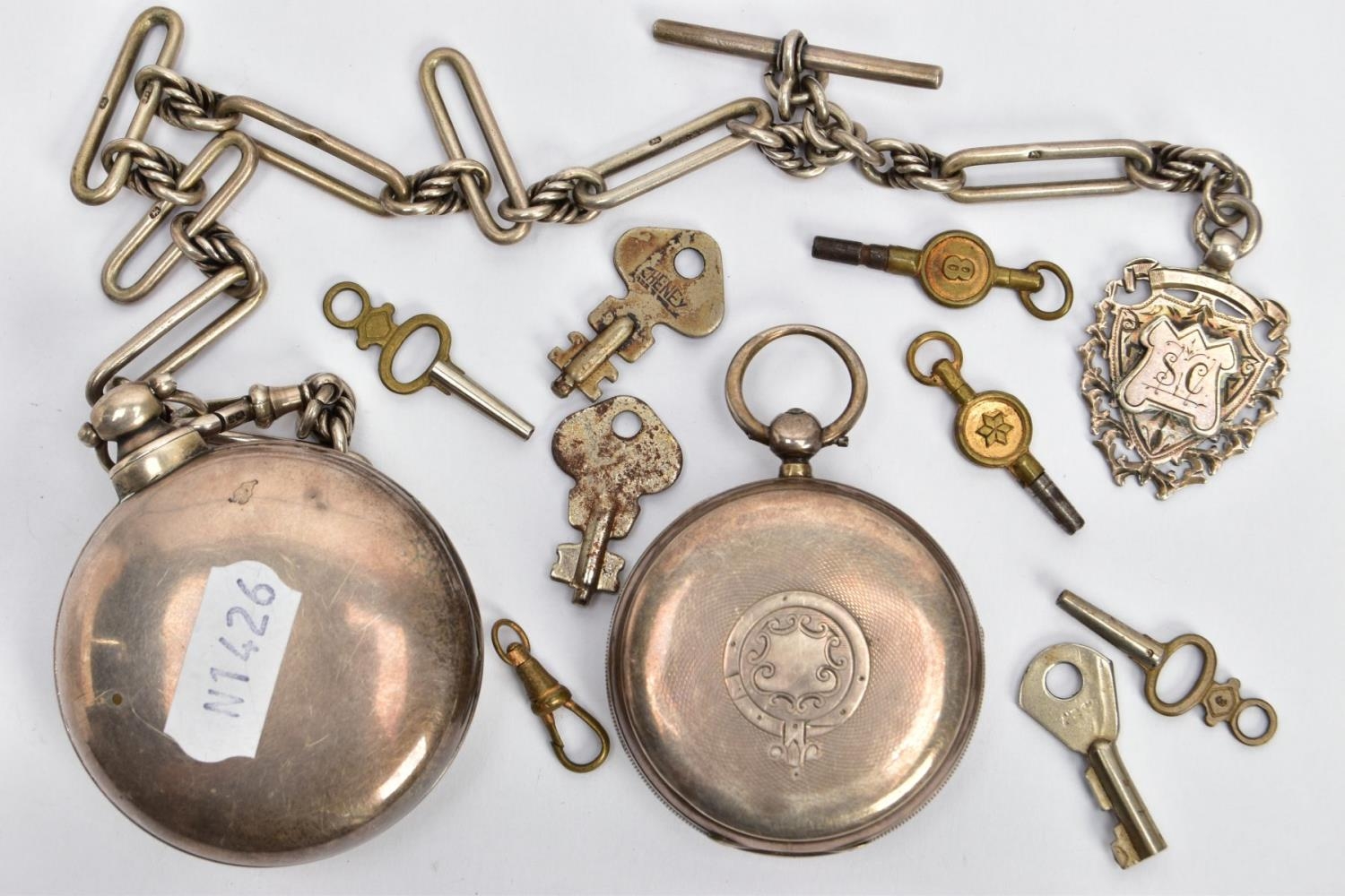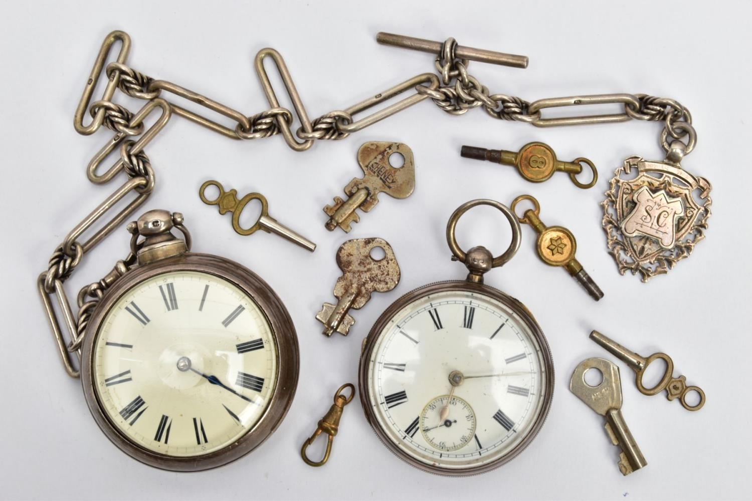 TWO SILVER CASED POCKET WATCHES, the first an open face pocket watch, white dial, Romal numerals, subsidiary seconds dial at the six o'clock position, approximate width 49mm, case back detailed with a vacant cartouche, inside case back hallmarked Charles Harris Birmingham 1893, the second open face pocket watch, white dial, Roman numerals, approximate width 48mm, case back engraved 'George Wilson', inside case back hallmarked Joseph Harris Birmingham 1836, together with an additional case, hallmarked Joseph Harris Birmingham 1836, fitted with a silver albert chain hallmarked silver suspending a silver medallion, hallmarked Birmingham 1894, approximate gross weight 310.4 grams, also including a selection of watch keys (condition report: general moderate wear, currently not running, not tested)