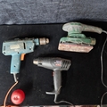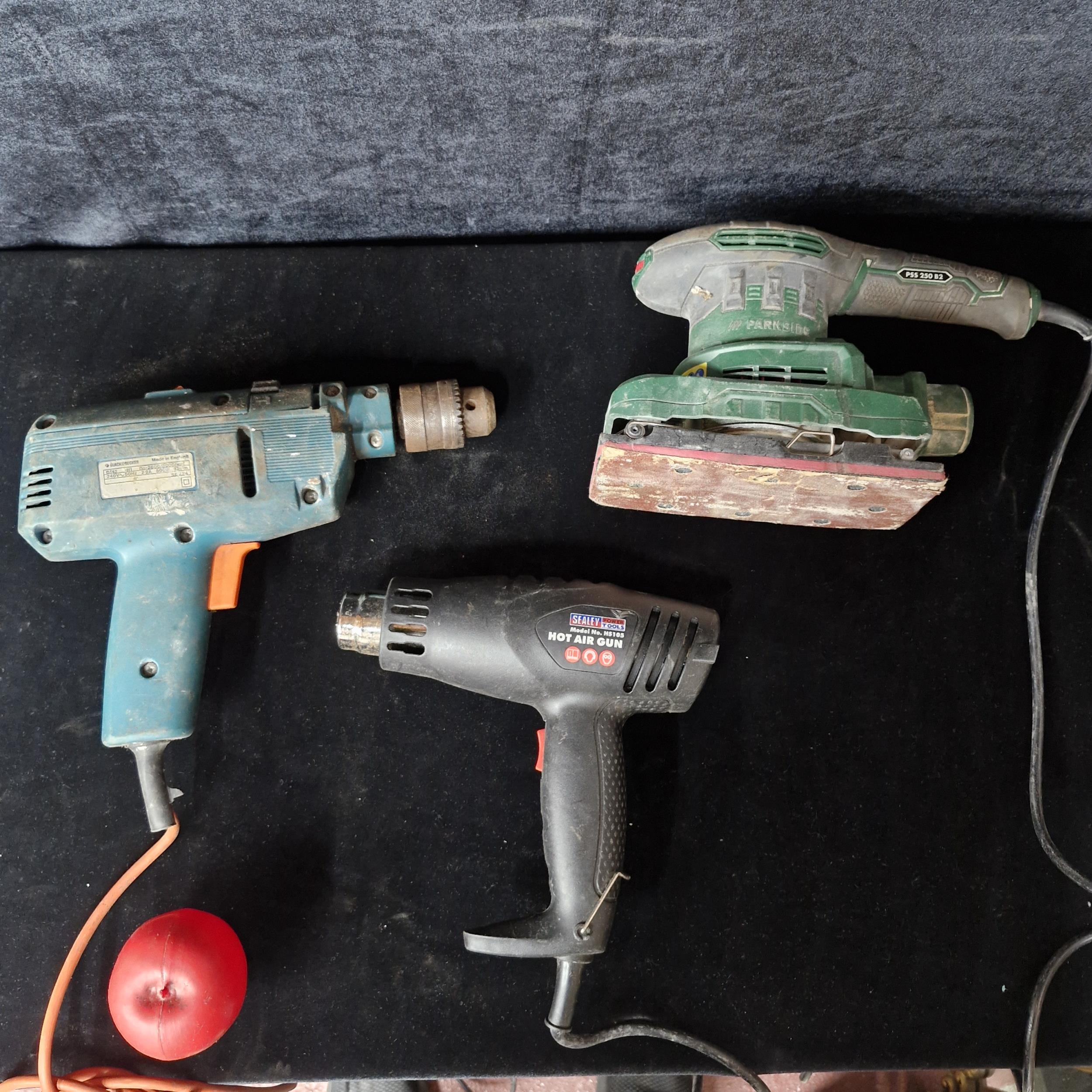 Three high quality power tools including a handheld electric sander, a Sealy hot air gun and a Black & Decker drill.