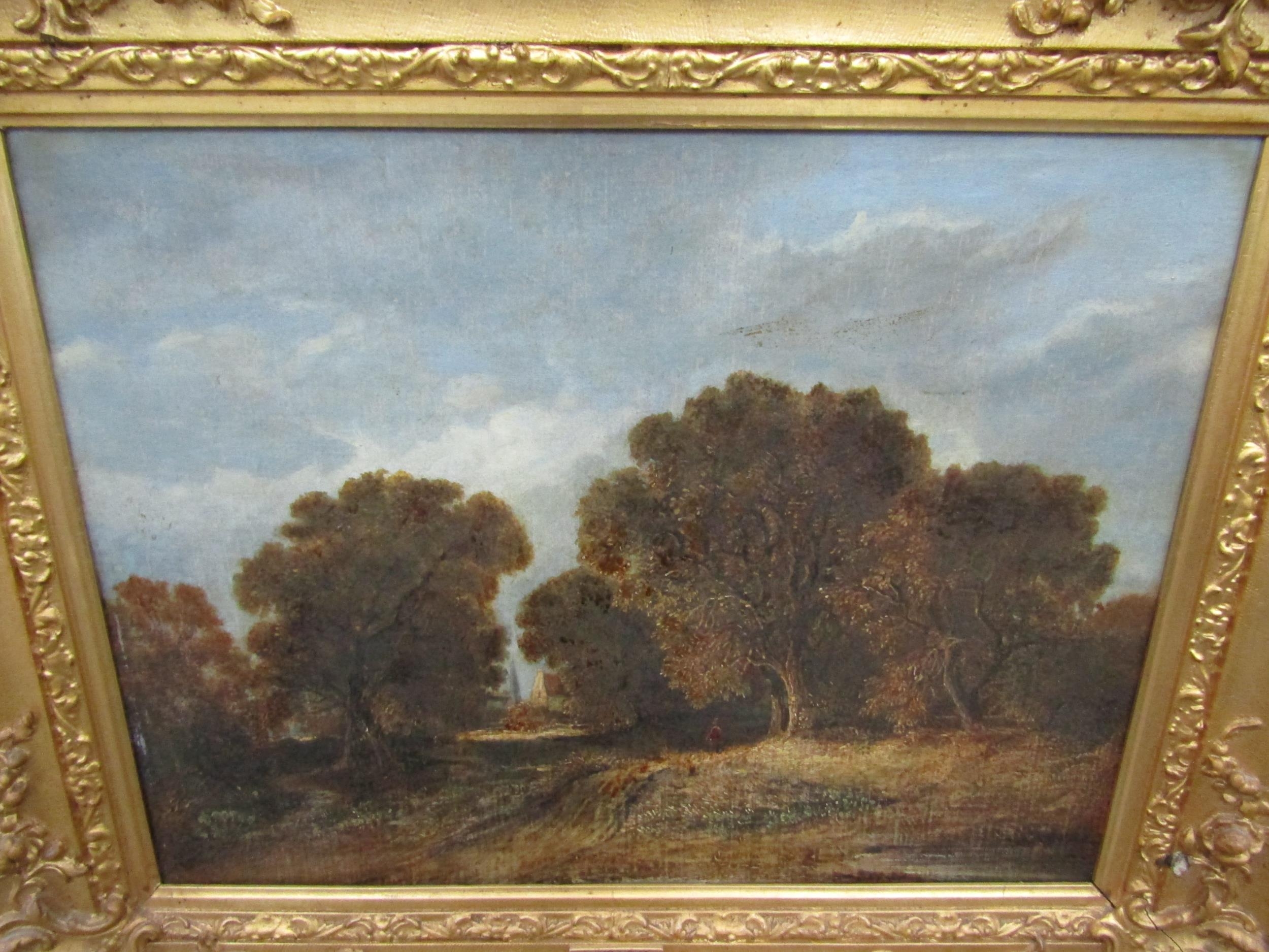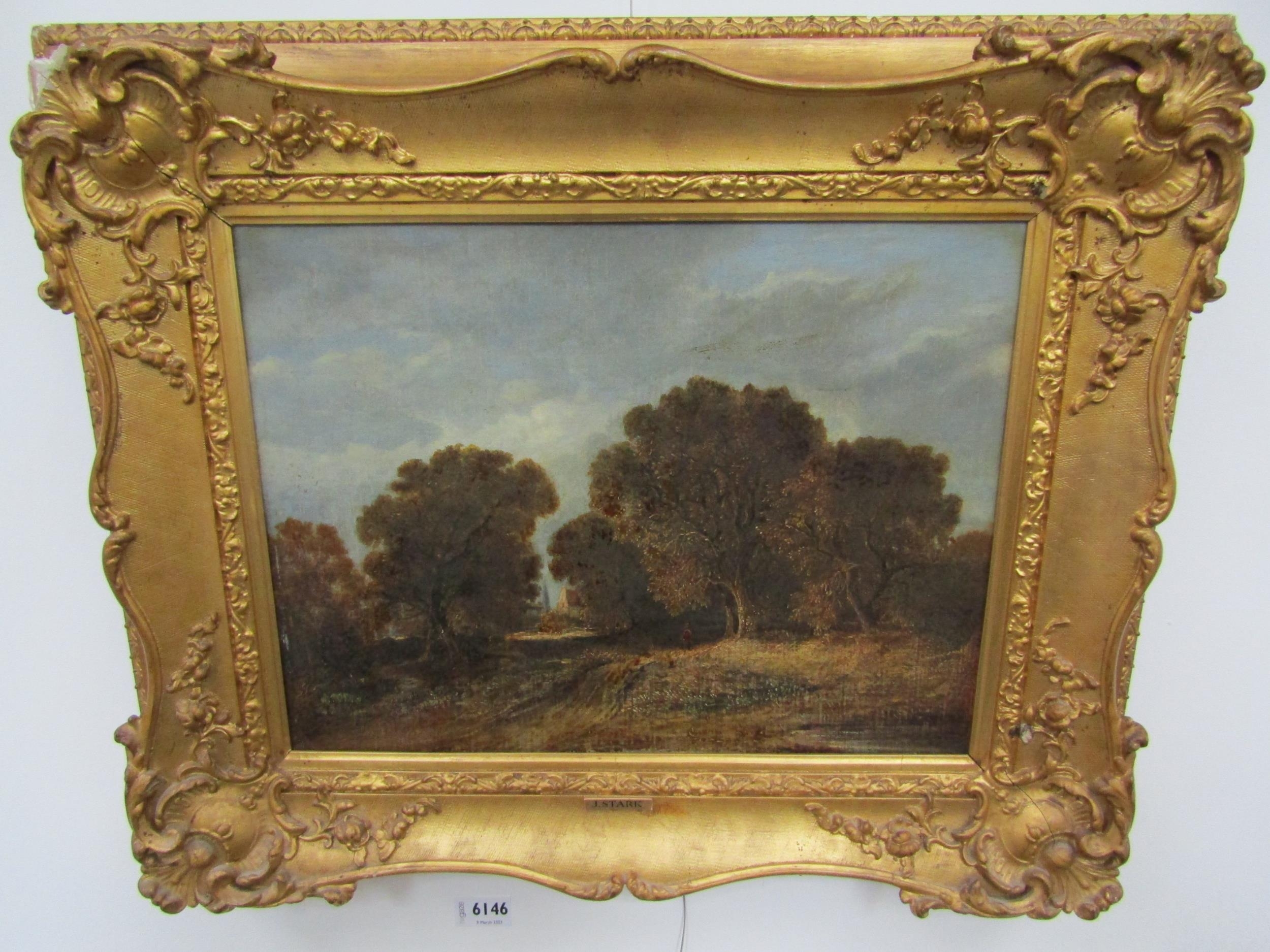 JAMES STARK (1794-1859) Figures on wooded track with spire and track to background, oil on canvas, 31cm x 41cm (possibly over cleaned) (R) £600 GALLERY