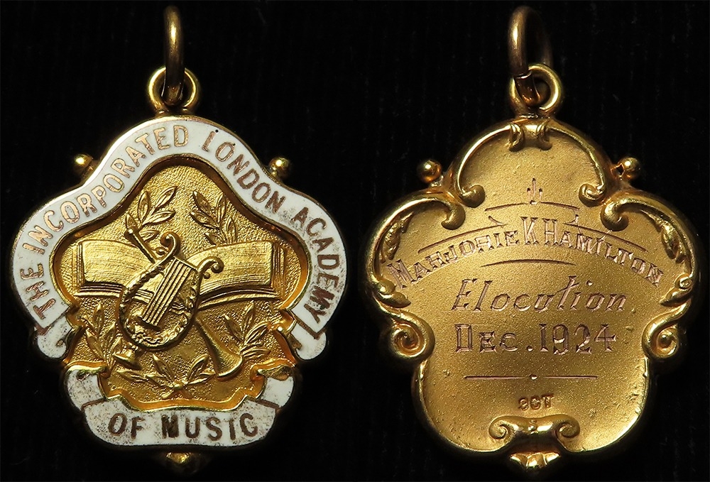 British Academic Medal, 9ct gold d.27mm, 6.97g: The Incorporated London Academy of Music / 'Marjorie K. Hamilton, Elocution Dec. 1924', EF