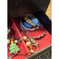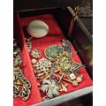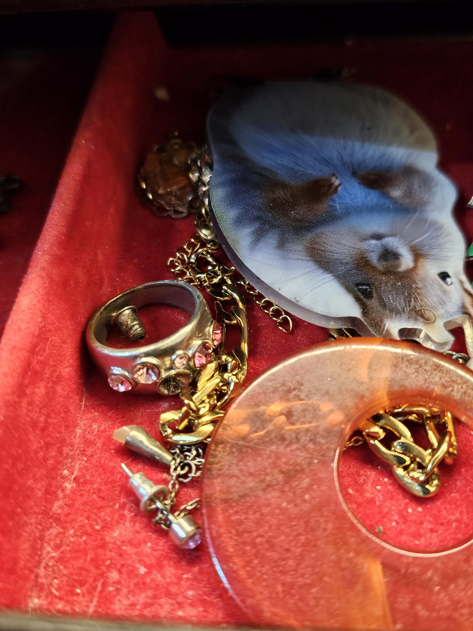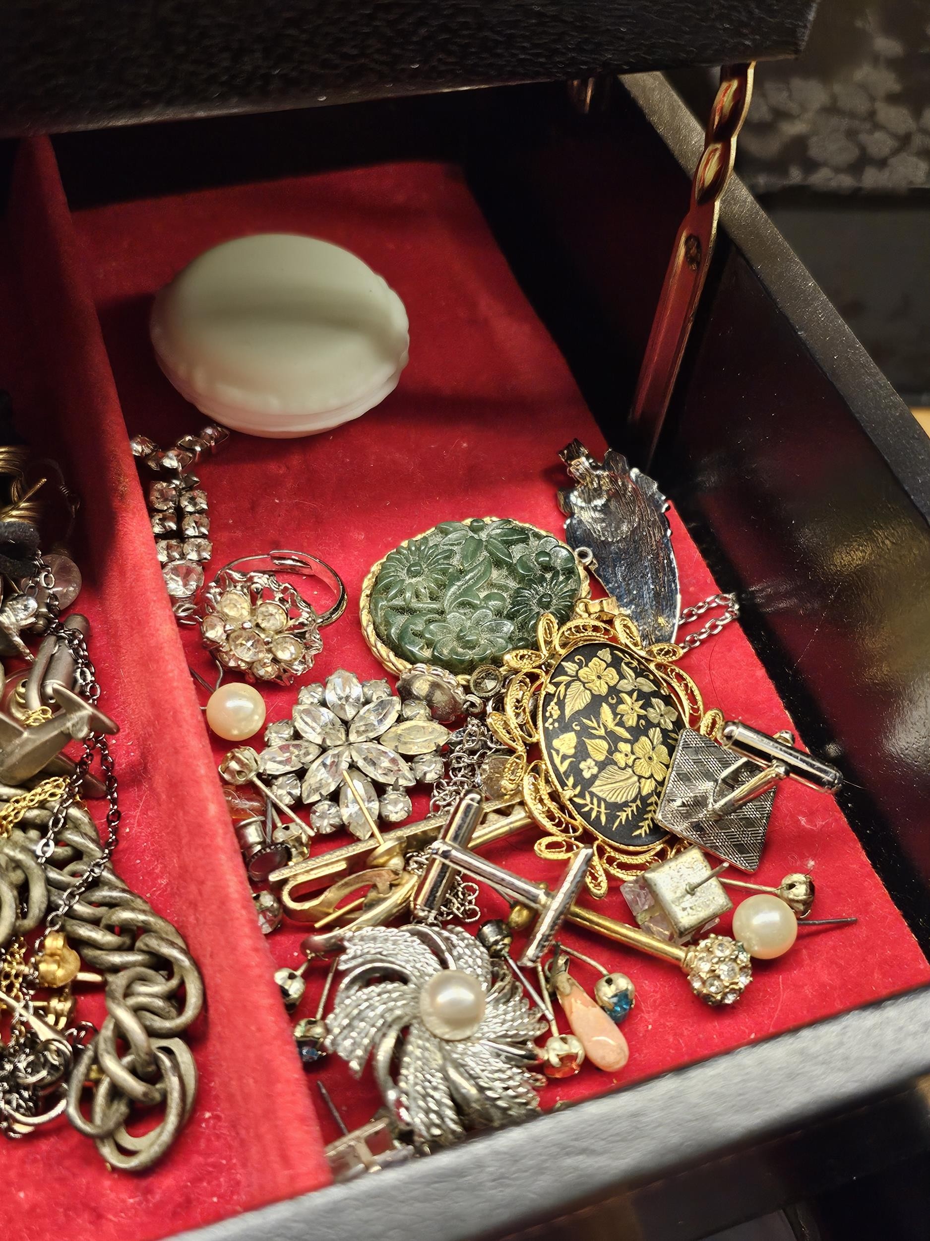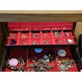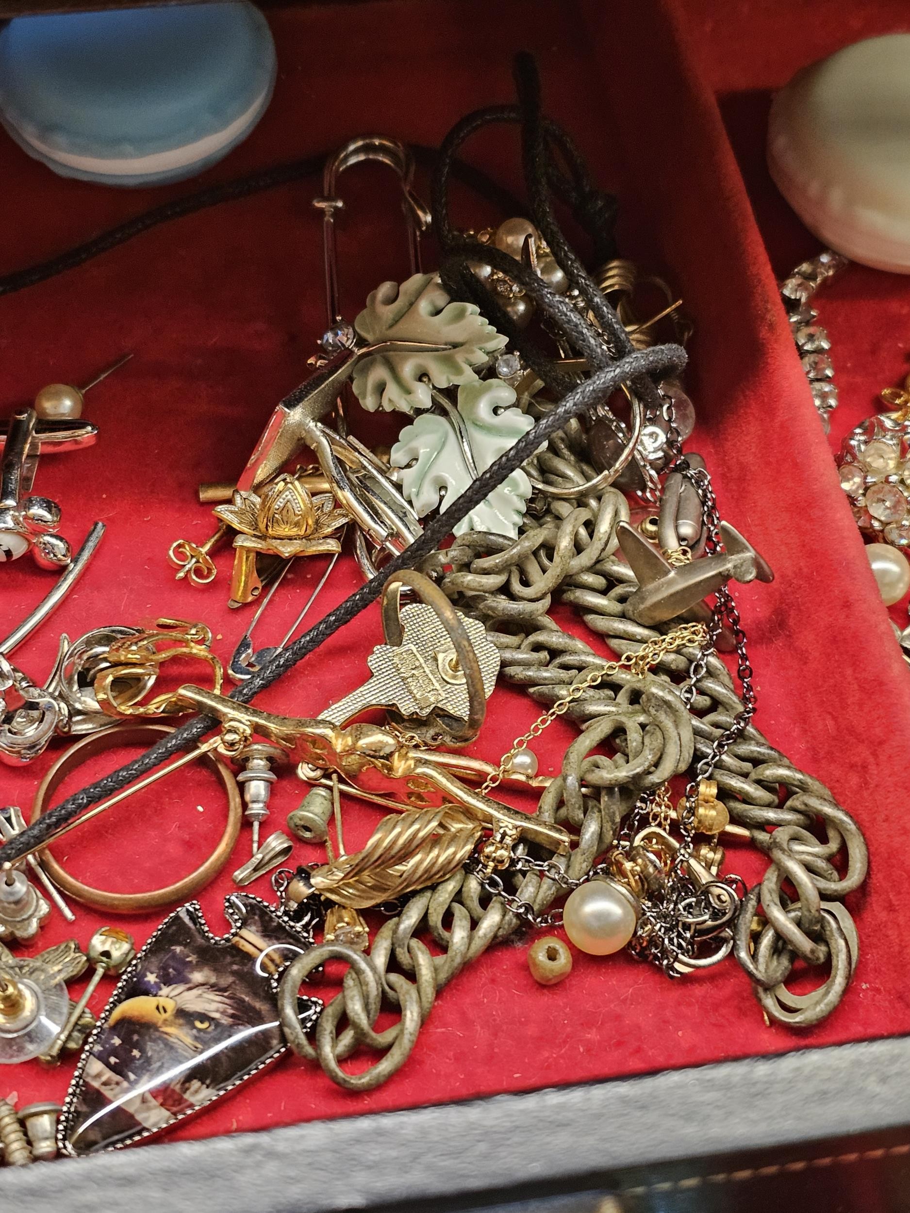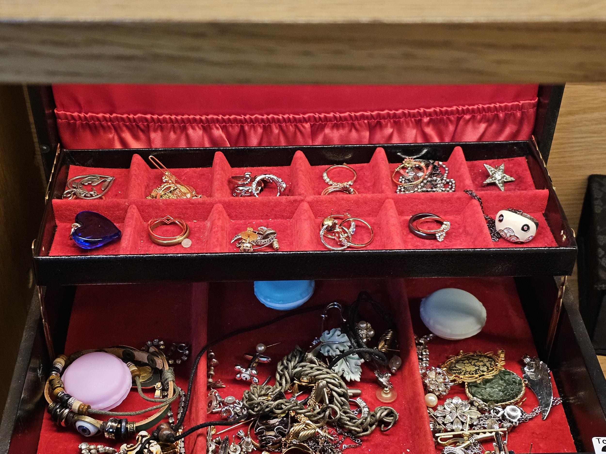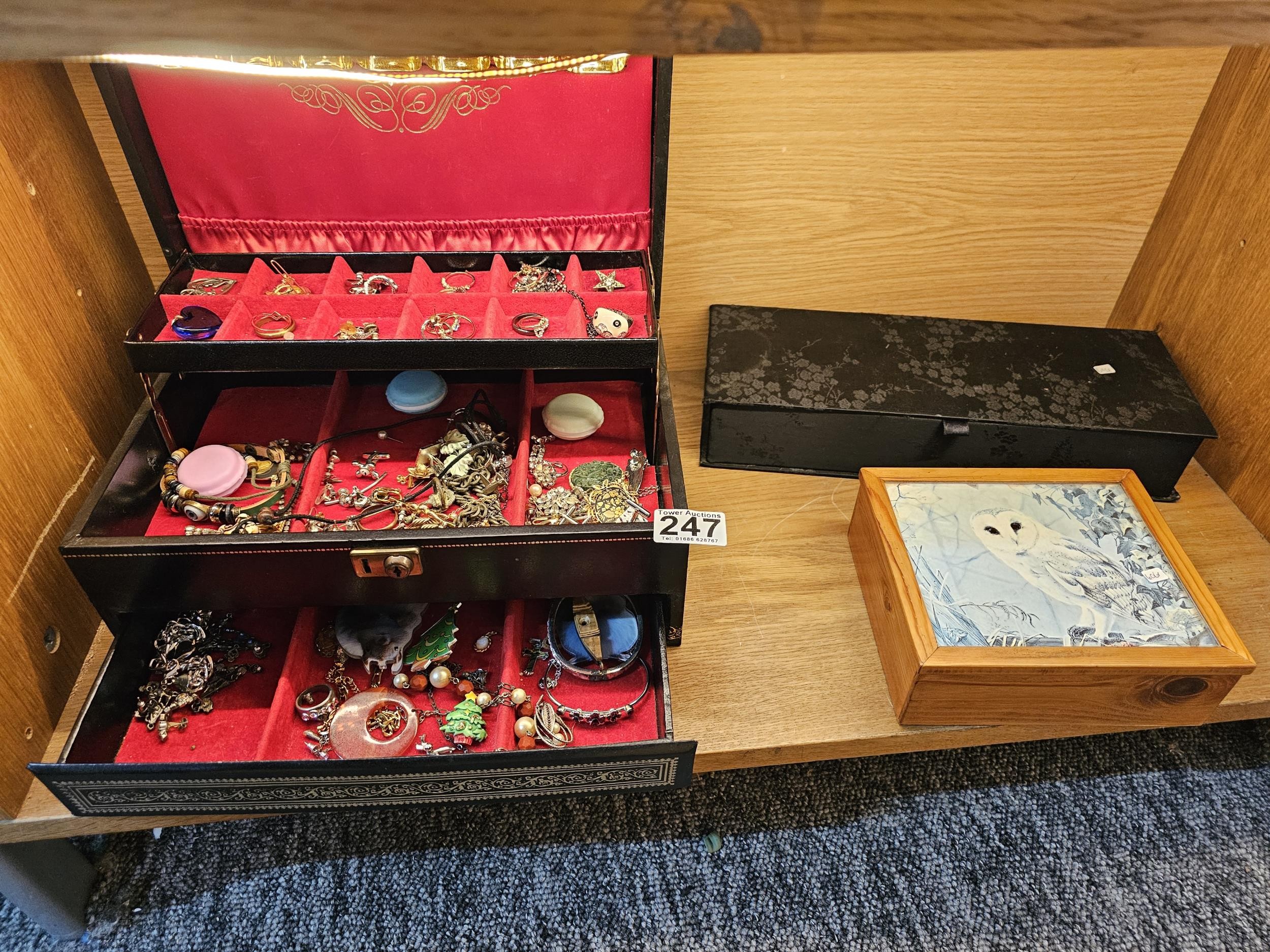 Collection of 3x jewellery boxes to include a cantilever jewellery box with three layers of assorted costume jewellery in a fitted case to include brooches, rings necklaces, bracelets of various styles and designs along with a wooden jewellery bow with a picture of an Owl to the top and one other box.