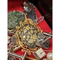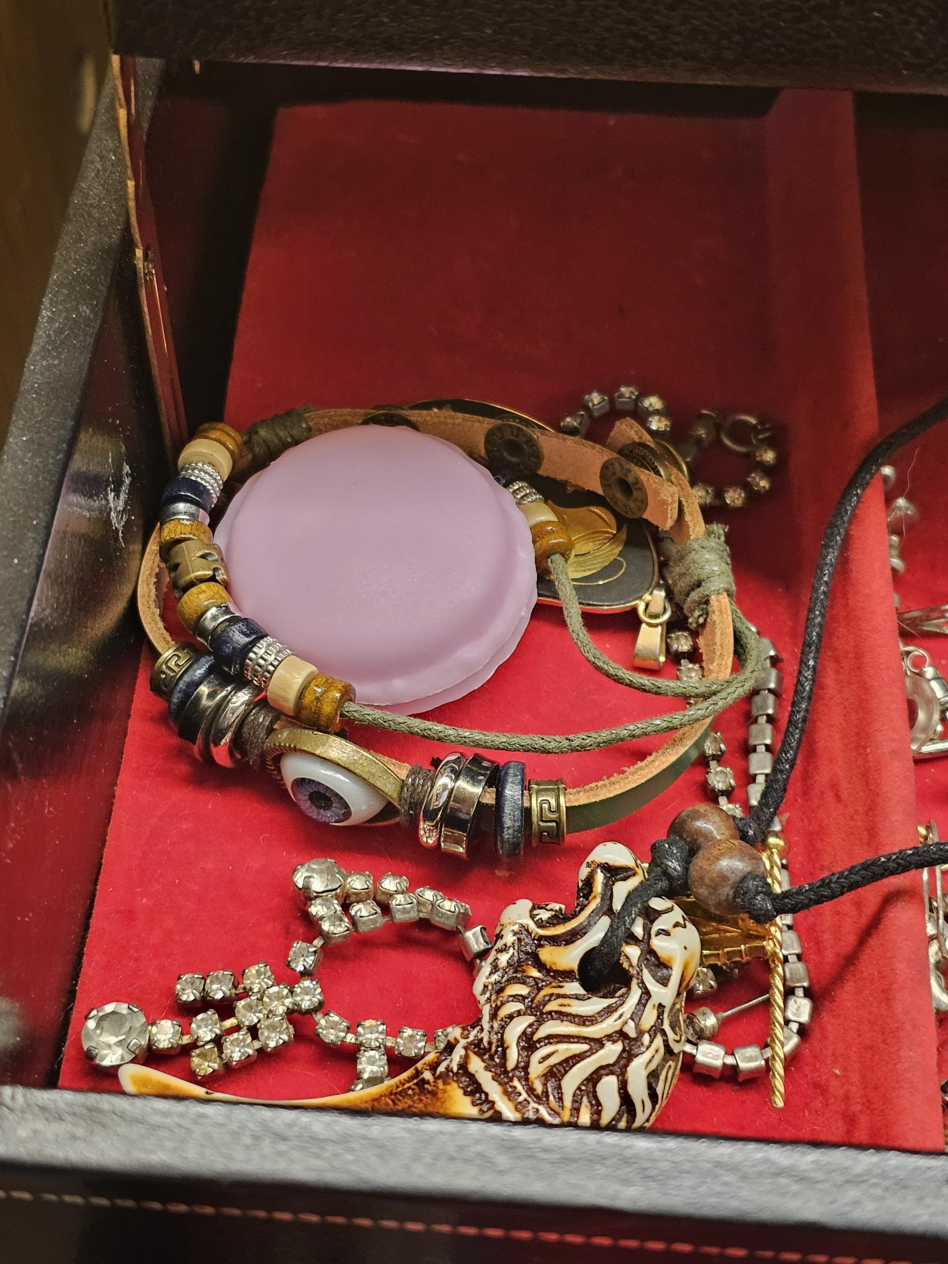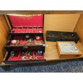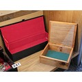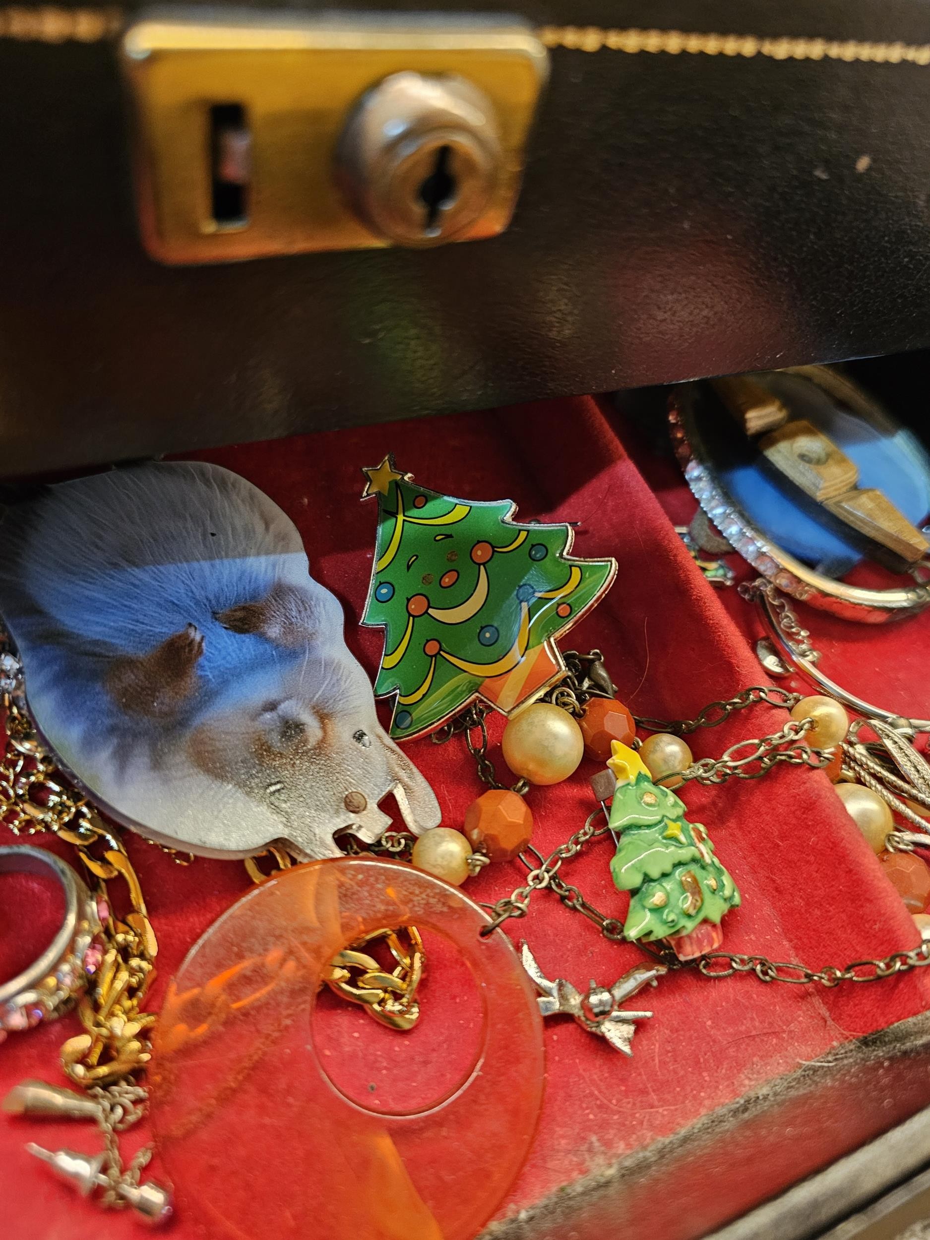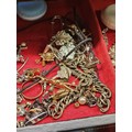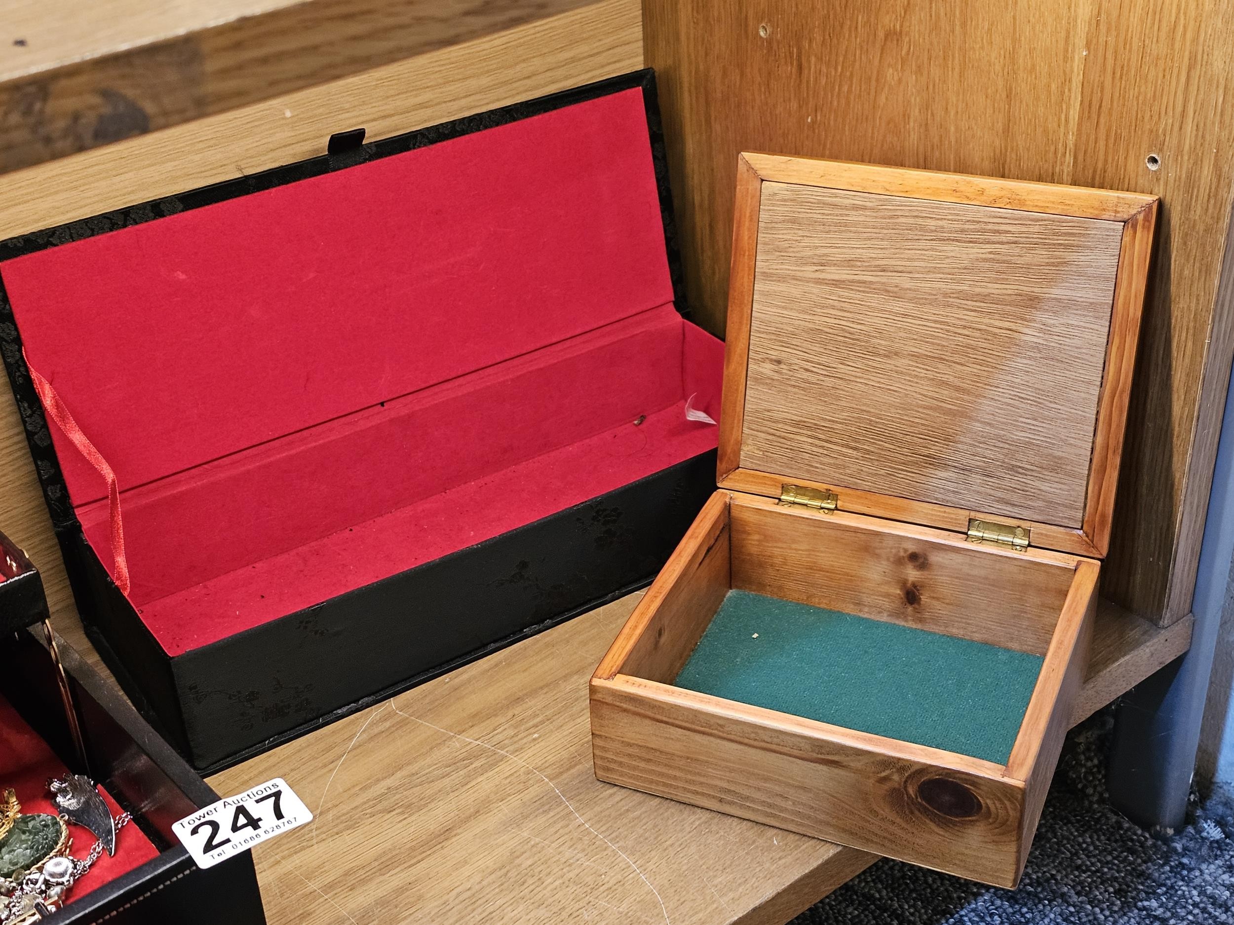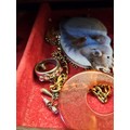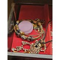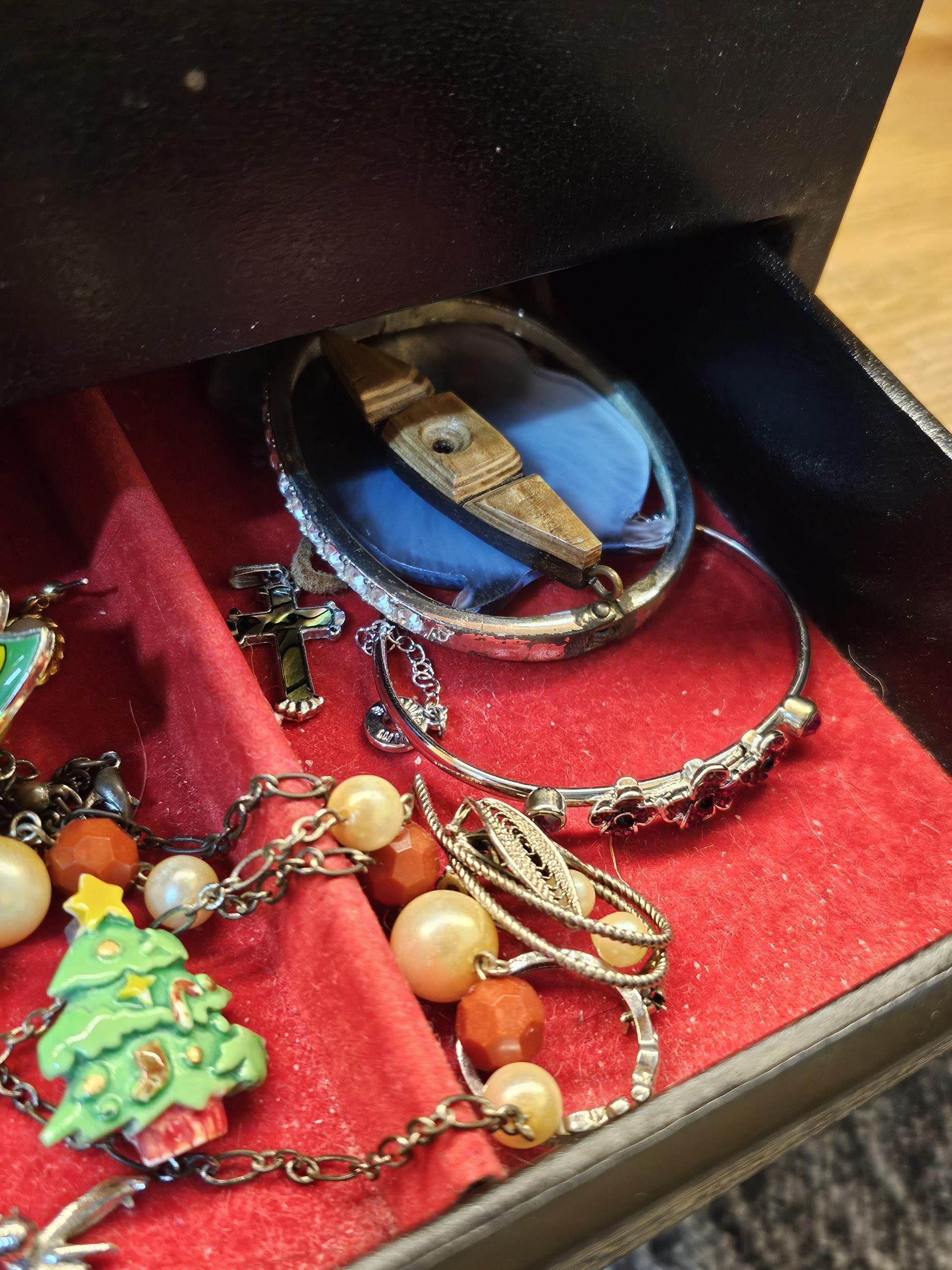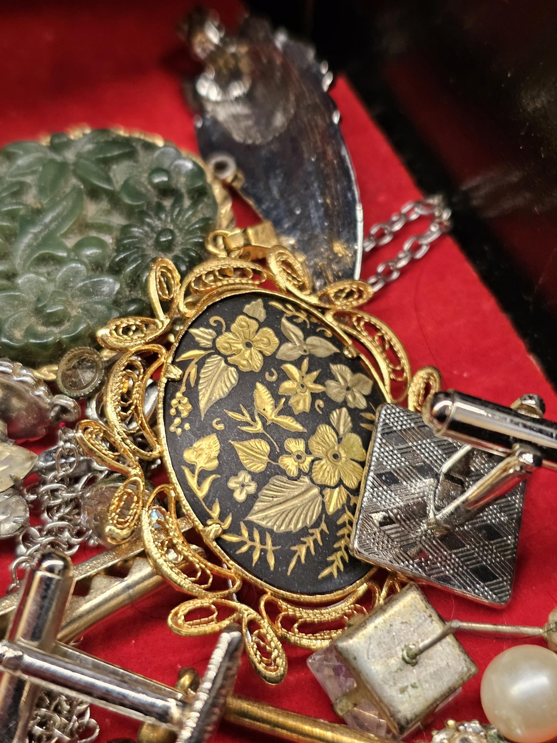 Collection of 3x jewellery boxes to include a cantilever jewellery box with three layers of assorted costume jewellery in a fitted case to include brooches, rings necklaces, bracelets of various styles and designs along with a wooden jewellery bow with a picture of an Owl to the top and one other box.