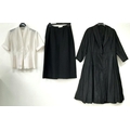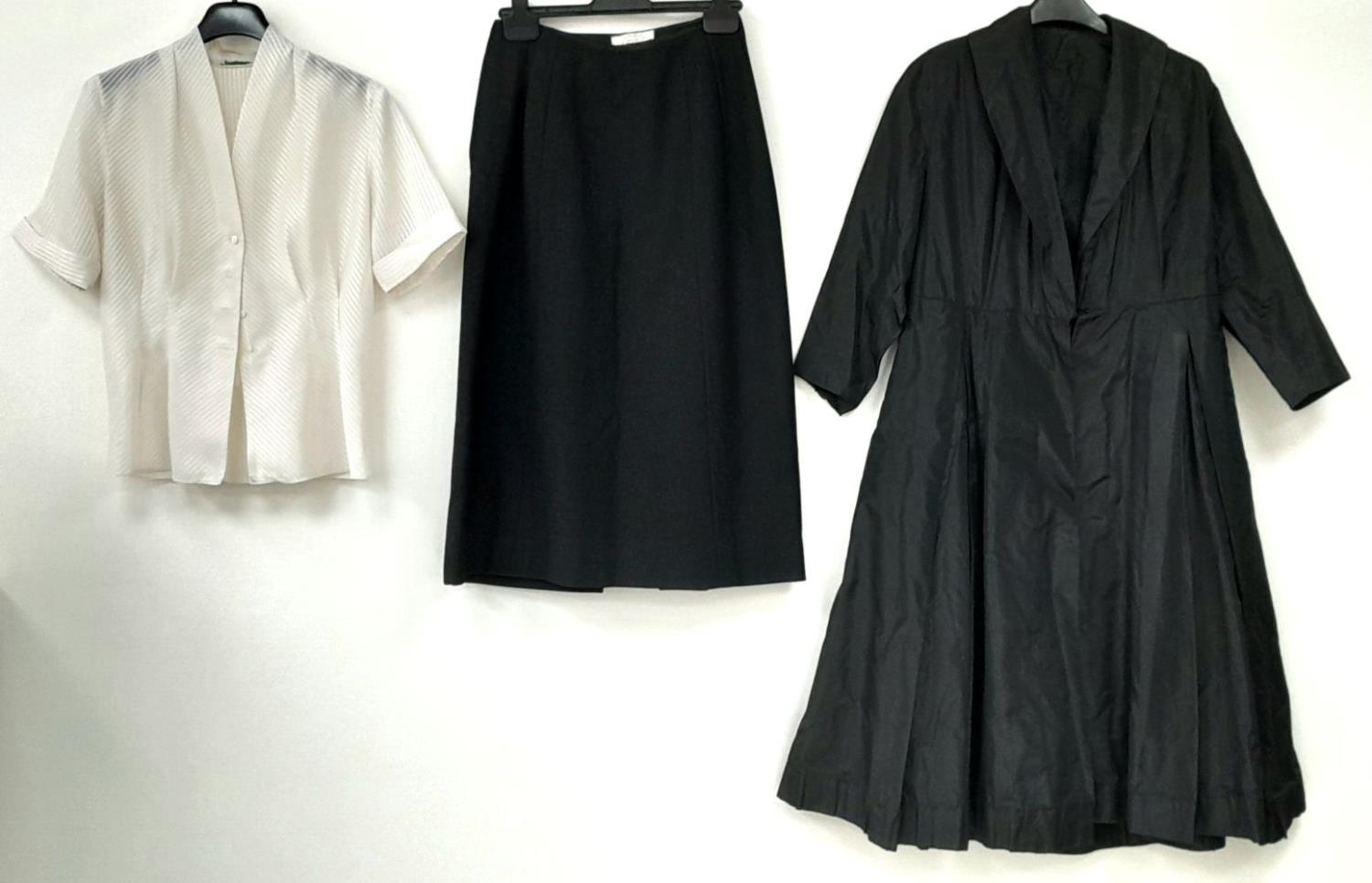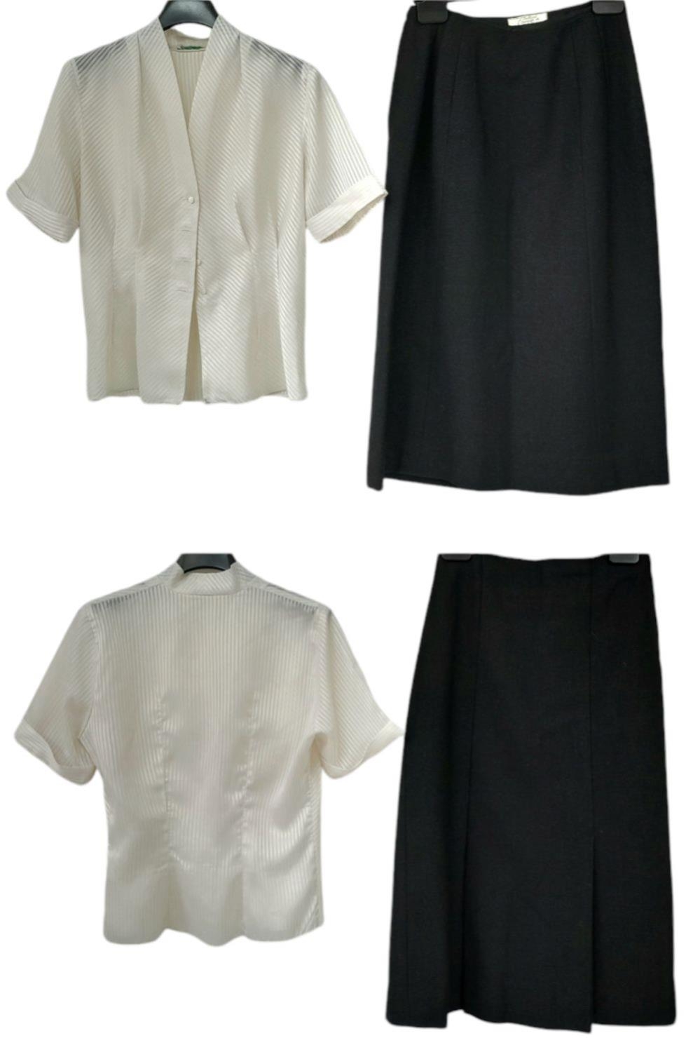 A vintage office worker outfit consisting of black midi skirt, cream floaty blouse and a Matrix style jacket. Would fit UK size 8-12. Please see photos for designs and condition.