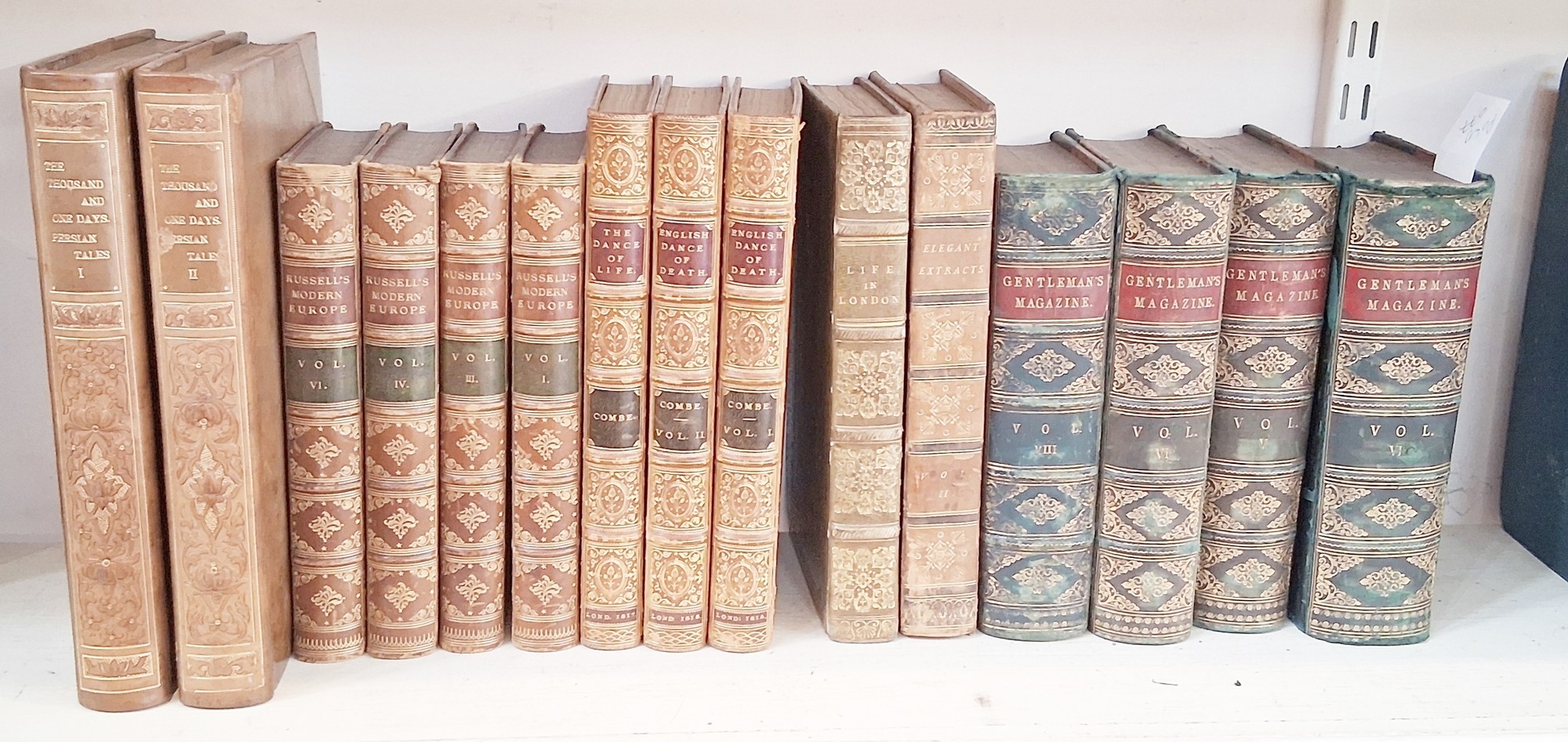 Fine bindings to include McCarthy, Justin Huntly (ed) "The Thousand and One Days, Persian Tales", frontis by Stanley L Wood, Chatto & Windus 1892, 2 vols, no.19/50 copies of this large paper edition, deckle edges, bkpl inside front board, half-calf over brown boards, gilt rules, gilt and tooled decoration to backstrip, gilt titles, "Russell's Modern Europe", vols 1, 3, 4 and 6 only, half-leather, Coombe "The Dance of Life, a Poem by the author of Dr Syntax", with coloured engravings by Thomas Rowlandson, R Akerman (1817), half-title with colour vignette, colour frontis with tissue guard, colour plates, full calf, gilt titles, raised bands, pastedown titles, uniform with "English Dance of Death", 2 vols, uniformly bound and six other volumes