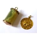 Embossed with a lion, together with a 9ct charm containing an old £1 note.