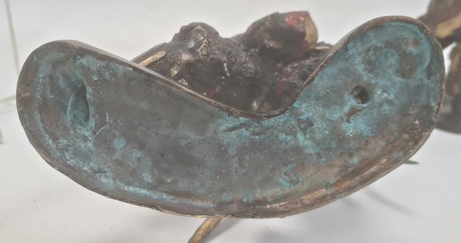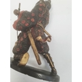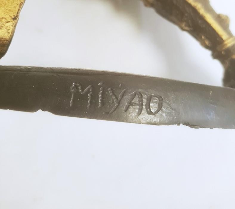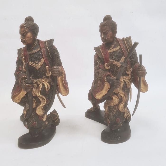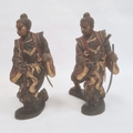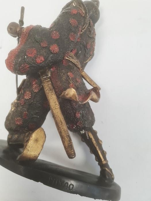 Pair of Japanese bronze figures of warriors after Miyao Eisuke of Yokohama holding multiple weapons and with painted and gilded decoration, 28cm high (2)