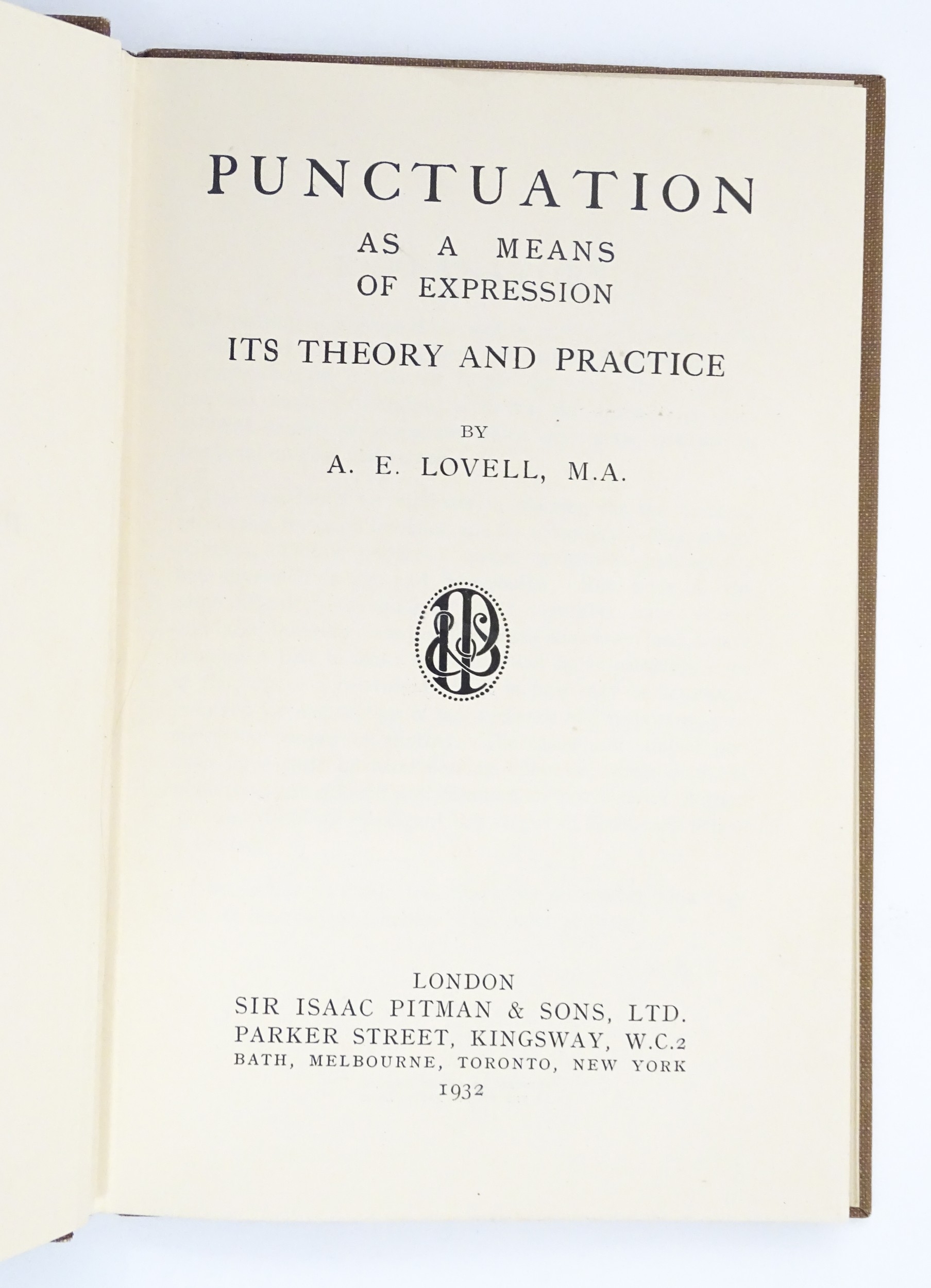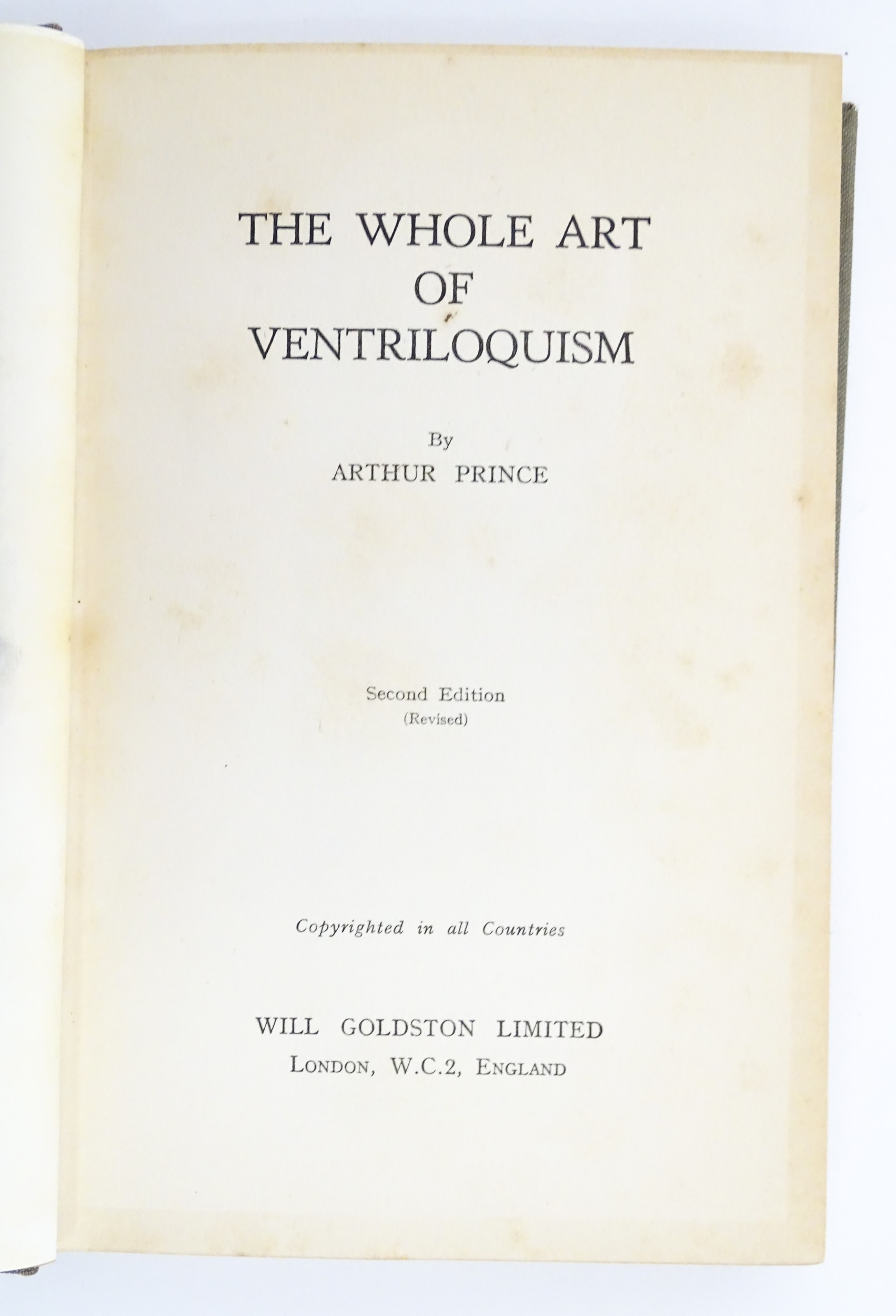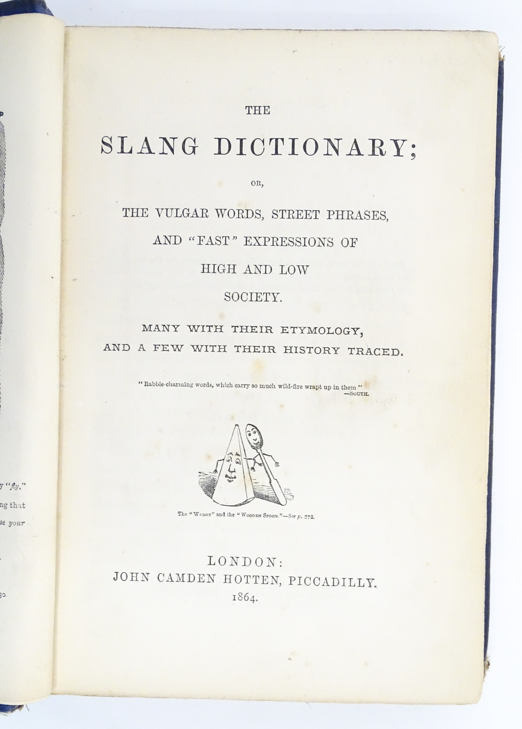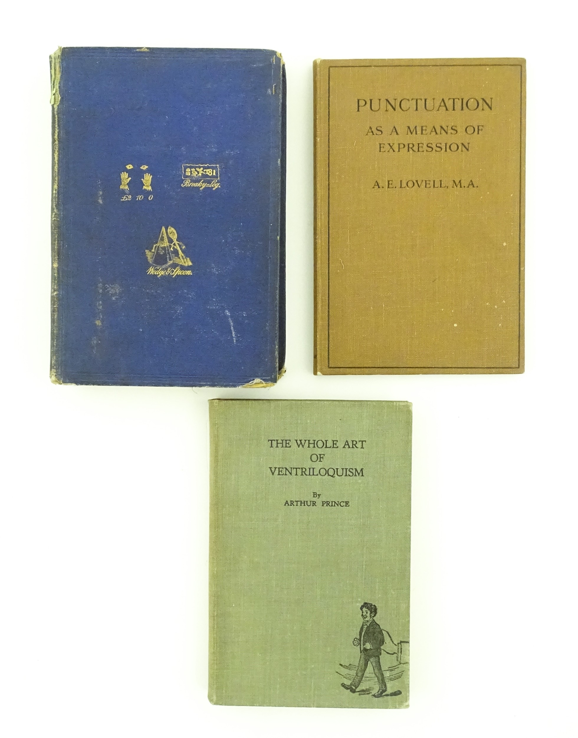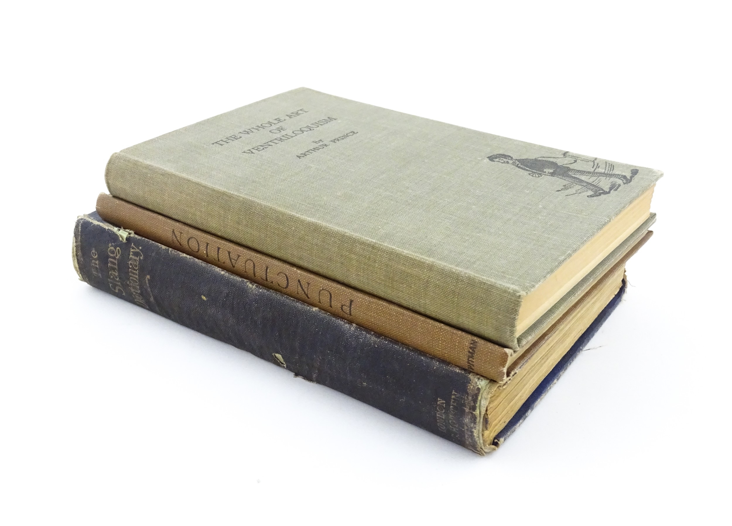 Books: Three books comprising The Slang Dictionary; or, the Vulgar Words, Street Phrases, and "Fast" Expressions of High and Low Society Many with their Etymology, and a few with their History Traced, 1864; Punctuation as a means of Expression by A. E. Lovell, 1932, and The Whole Art of Ventriloquism, by Arthur Prince, c. 1920 (3)