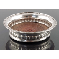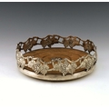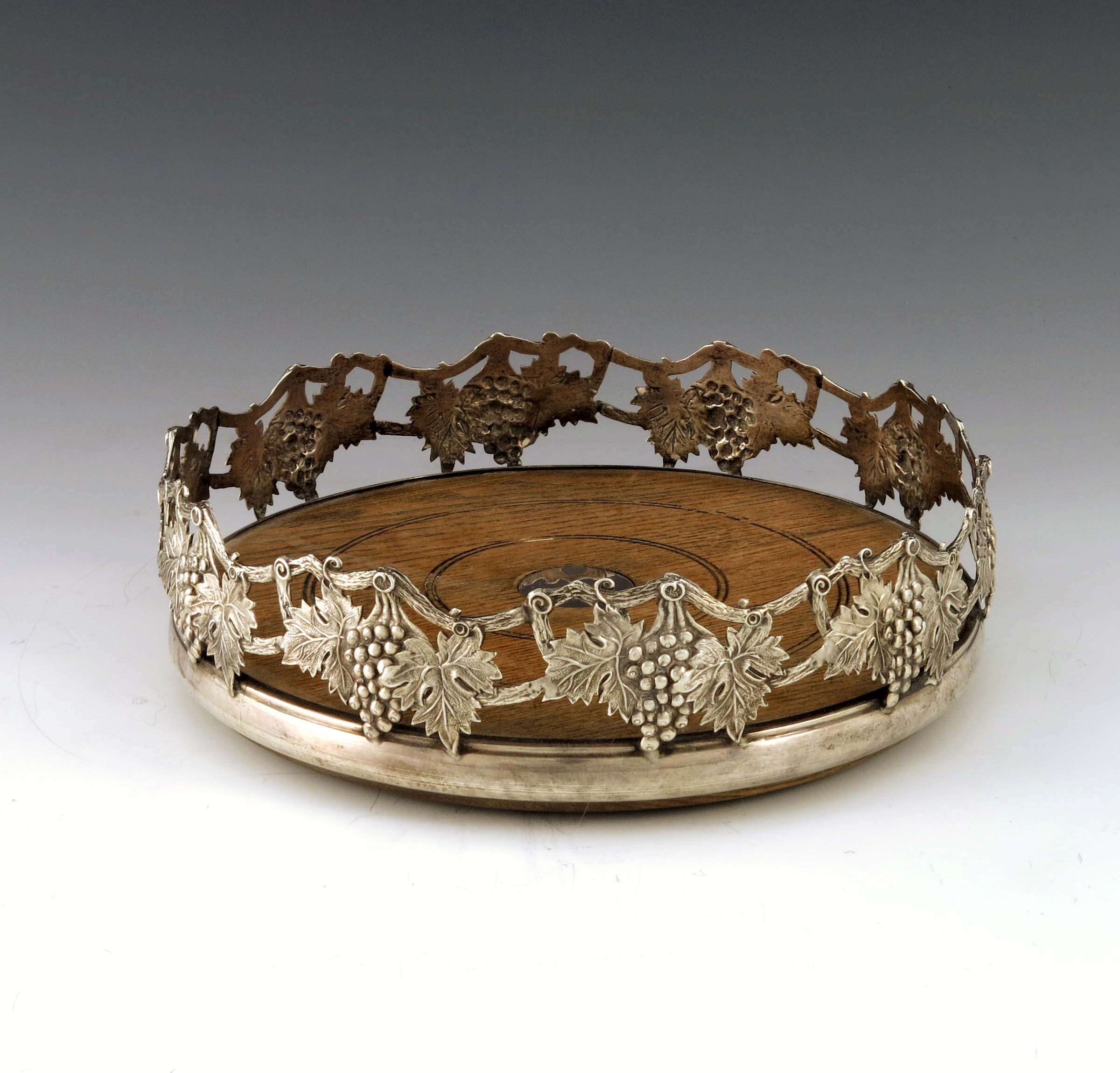 A large Elizabeth II silver wine coaster, Barrowclift Silvercraft, Birmingham 1987, reticulated and cast grape vine trellis design, on oak base, 20cm diameter