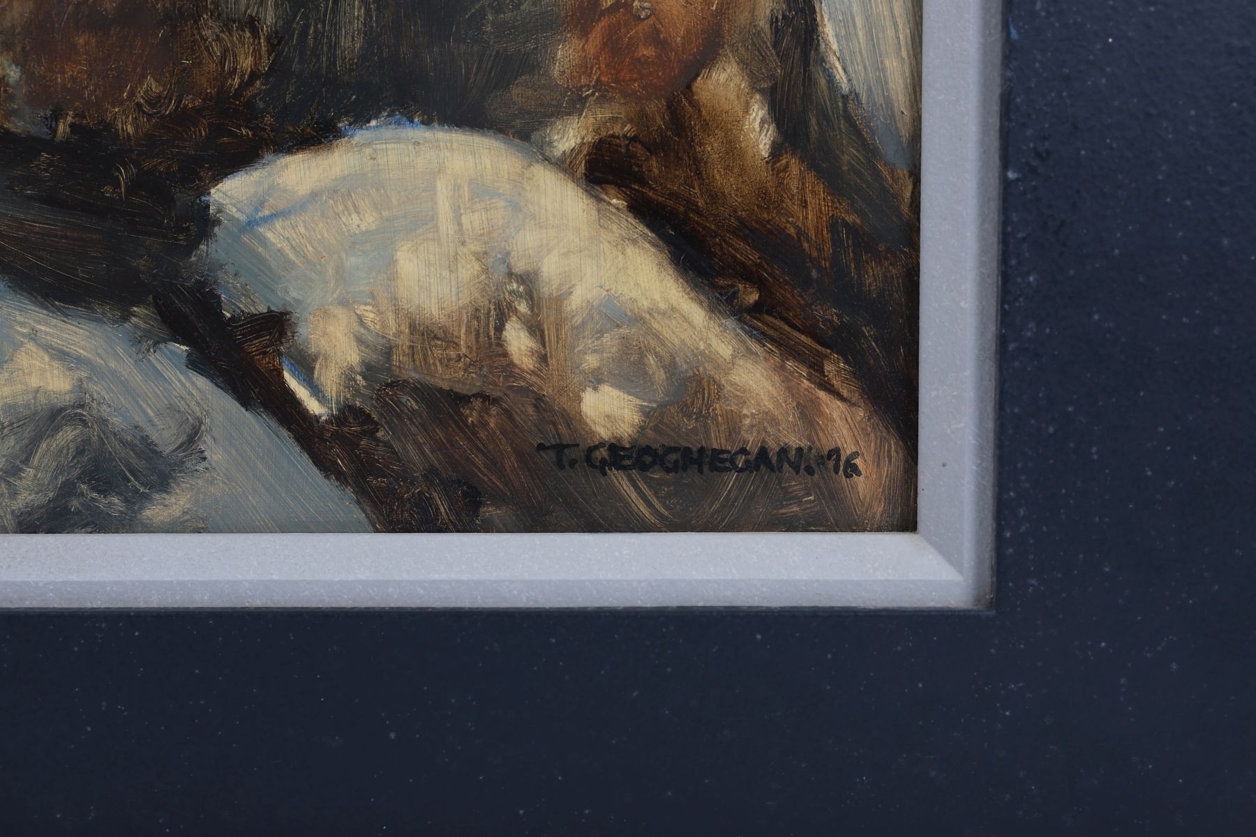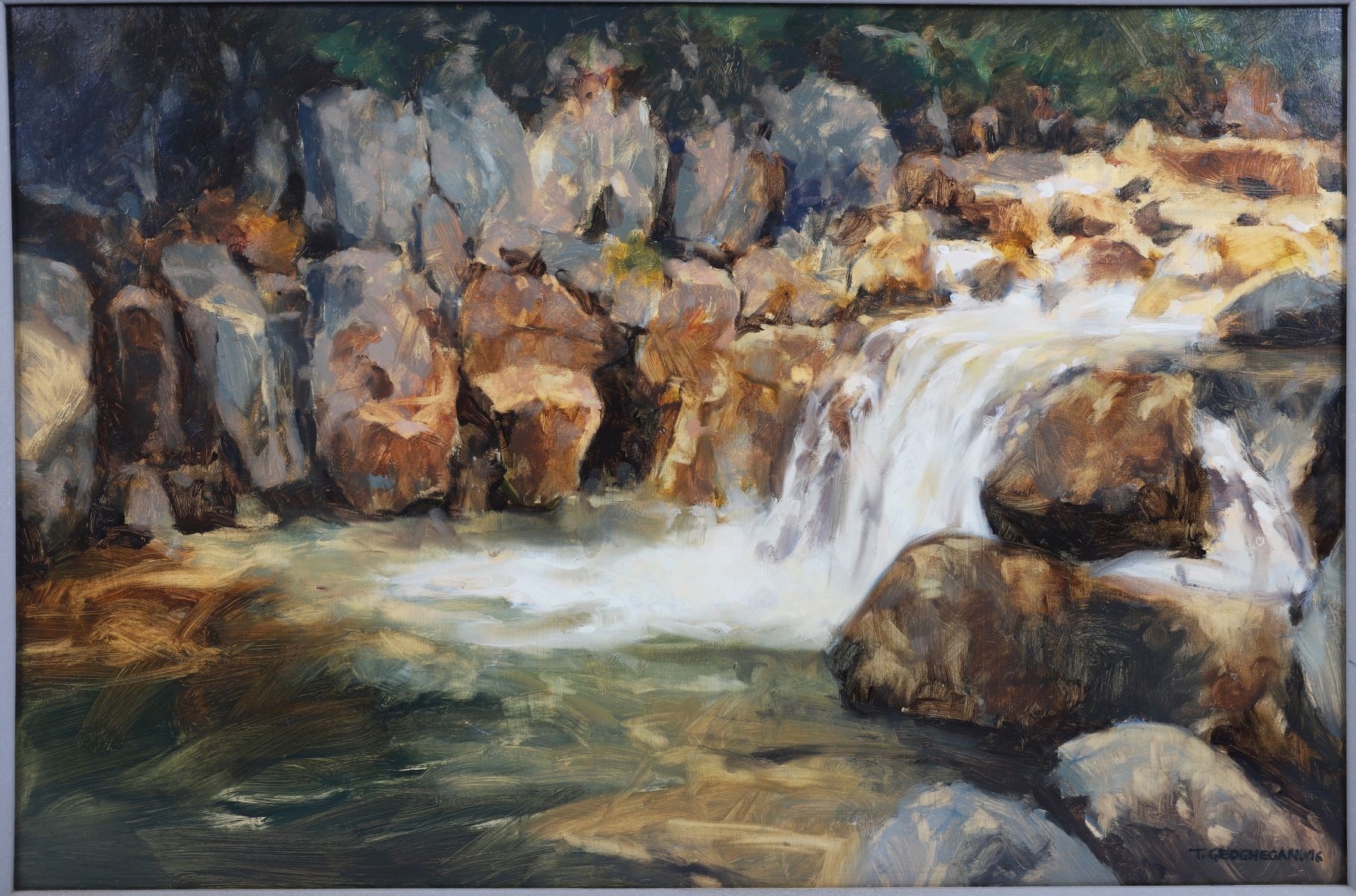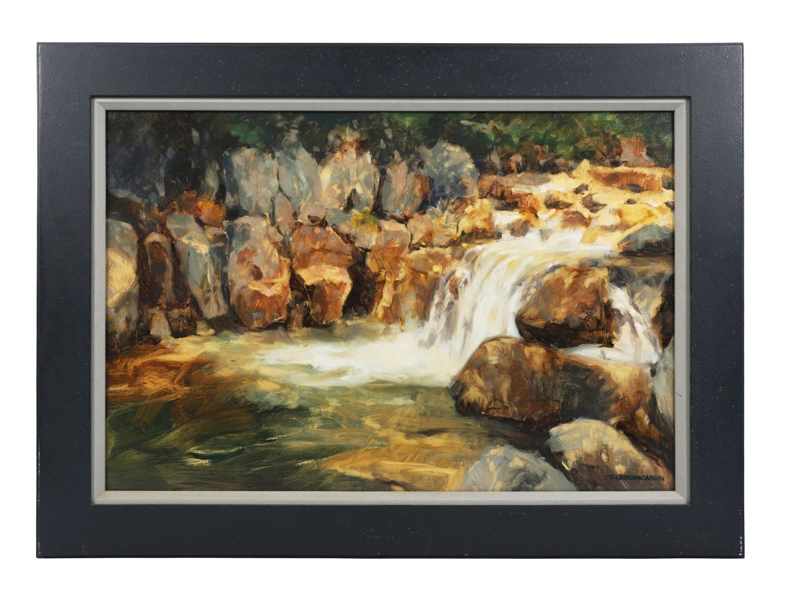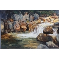 A richly atmospheric landscape in which Geoghegan captures the luminous movement of water tumbling through a rocky pool. The artist’s vigorous brushwork and glowing palette convey the shifting reflections, submerged tones, and crystalline clarity of the stream. Textural contrasts between rugged stone and fluid water demonstrate Geoghegan’s mastery in rendering natural drama 50 x 75 cm. Framed: 66 x 92 cm. PICTURES AND PRINTS Thursday 11th December 2025 19:05:20